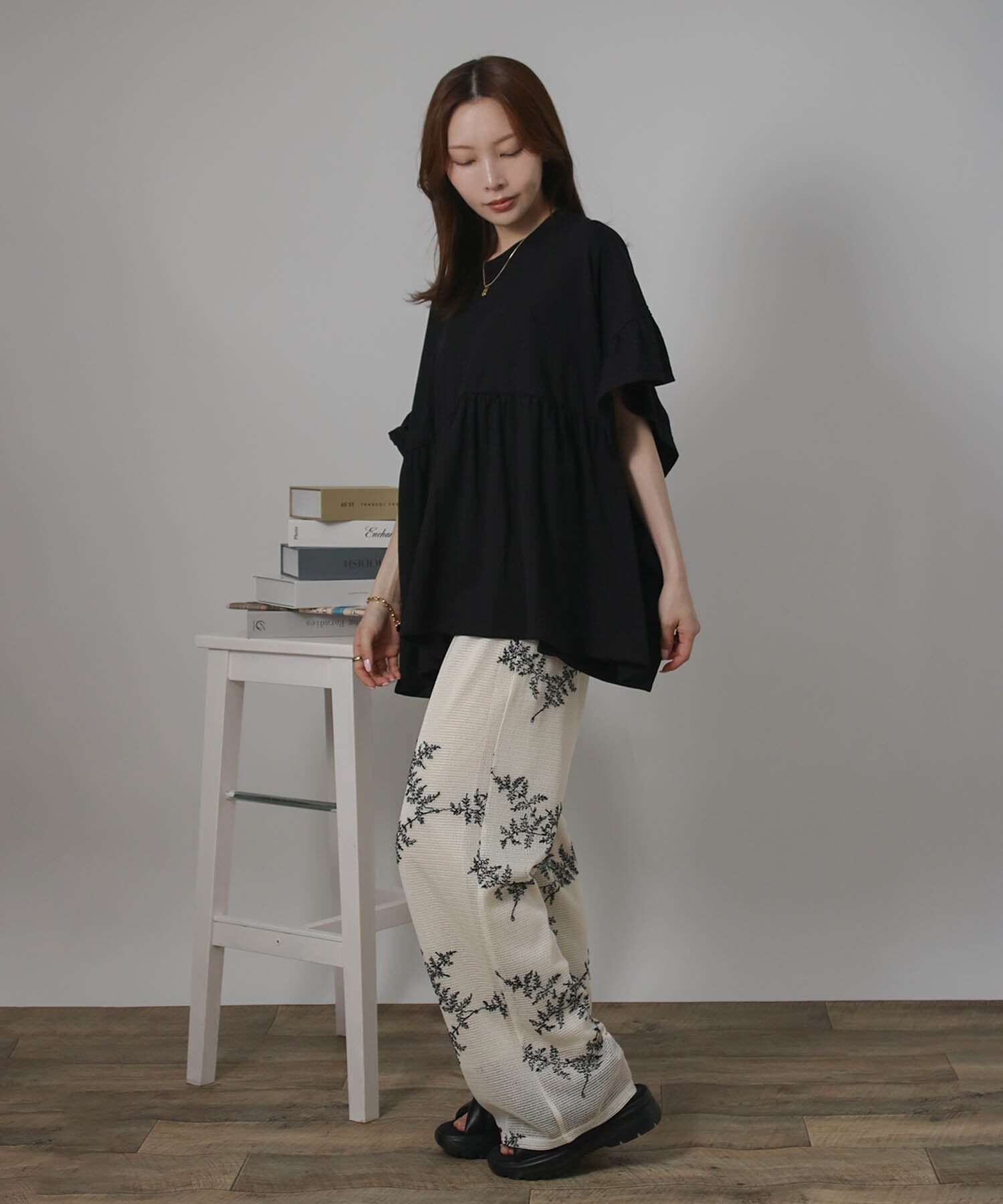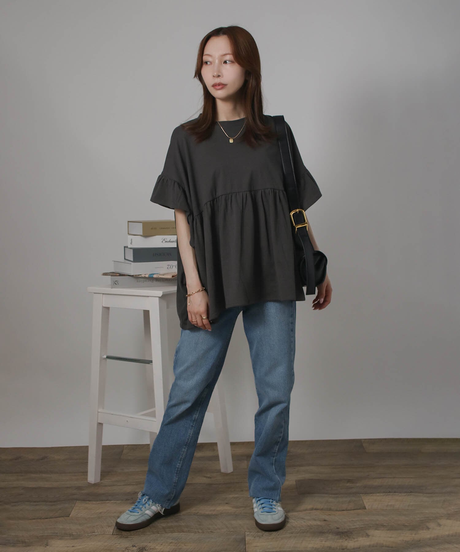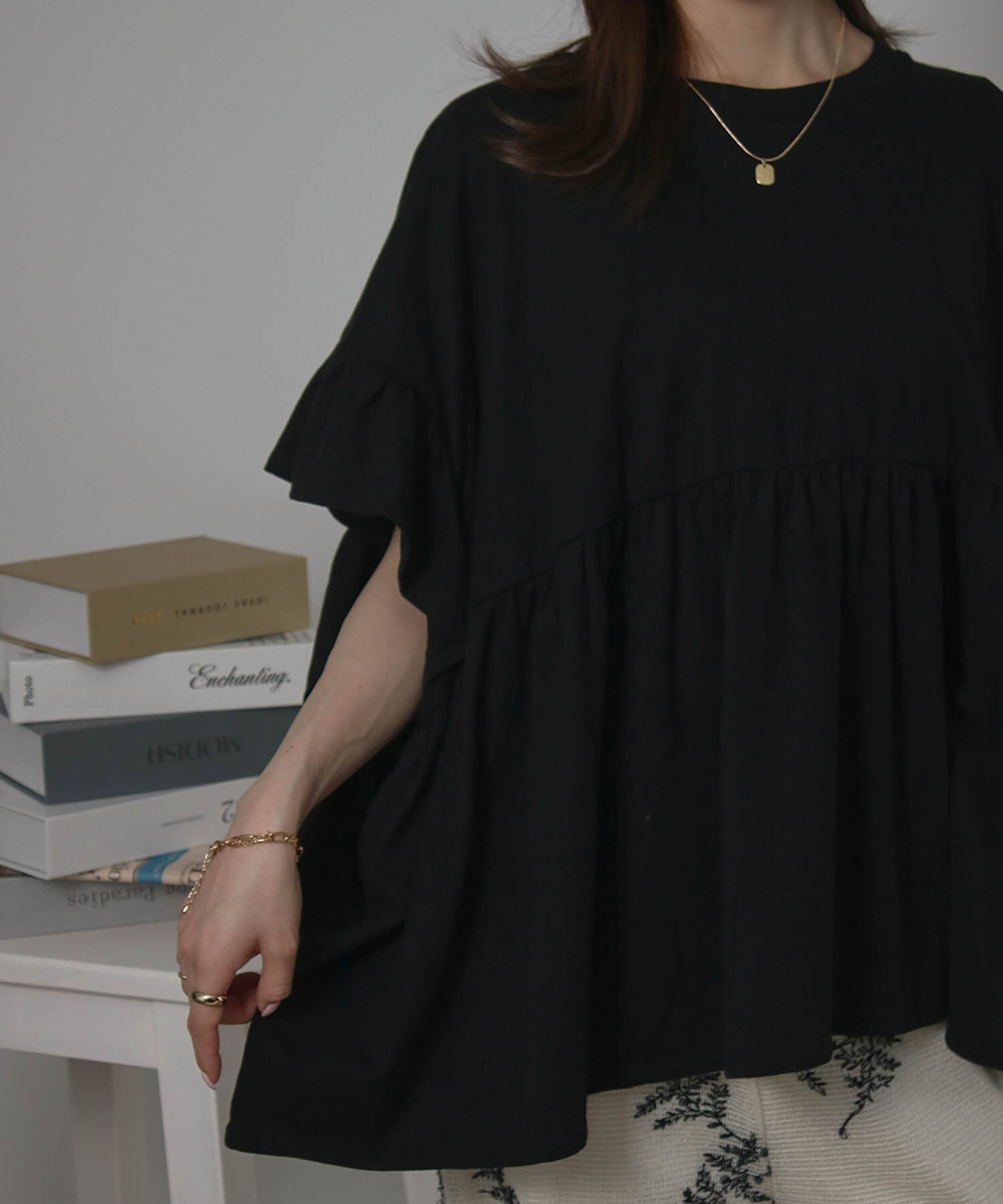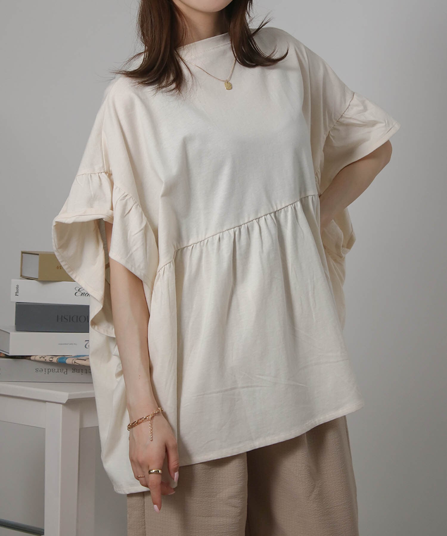 身頃はゆったりとした作りですが、胸下にギャザー切り替えをプラスすることでメリハリが生まれ、スタイルアップ効果も◎動くたびに軽やかに揺れるデザインで女性らしさをグッと引き立ててくれます。