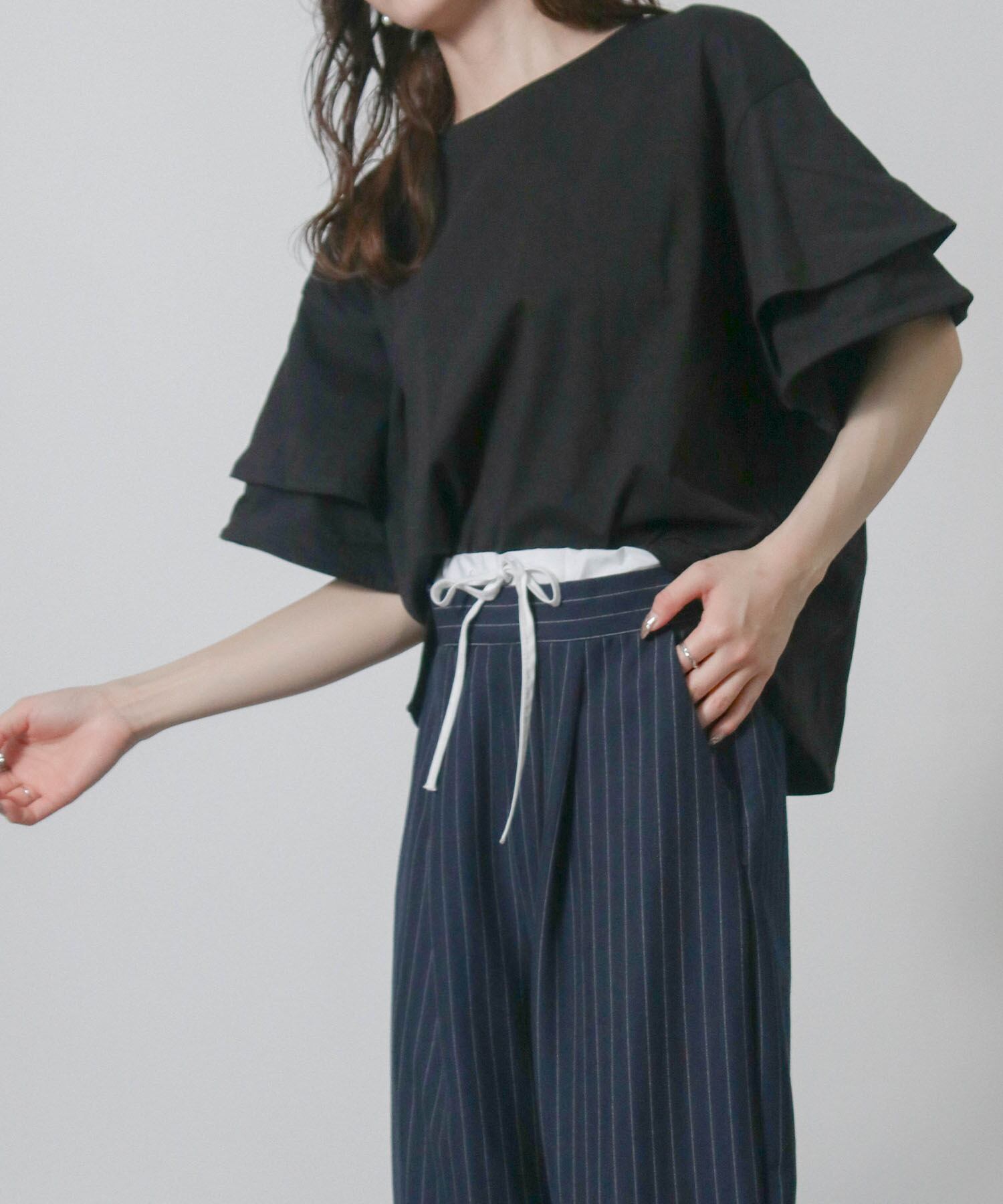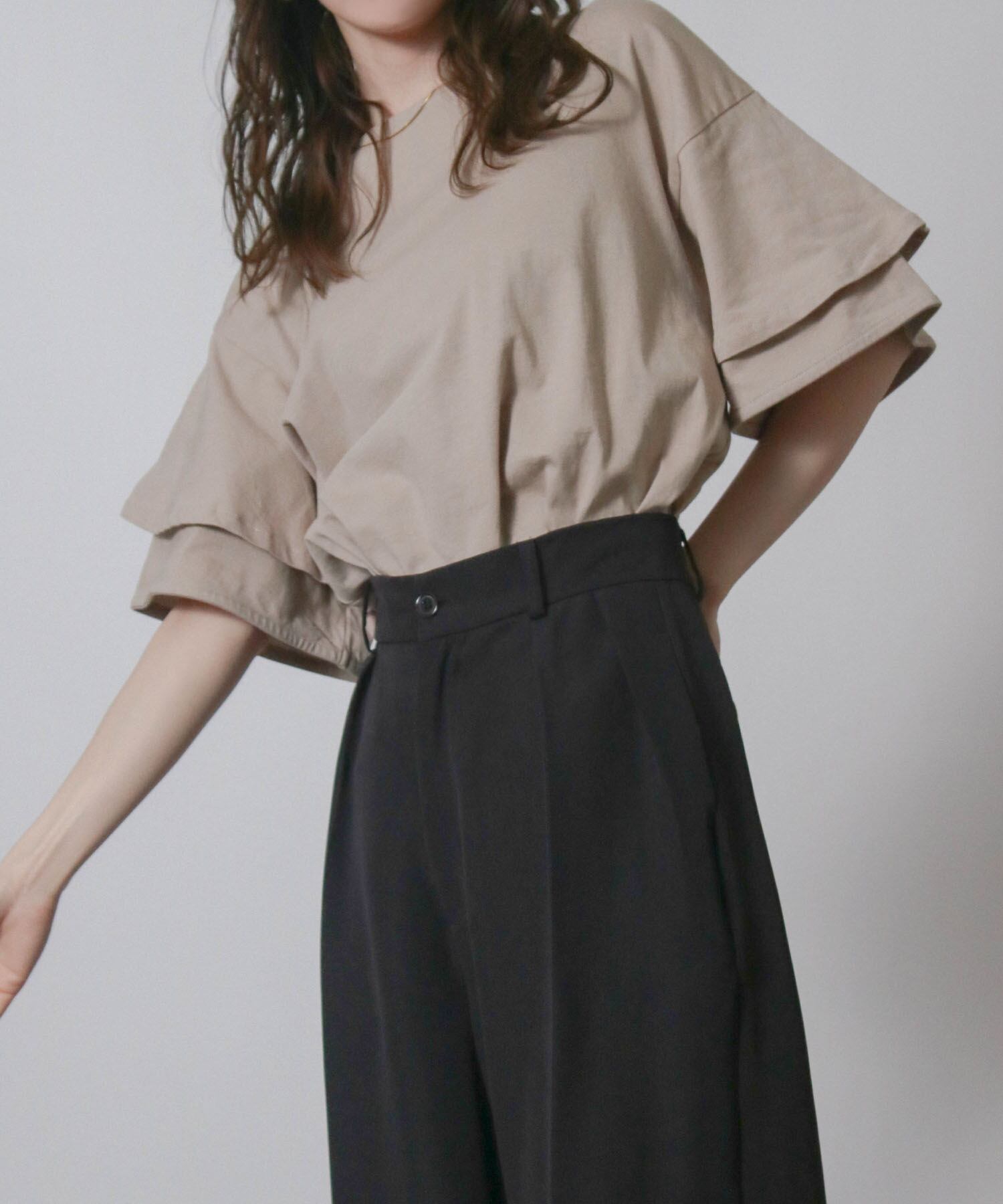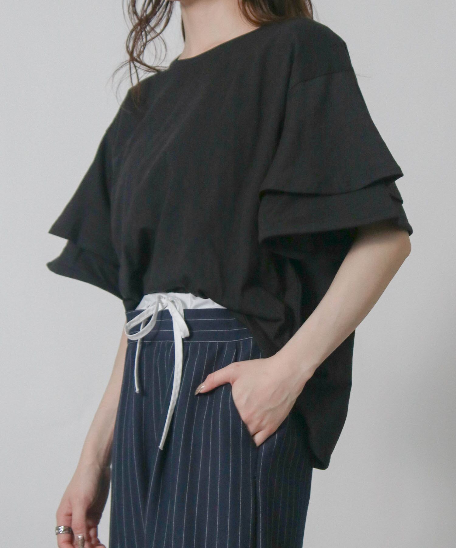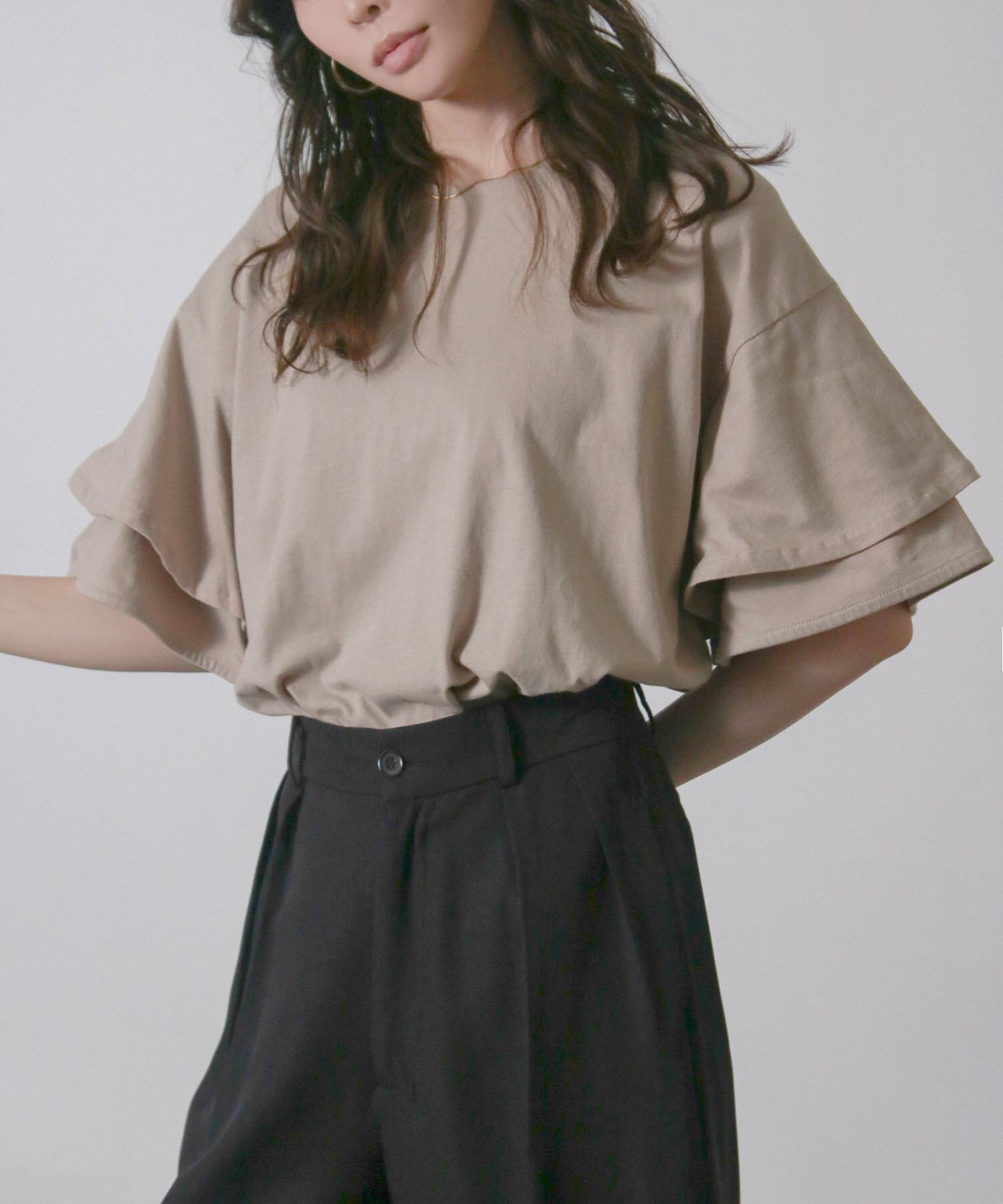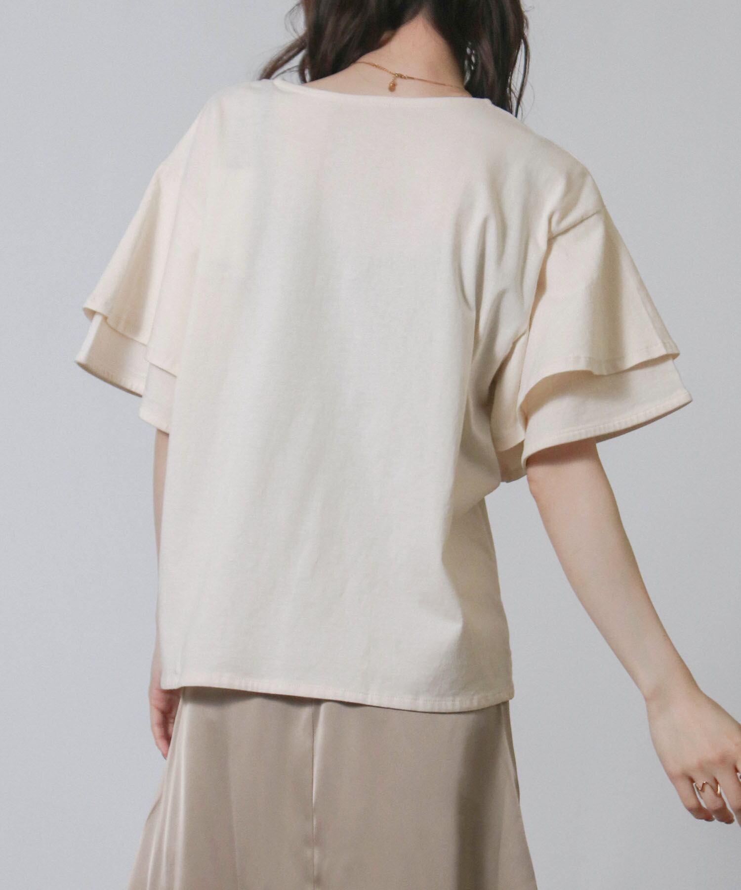 フリルスリーブが女性らしさを引き立てエレガントな印象に、二の腕をさりげなくカバーしてくれるため気になる部分を気にせず着こなせます。