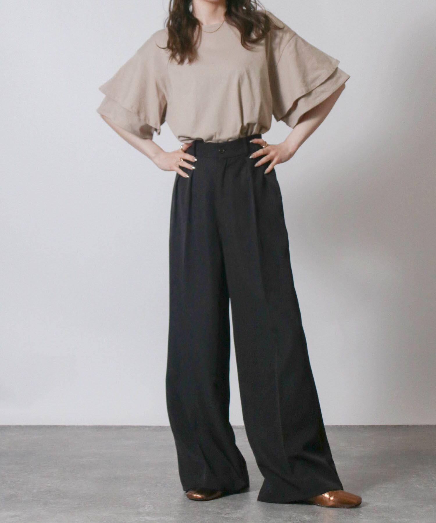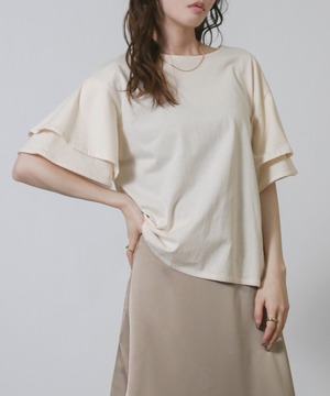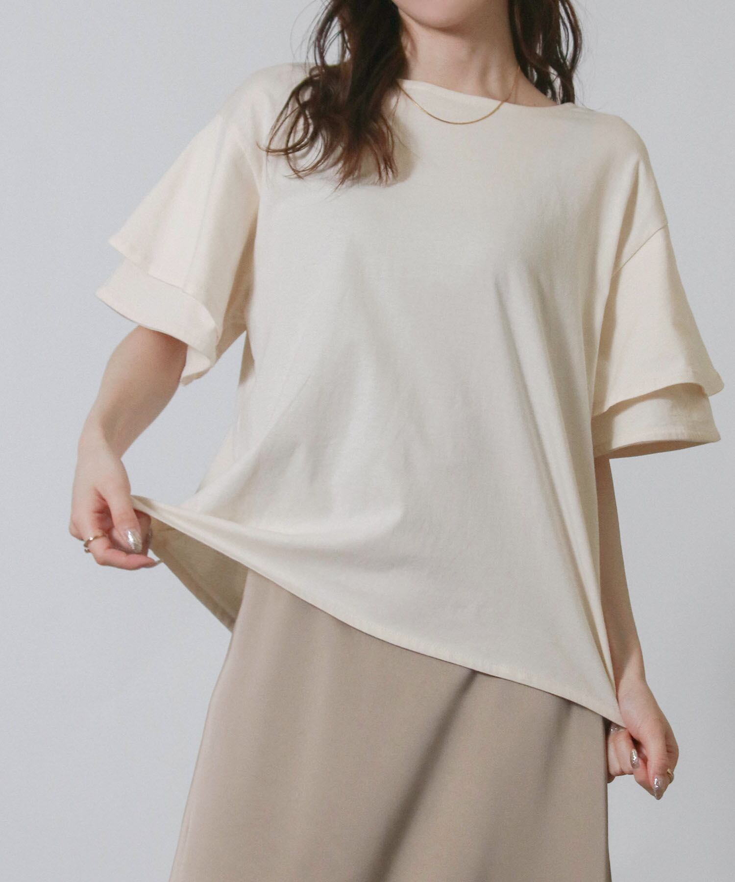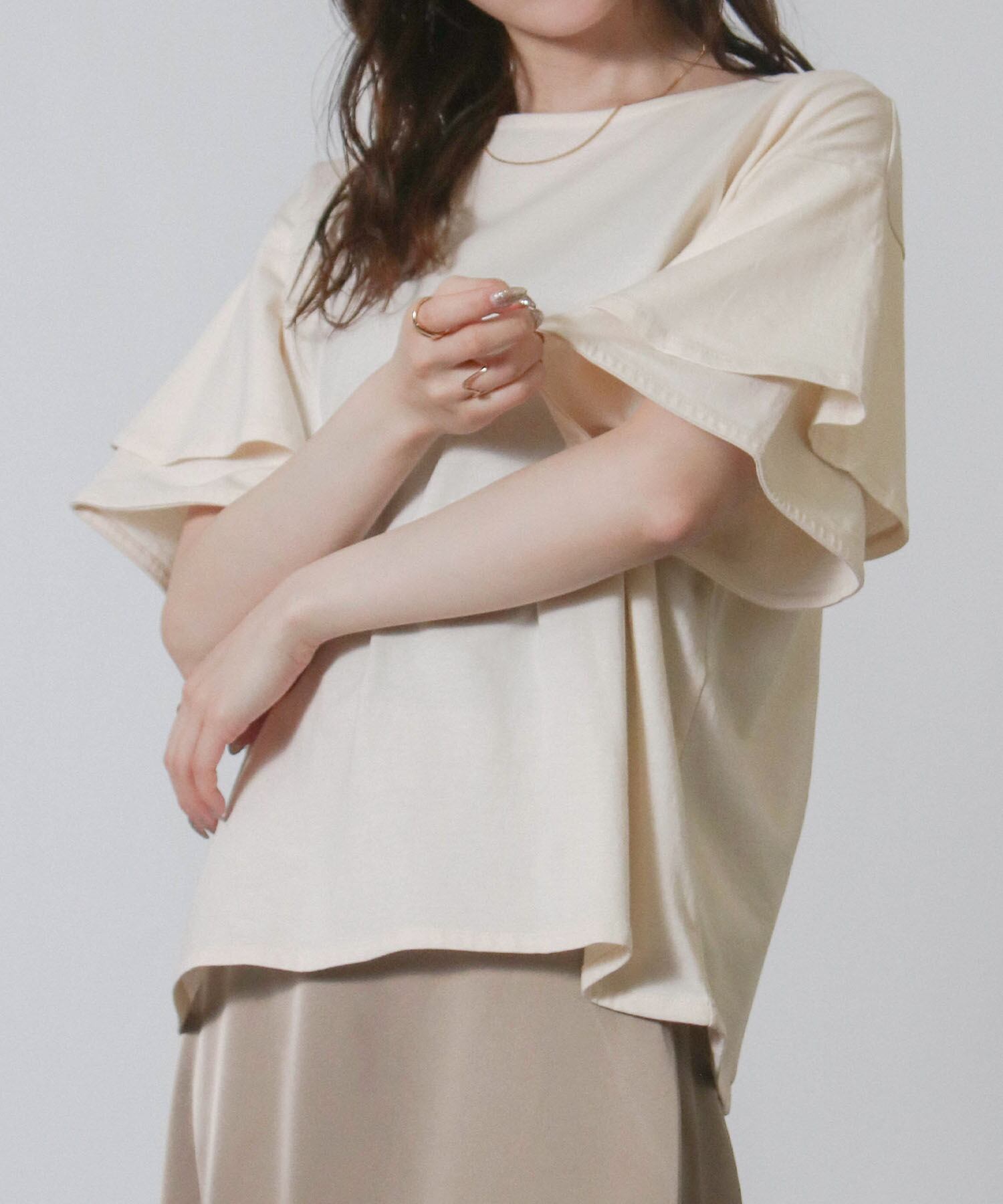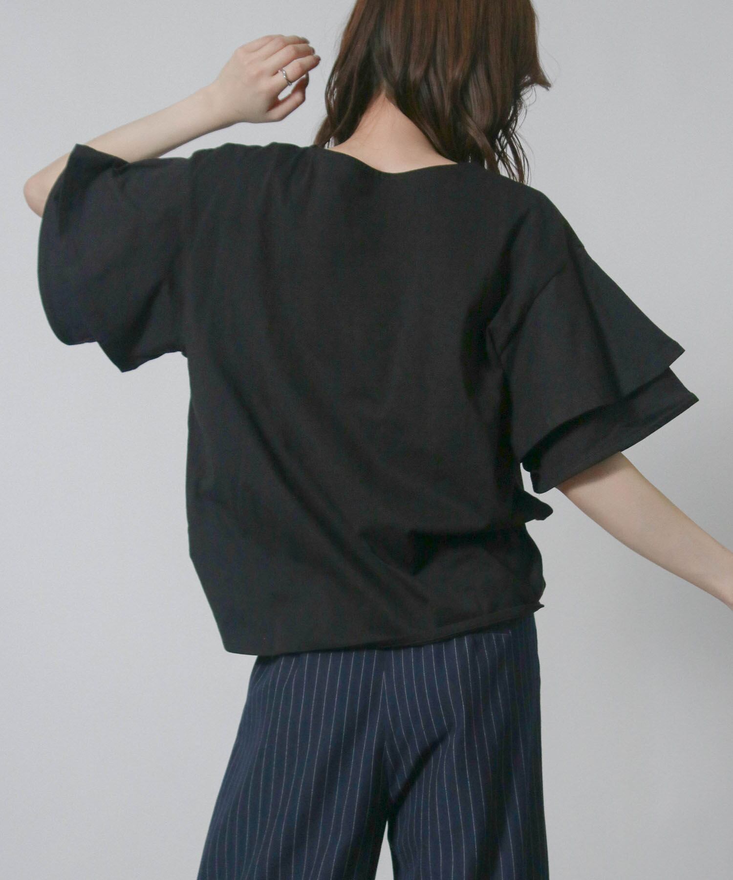 フリルスリーブが女性らしさを引き立てエレガントな印象に、二の腕をさりげなくカバーしてくれるため気になる部分を気にせず着こなせます。