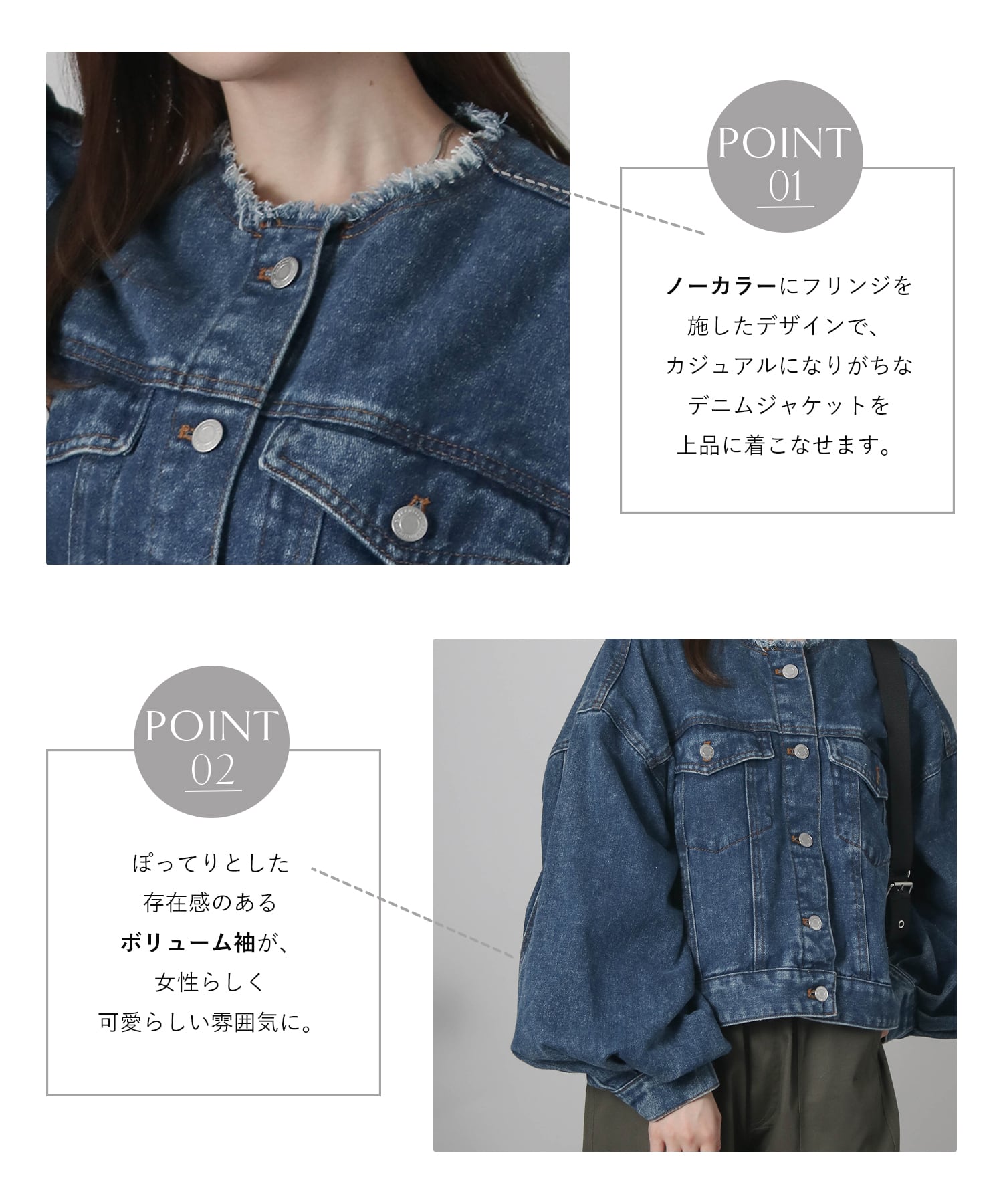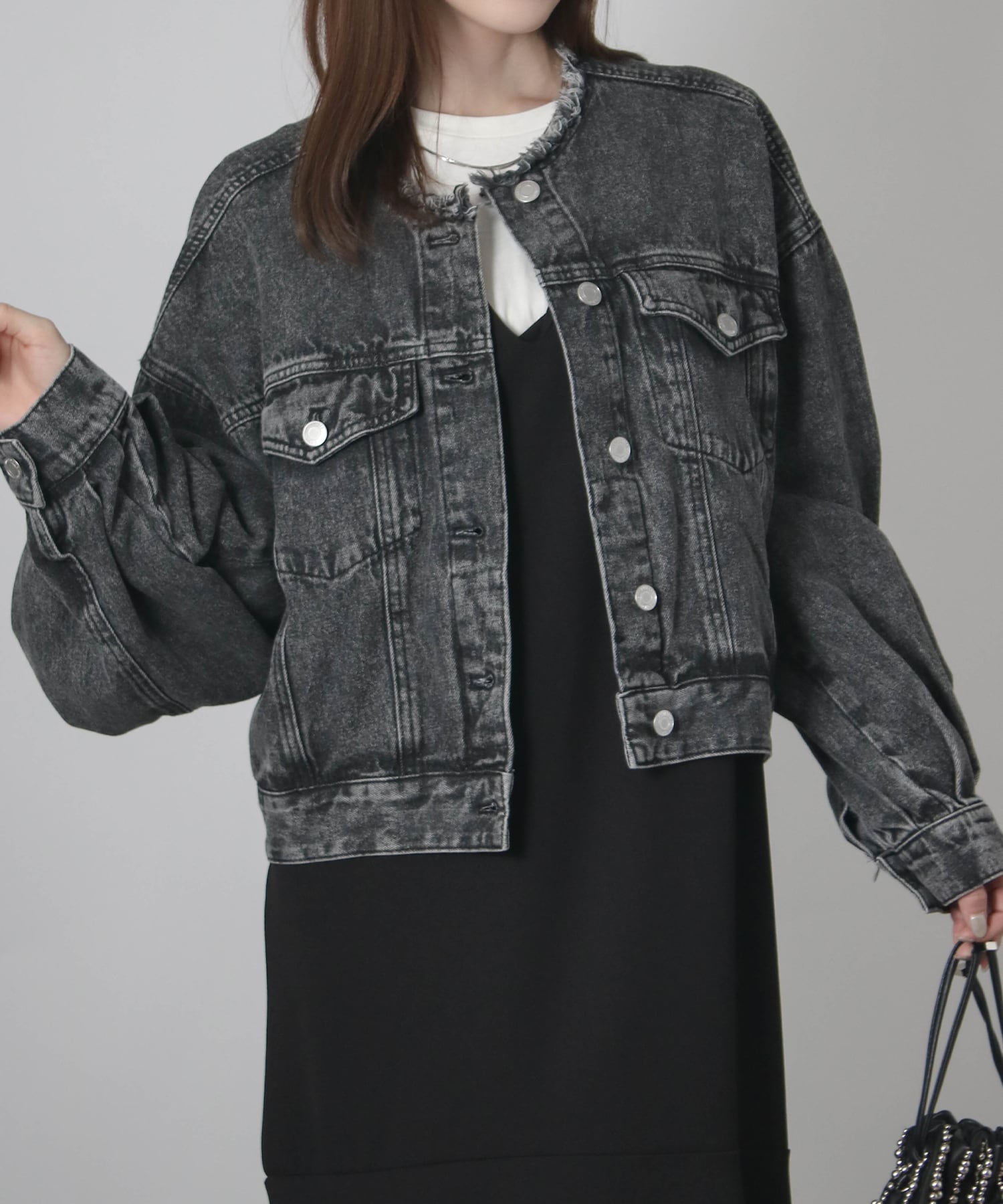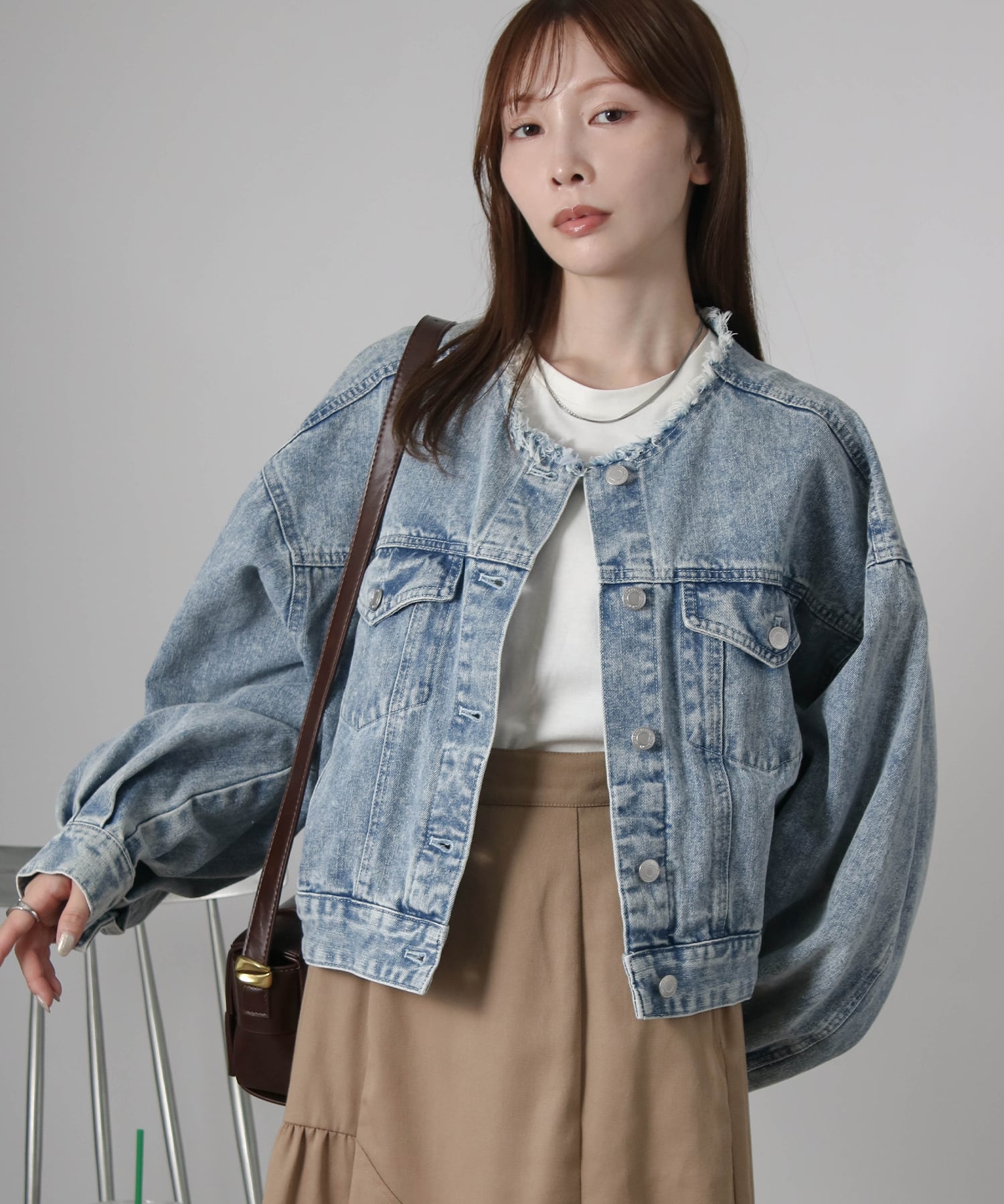 ・カジュアルになりがちなデニムジャケットもノーカラーデザインにすることで着やすさアップ。