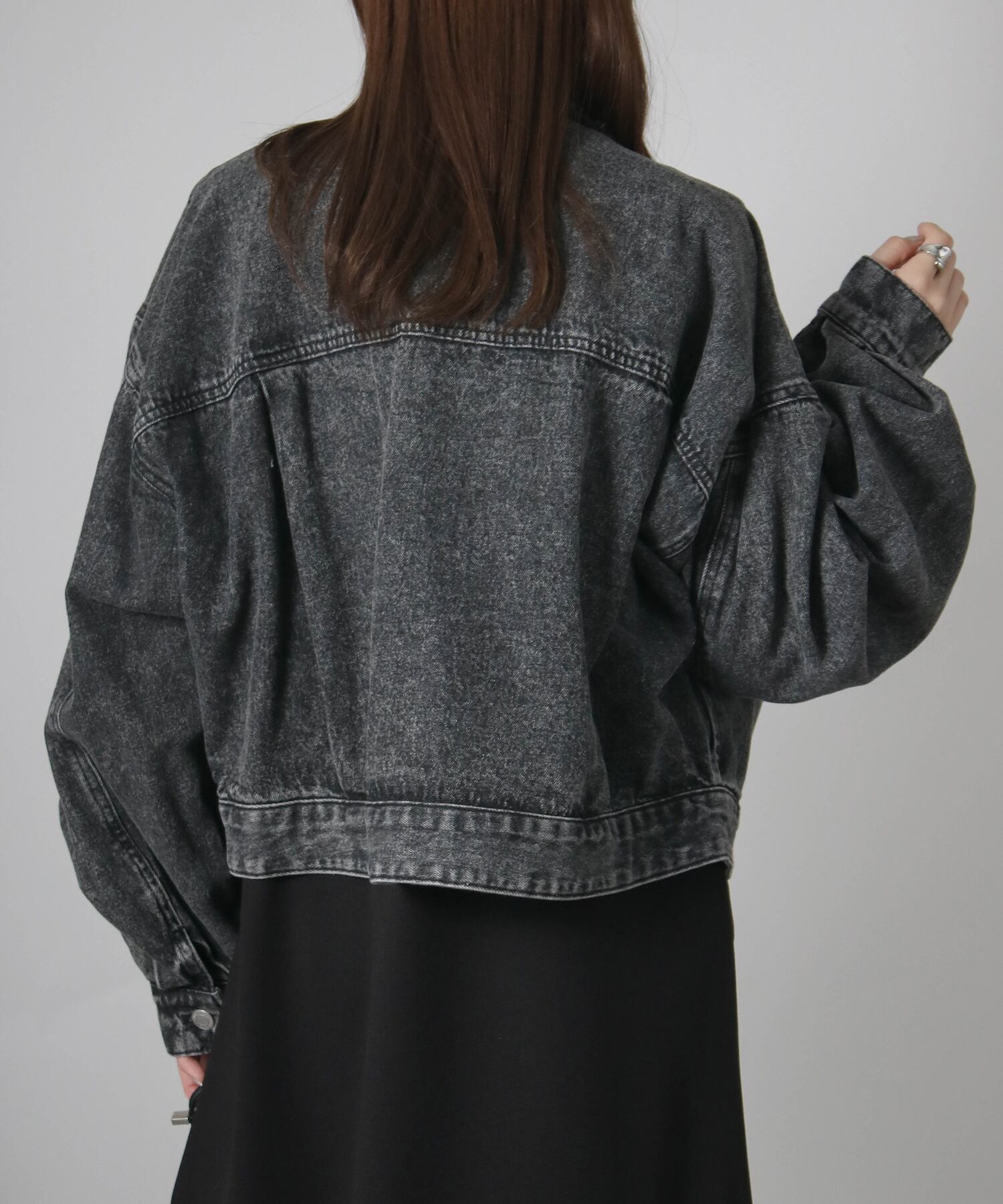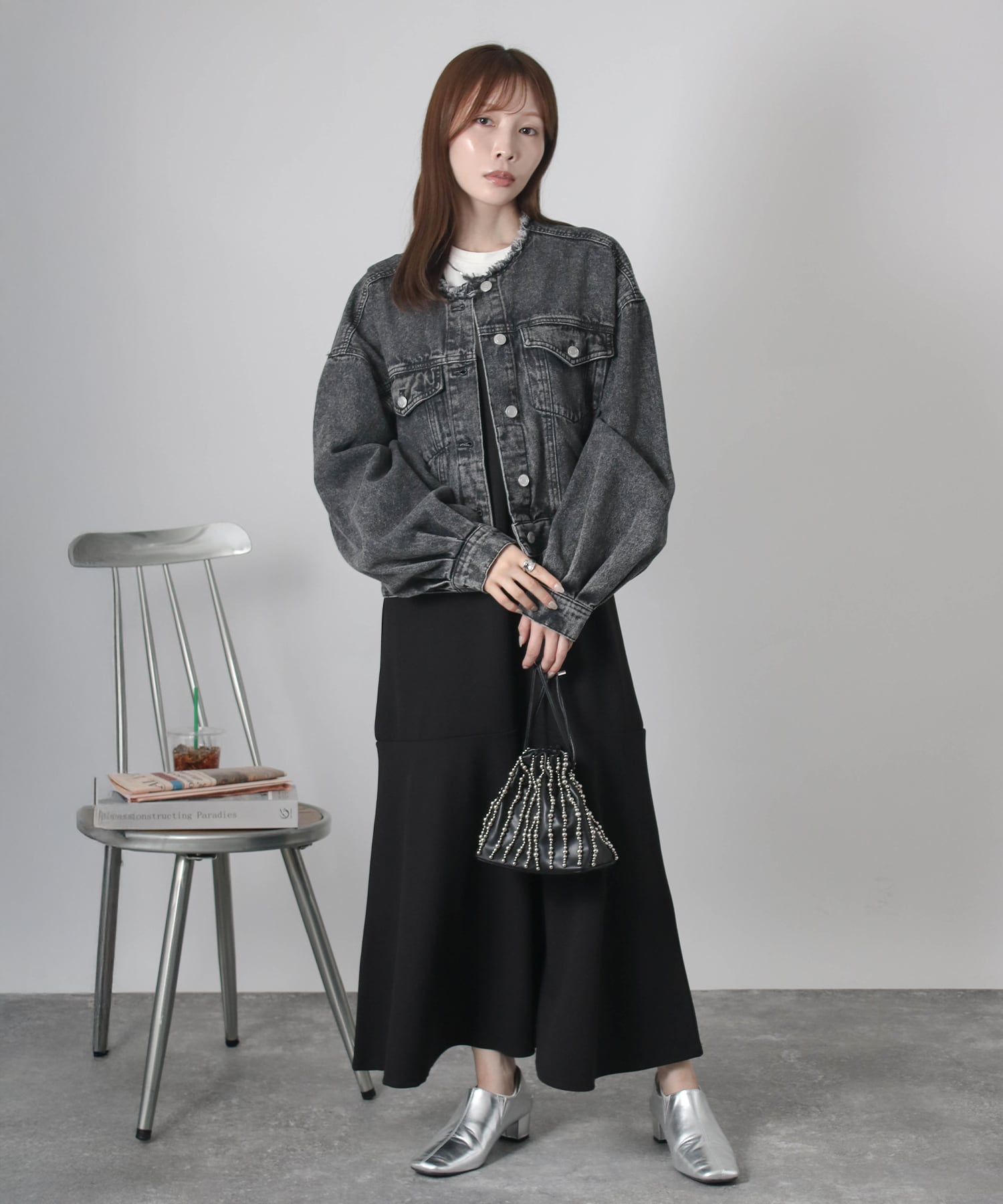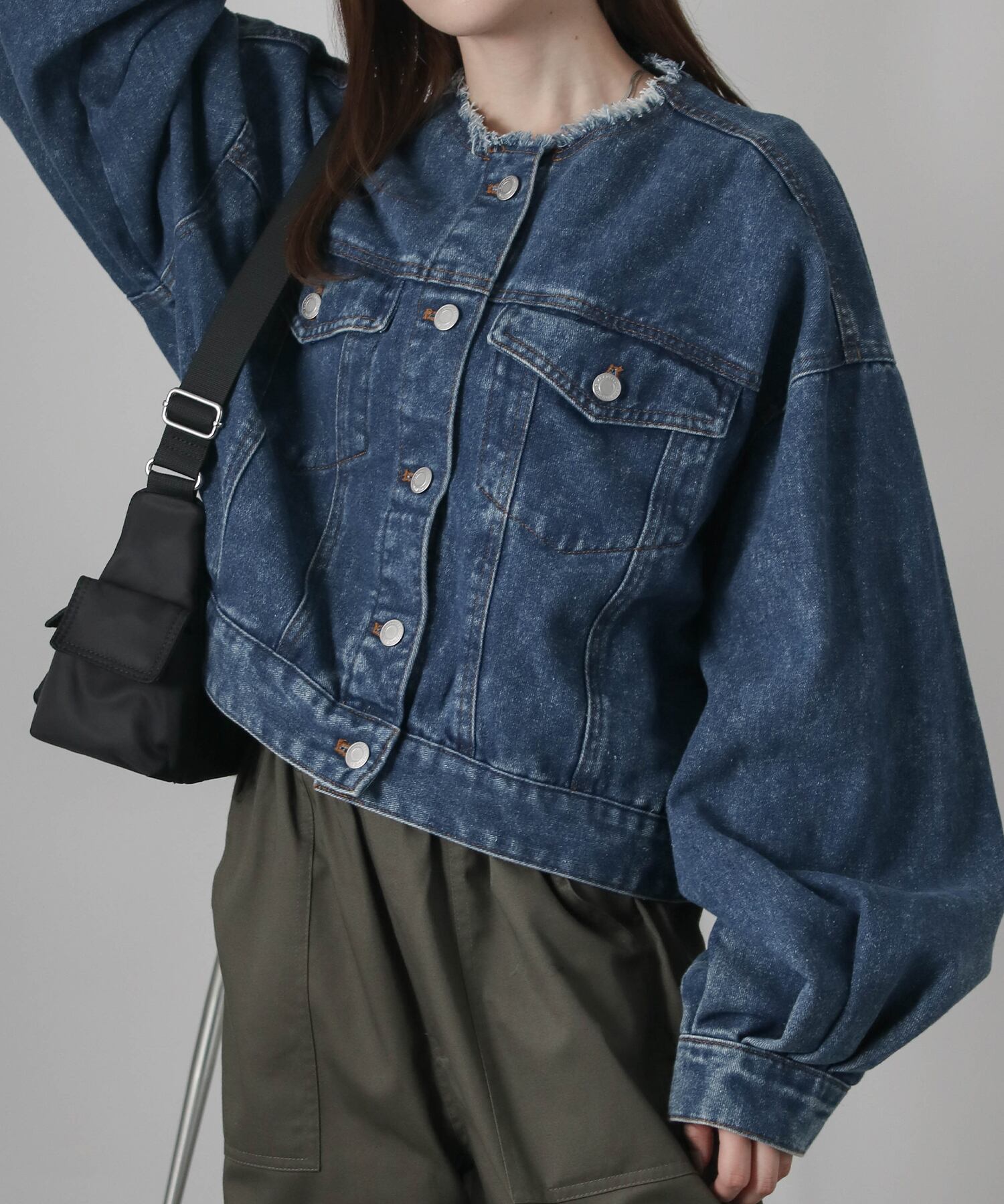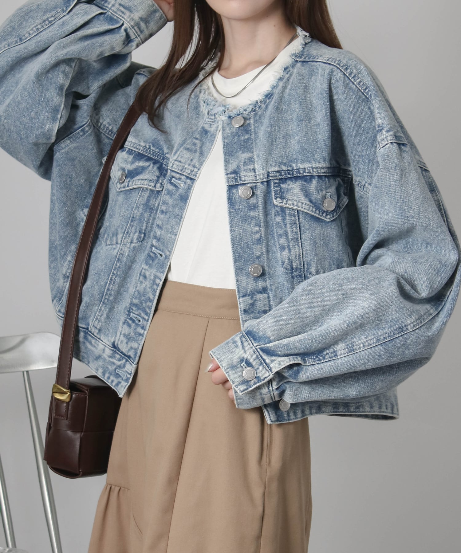 ・カジュアルになりがちなデニムジャケットもノーカラーデザインにすることで着やすさアップ。