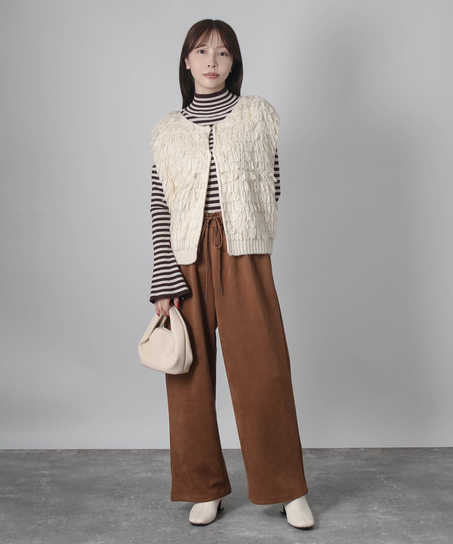 リラクシーな穿き心地と上品な表情を兼ね備えたスエード調イージーパンツ。落ち着いたカラーが秋冬のスタイリングに自然と馴染み、大人のカジュアルスタイルに格上げしてくれます。ゆったりとしたシルエットで、こなれ感のある着こなしを楽しめます。