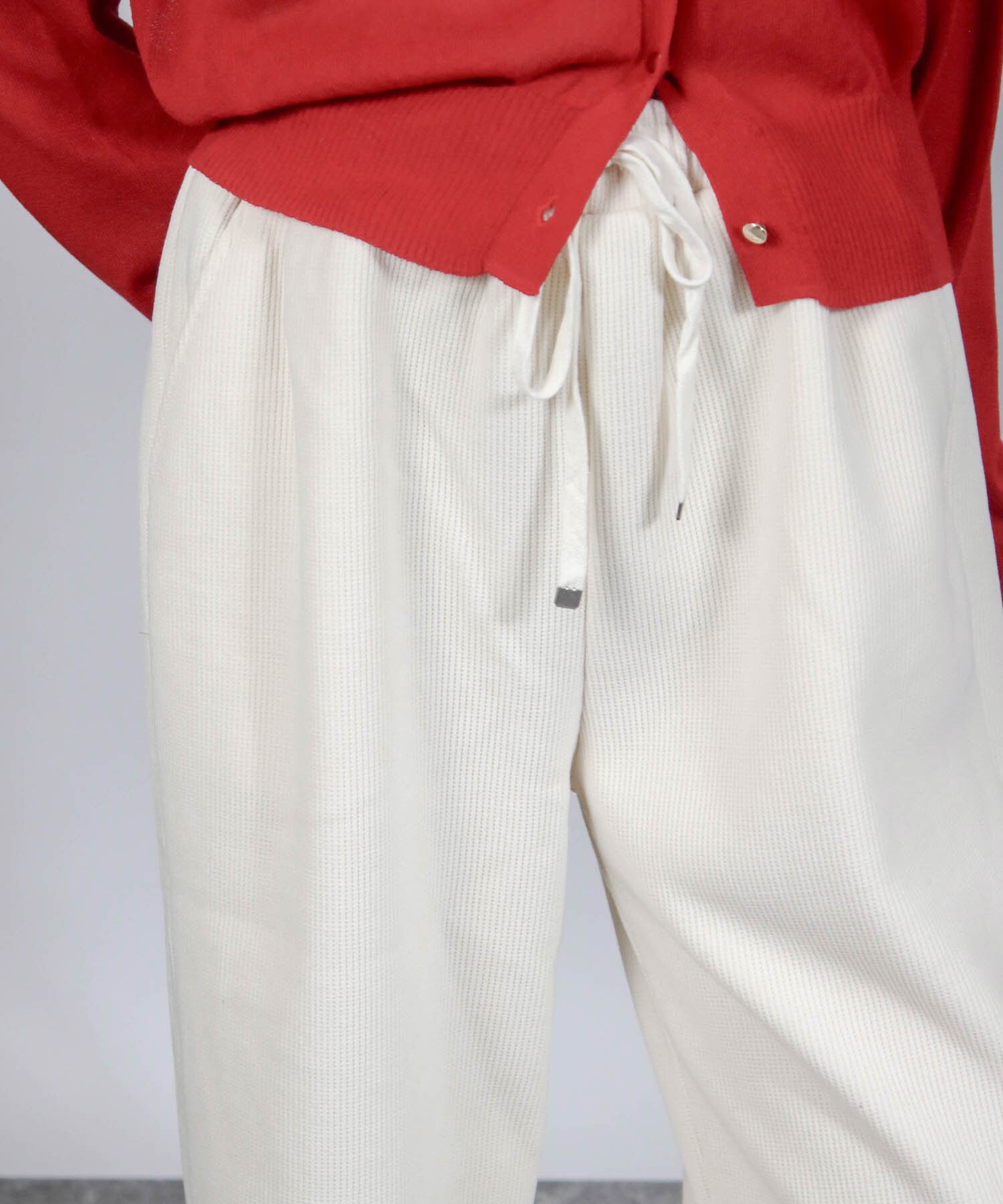 ウエスト部分は太めのゴム仕様でしっかりフィットしながらも快適な着用感。ドローストリングでサイズ調整も可能です。裾までストンと落ちるストレートラインが、足元をすっきりと見せてくれます。サイドポケット付きで機能性も備え、毎日のデイリーウェアにぴったりです。
