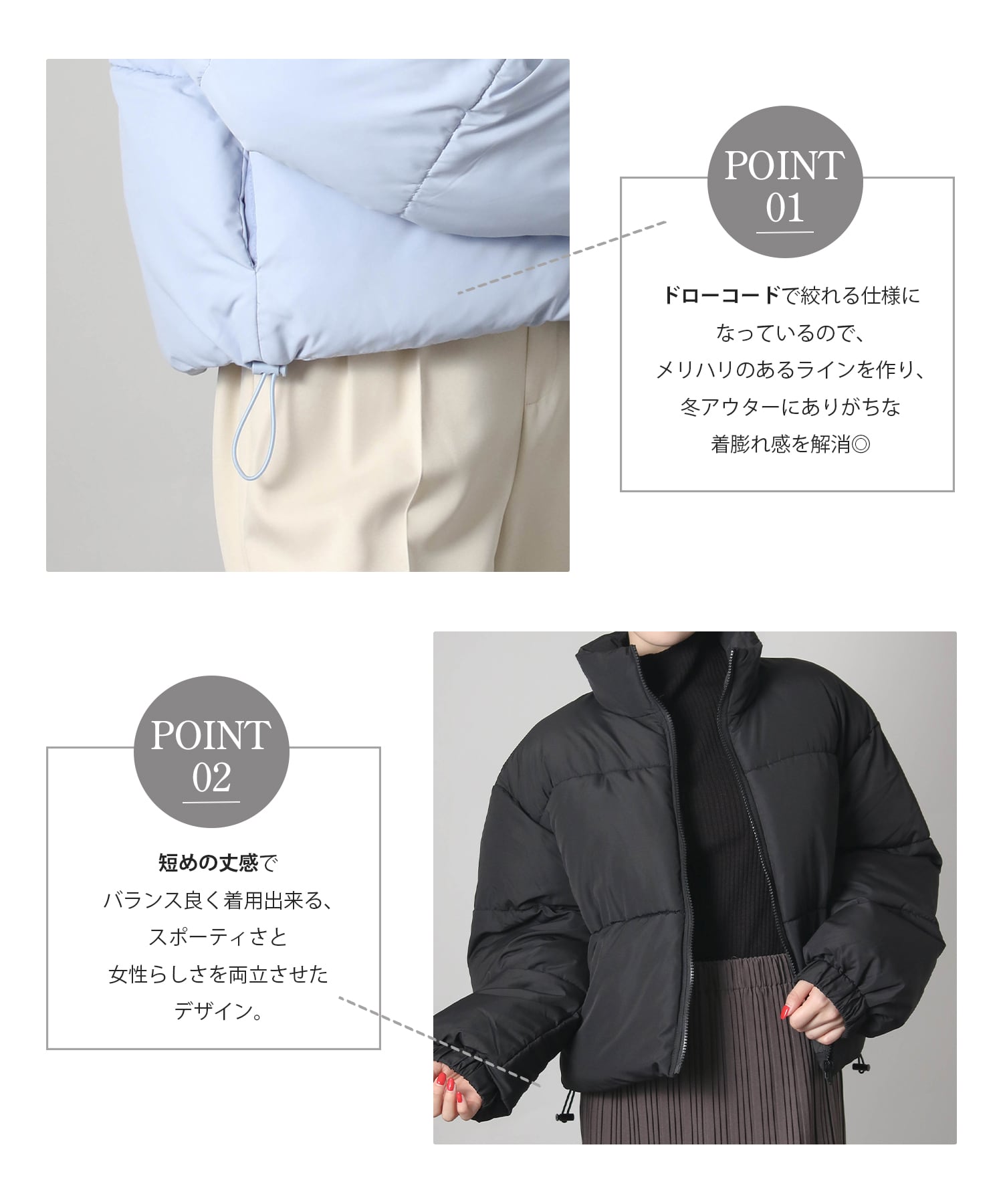 フロントはシンプルなジップデザインで着脱もスムーズ。裾にはドローコードを備え、シルエットを好みに合わせてアレンジ可能。スポーティさと女性らしさを両立させた、デイリーに寄り添うデザインです。