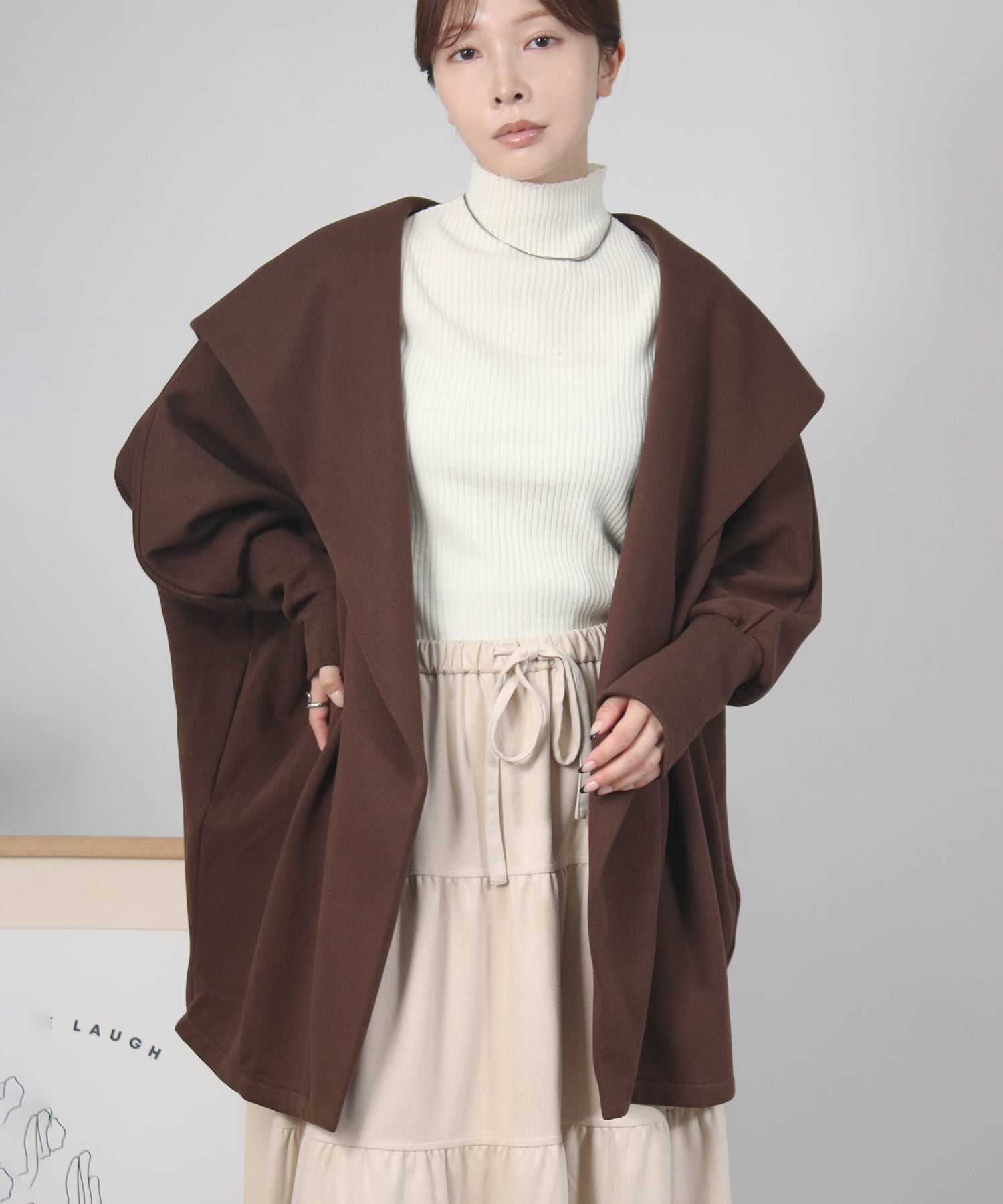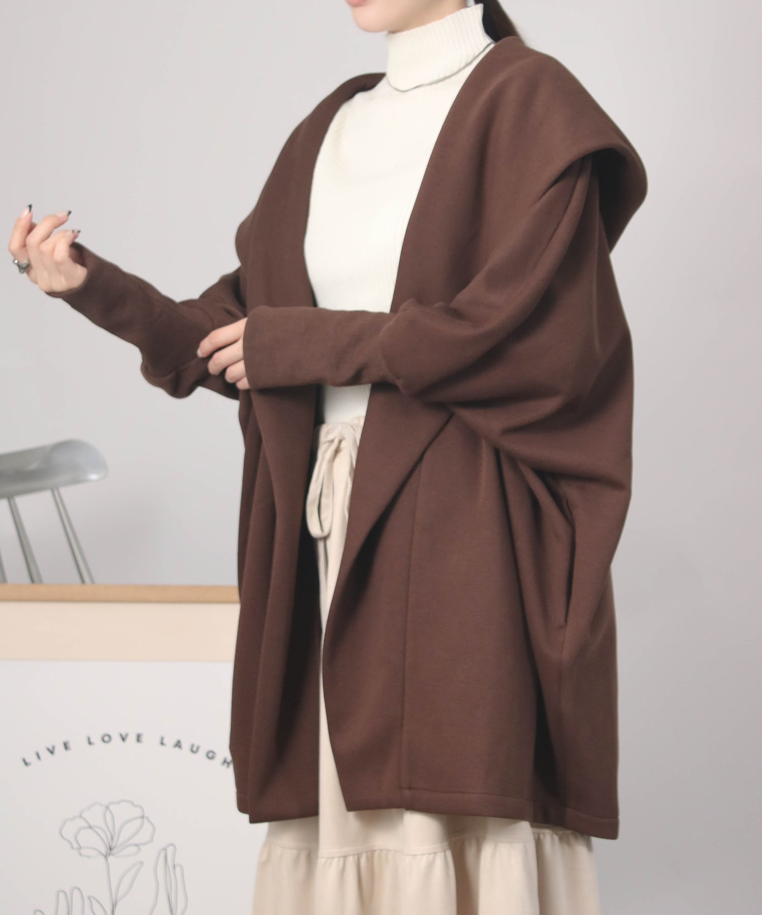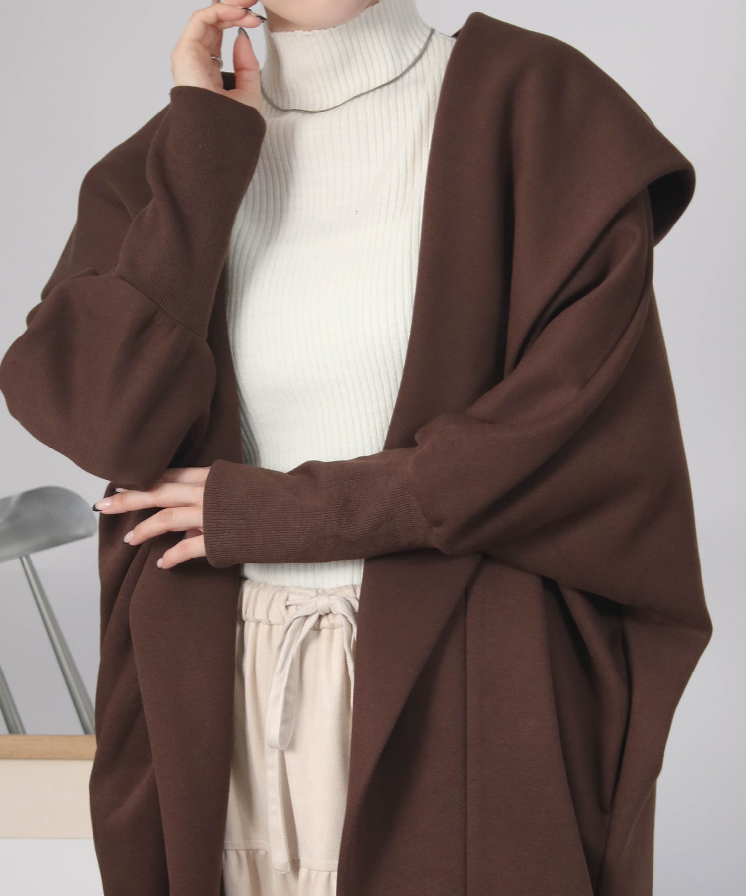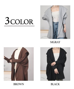 ゆったりとしたドルマンスリーブシルエットにフードをあしらった、リラクシーな雰囲気のガウン。気になるヒップラインも自然にカバーしてくれます。ボタンレスでさっと羽織れる気軽さも魅力。ナチュラルながら、後ろ姿まで抜かりなくおしゃれに決まる一枚です。