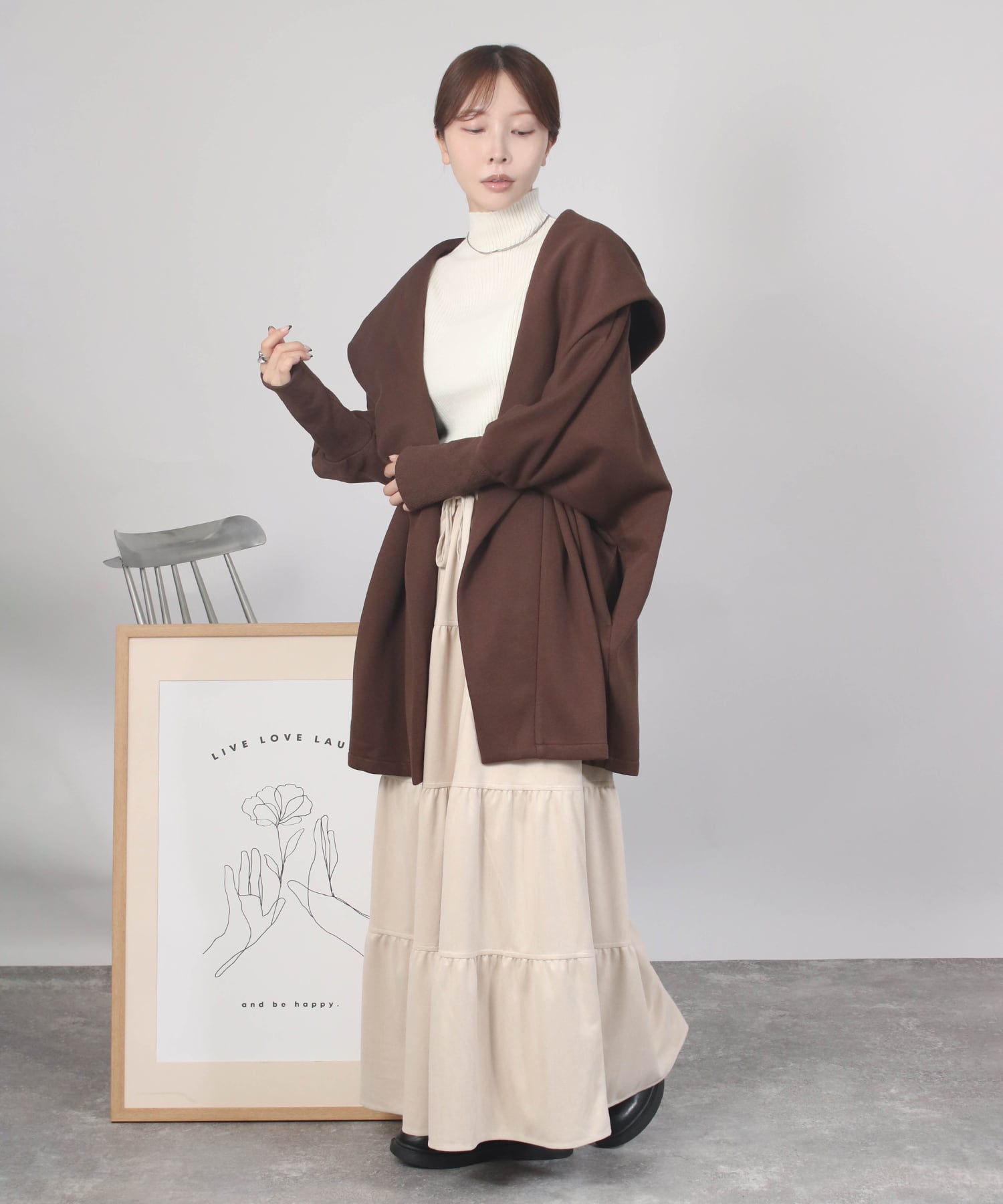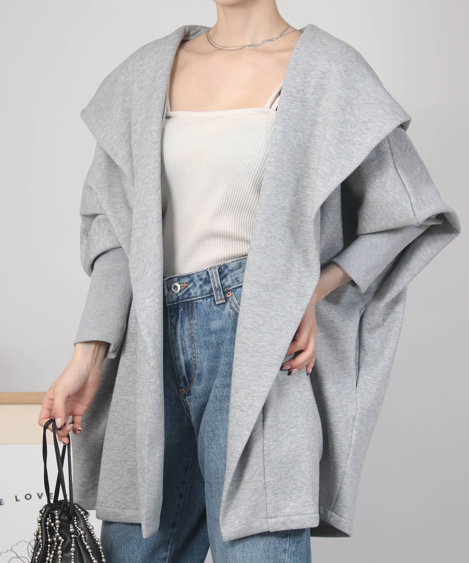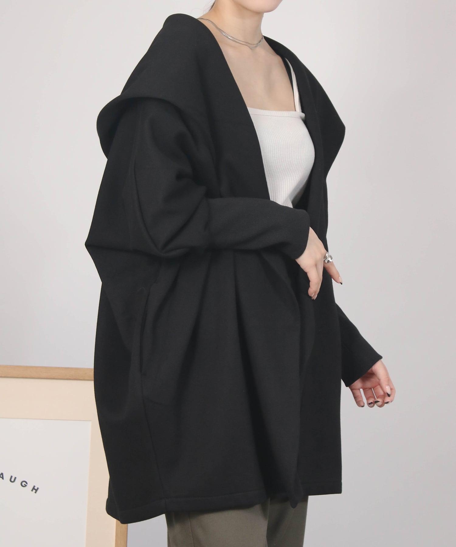 ゆったりとしたドルマンスリーブシルエットにフードをあしらった、リラクシーな雰囲気のガウン。気になるヒップラインも自然にカバーしてくれます。ボタンレスでさっと羽織れる気軽さも魅力。ナチュラルながら、後ろ姿まで抜かりなくおしゃれに決まる一枚です。