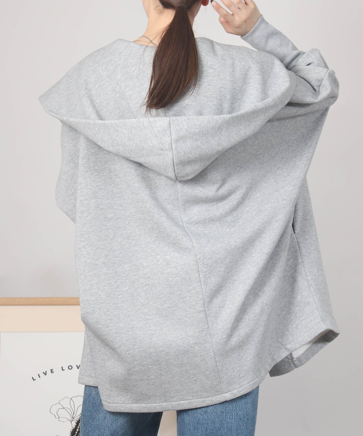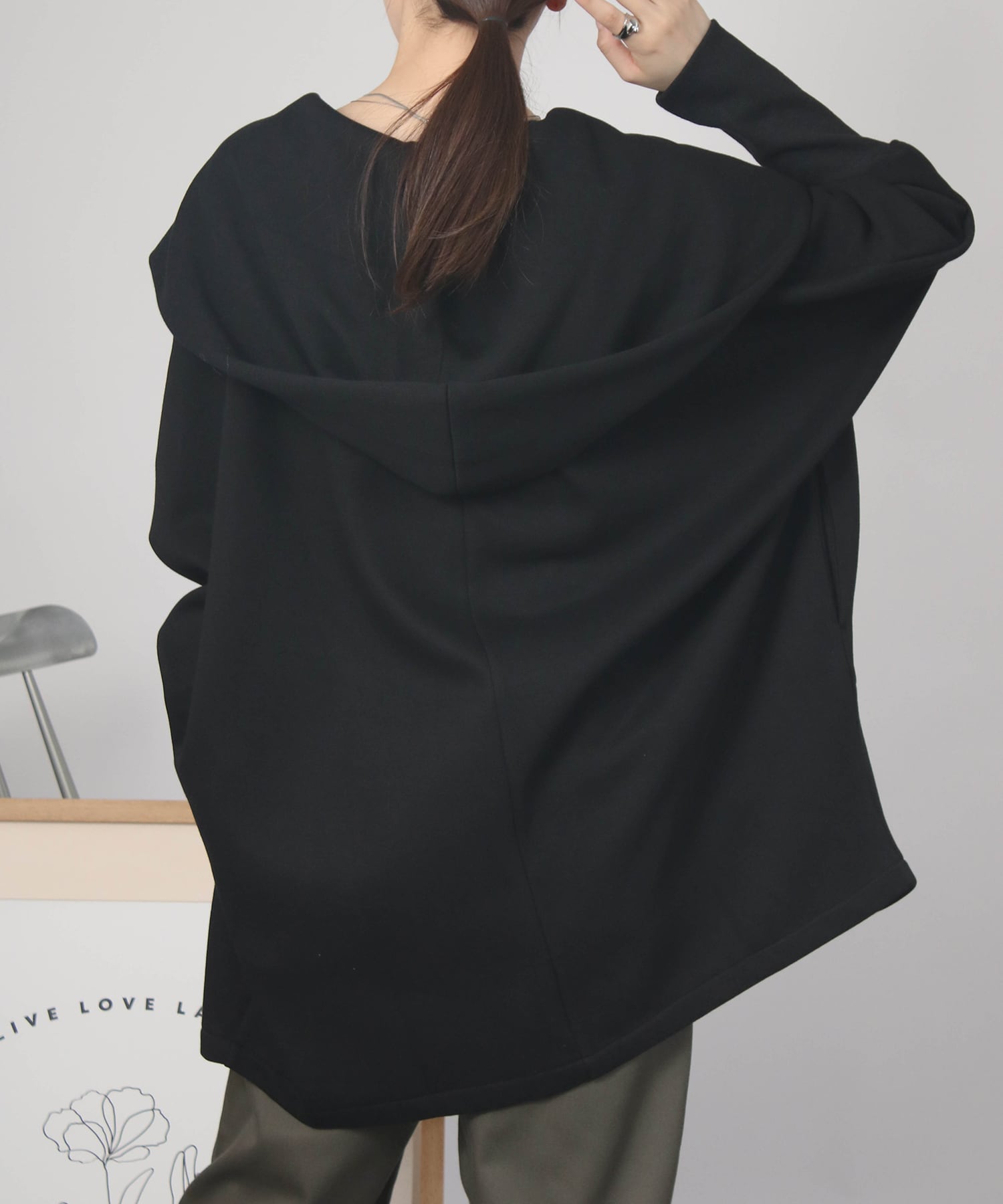 脇や二の腕まわりはゆったりしつつ、袖口はリブ仕様でフィット感を持たせた設計。手元の動きを邪魔せず、実用性とシルエット美を両立しています。フードが自然に立ち上がり、後ろ姿にも程よいボリュームとアクセントをプラス。