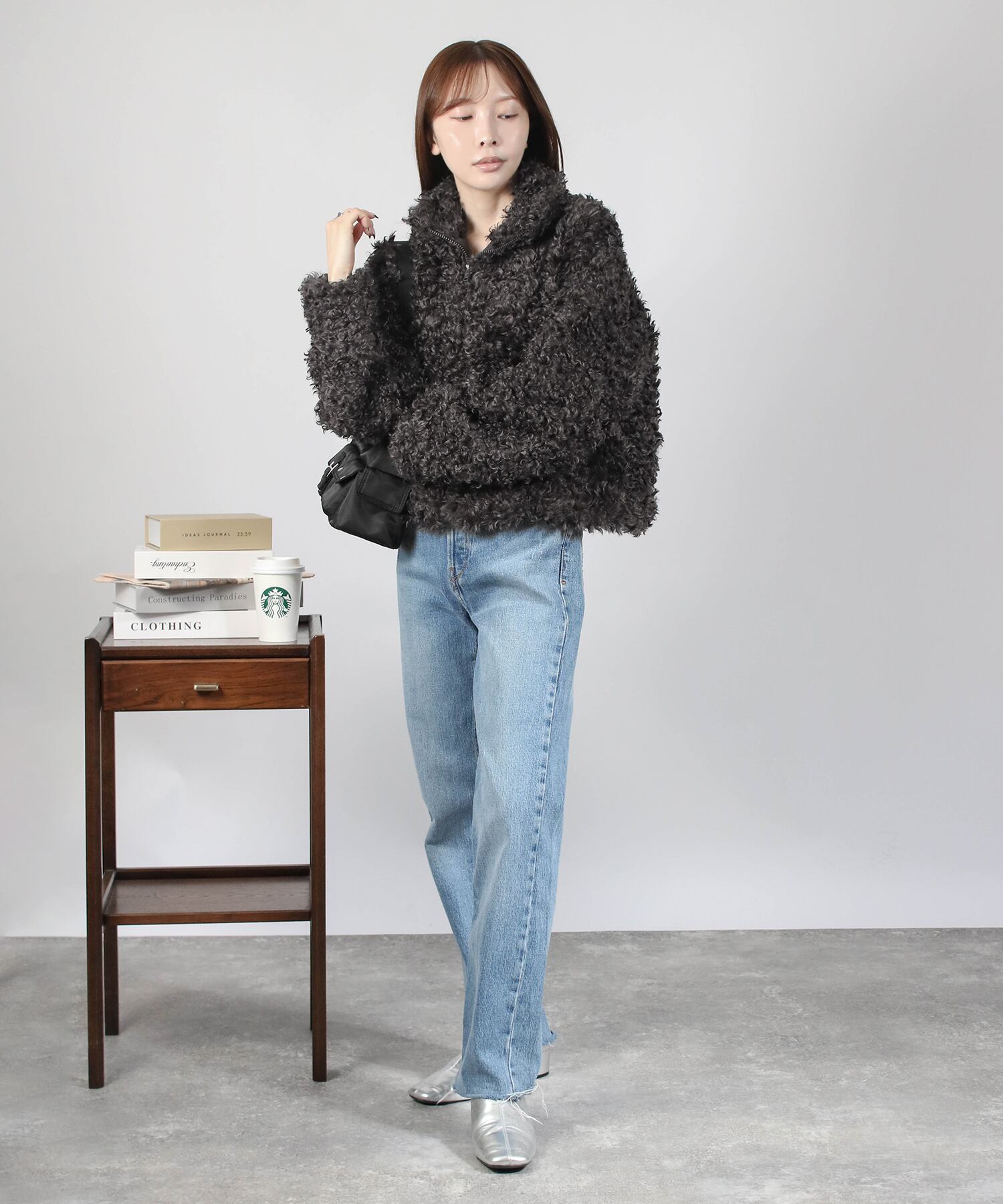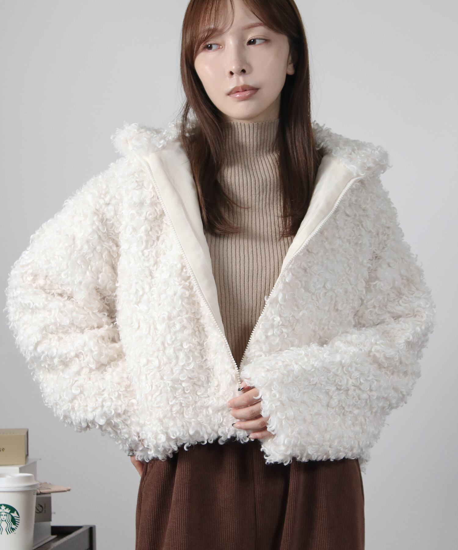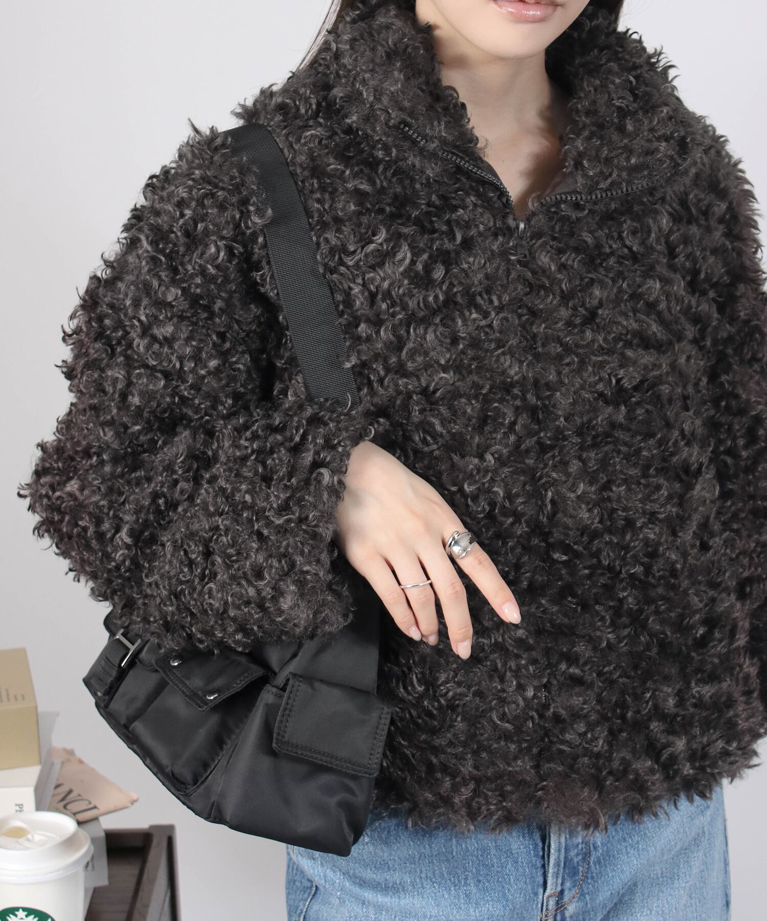 もこもことした質感が可愛いプードルファー素材を使用。柔らかく軽やかな着心地で、見た目以上に着やすいのが魅力です。保温性が高く、冬の街でも快適に過ごせます。