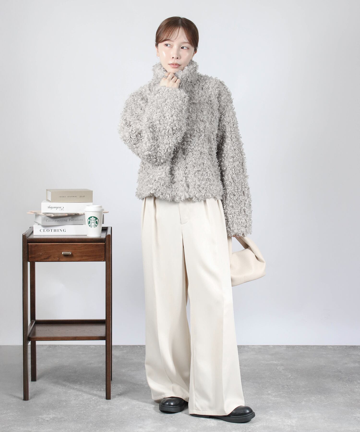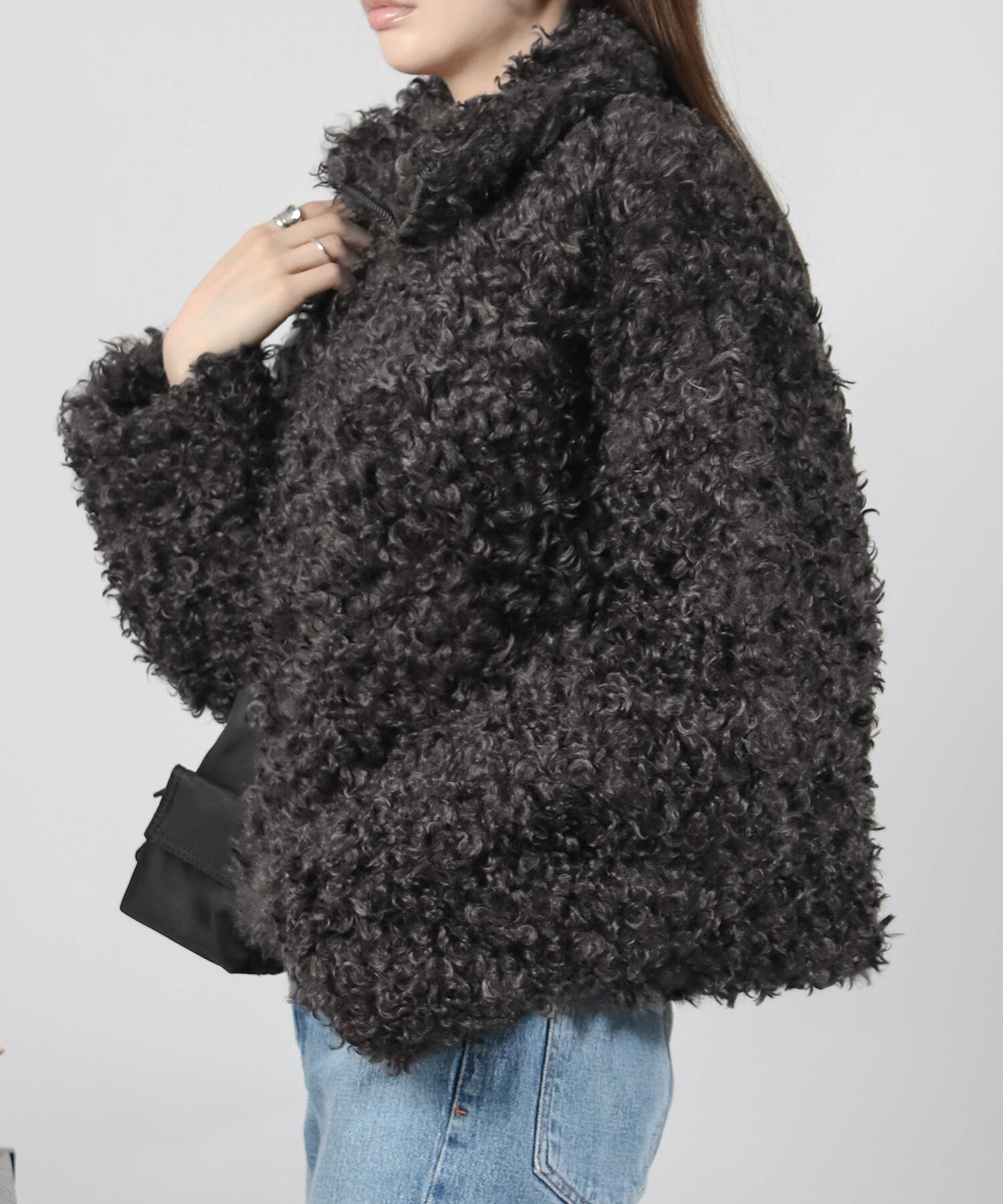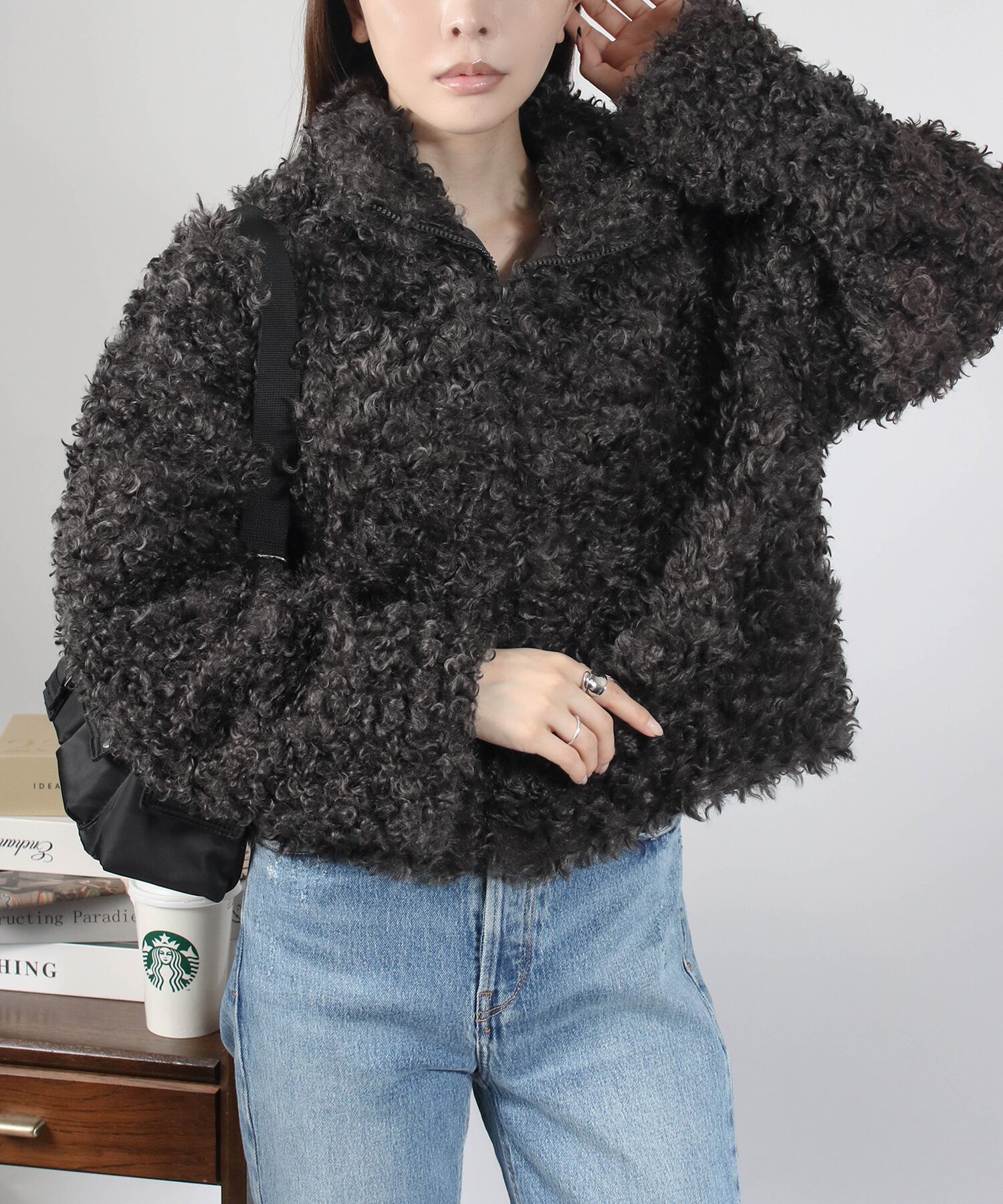もこもことした質感が可愛いプードルファー素材を使用。柔らかく軽やかな着心地で、見た目以上に着やすいのが魅力です。保温性が高く、冬の街でも快適に過ごせます。