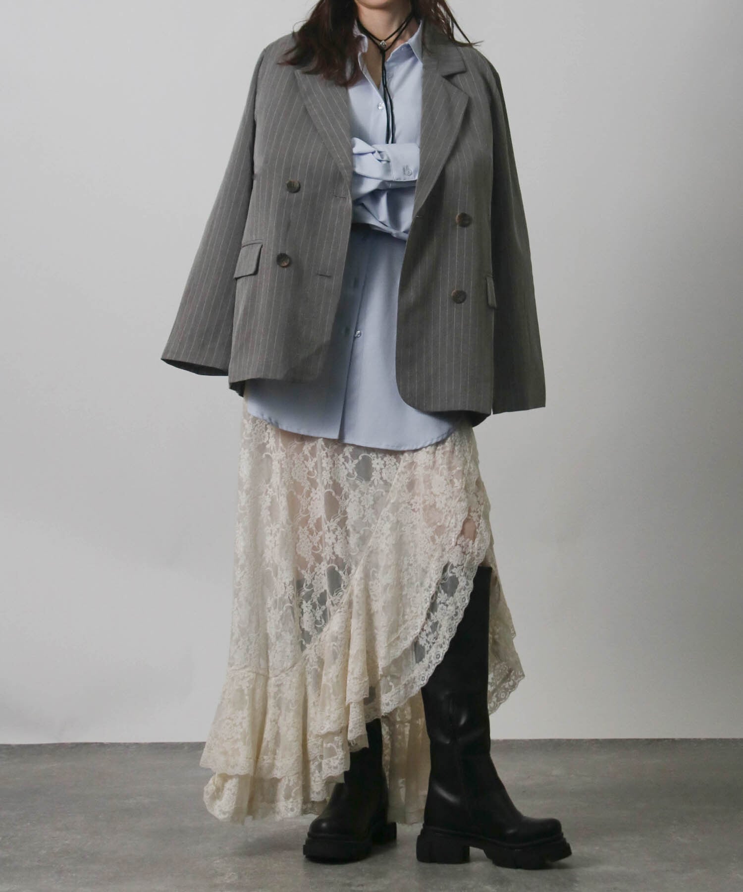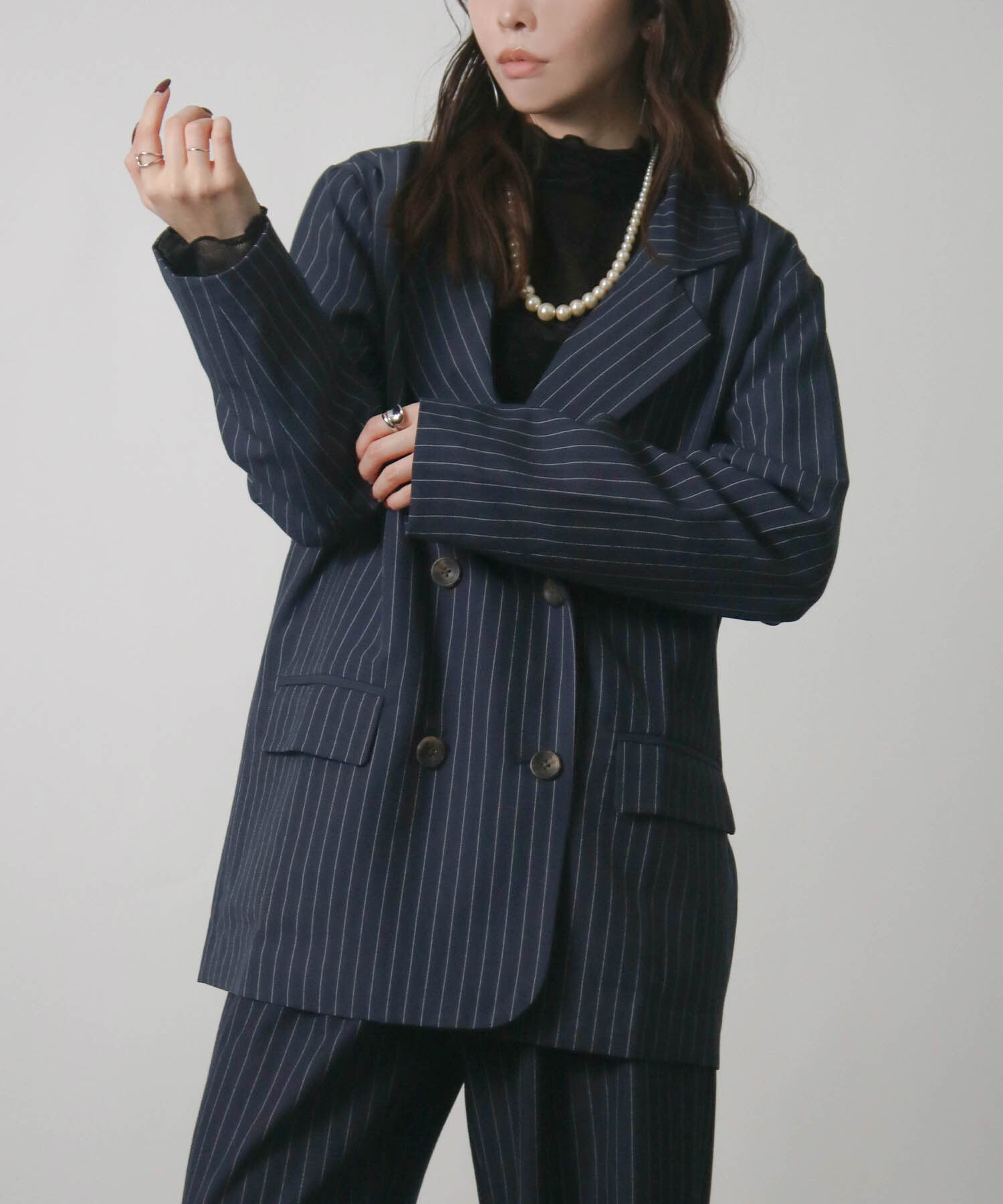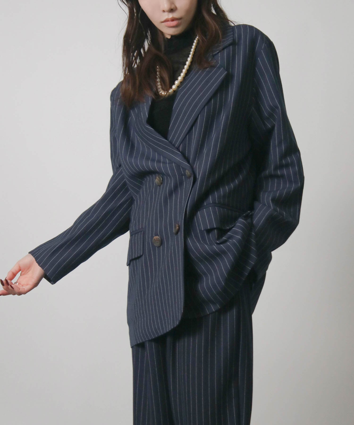 クラシカルなダブルボタンとストライプ柄が、羽織るだけで自然ときちんと感を演出するテーラードジャケット。