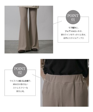 縦のラインを美しく強調するリブ編みと、膝から裾へ自然に広がるフレアシルエットが特徴のテレコフレアパンツ。