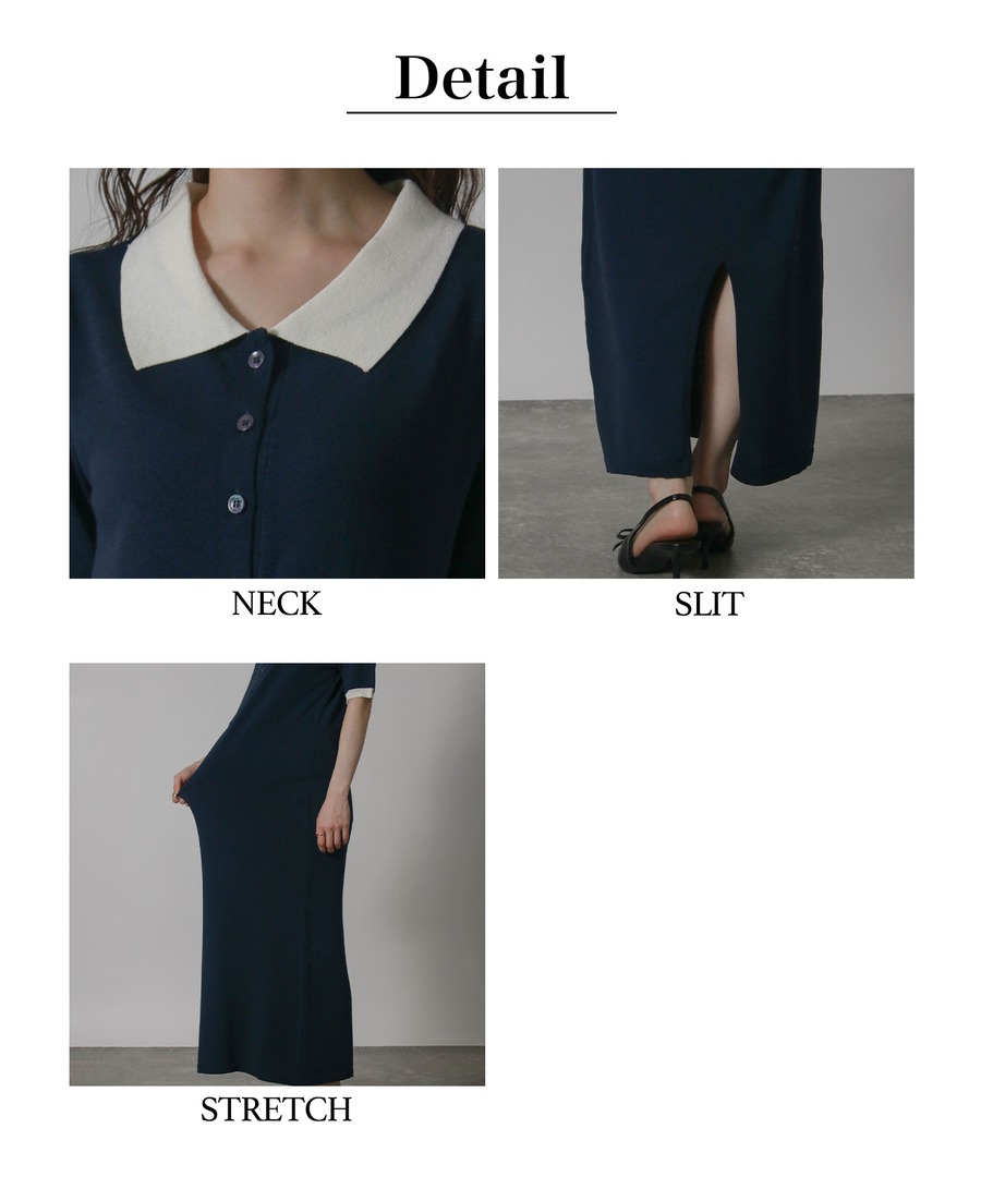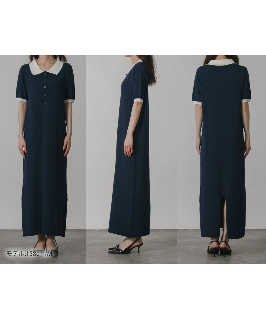 襟元と袖口にオフカラーを配したバイカラーデザインが、シンプルながら洗練された印象を与えるロングワンピース。