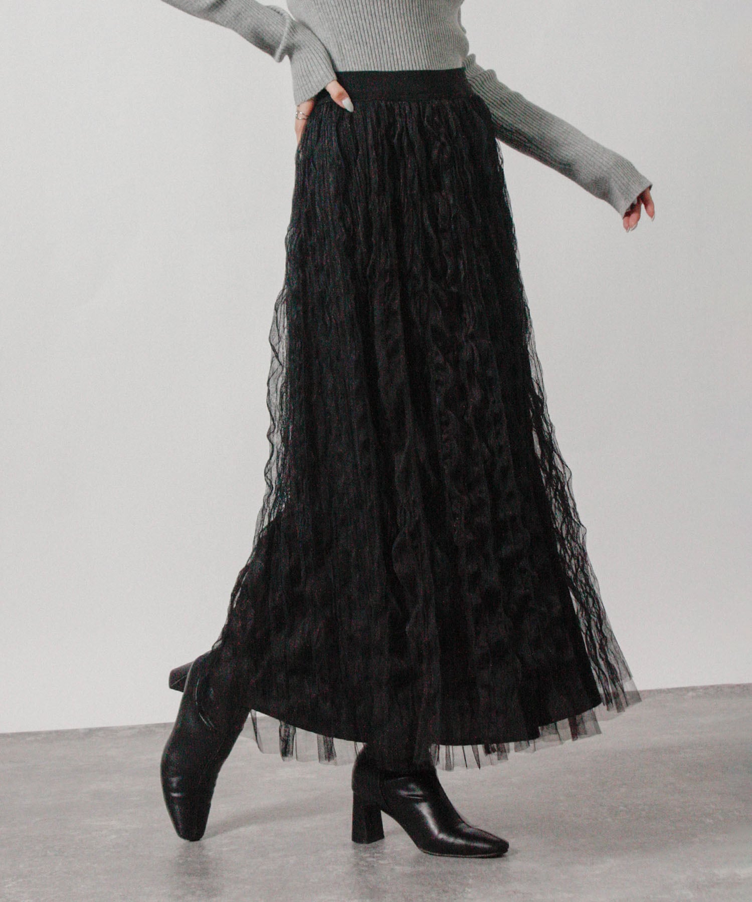 チュール素材に施したウェーブワッシャーが、動きに合わせて柔らかな立体感を生み出すスカート。