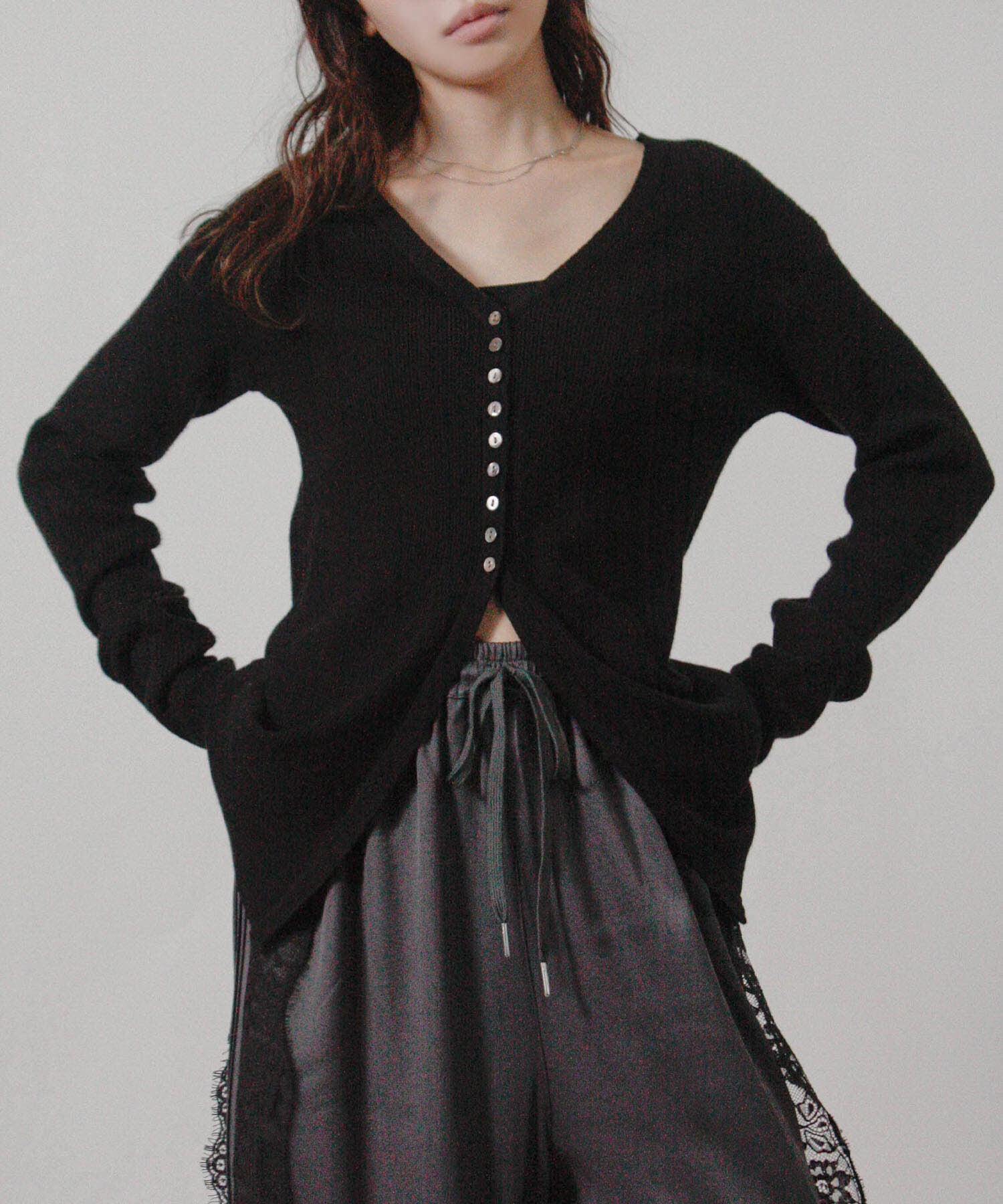 腰まわりにほどよくかかる丈と安心感のある着用感で、日常に取り入れやすい、上品で落ち着いた一枚です。