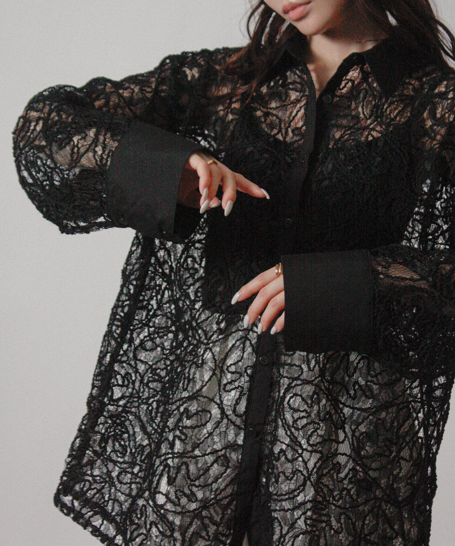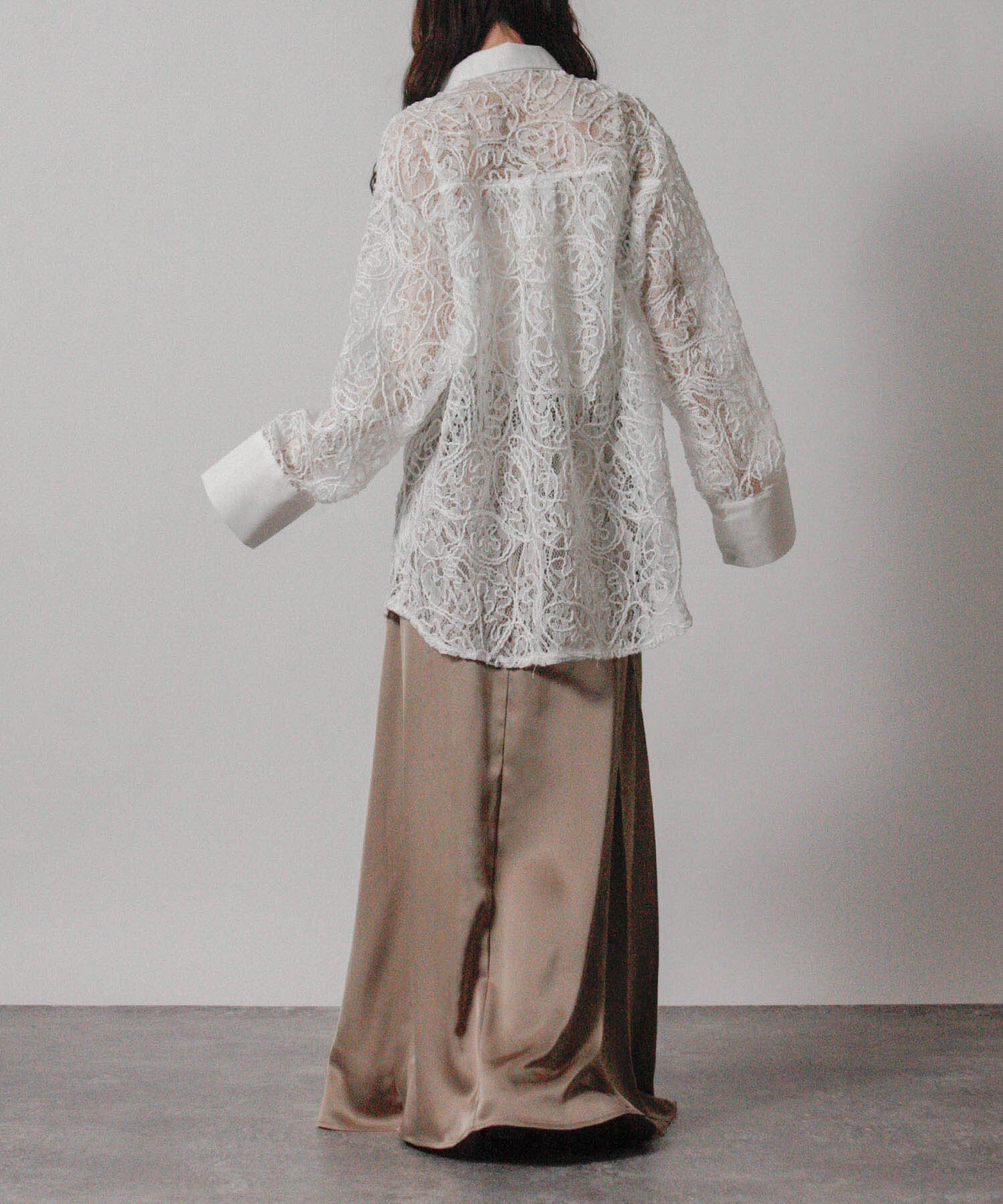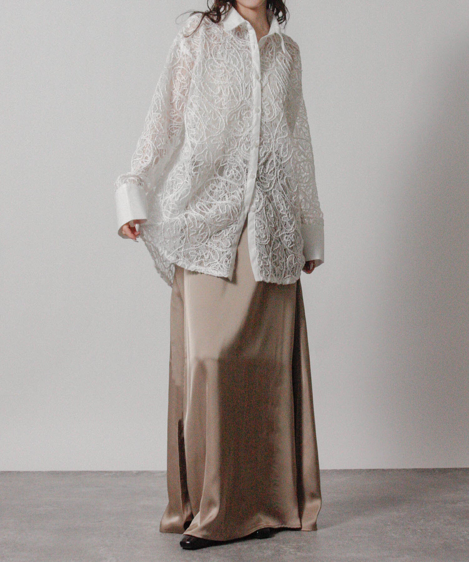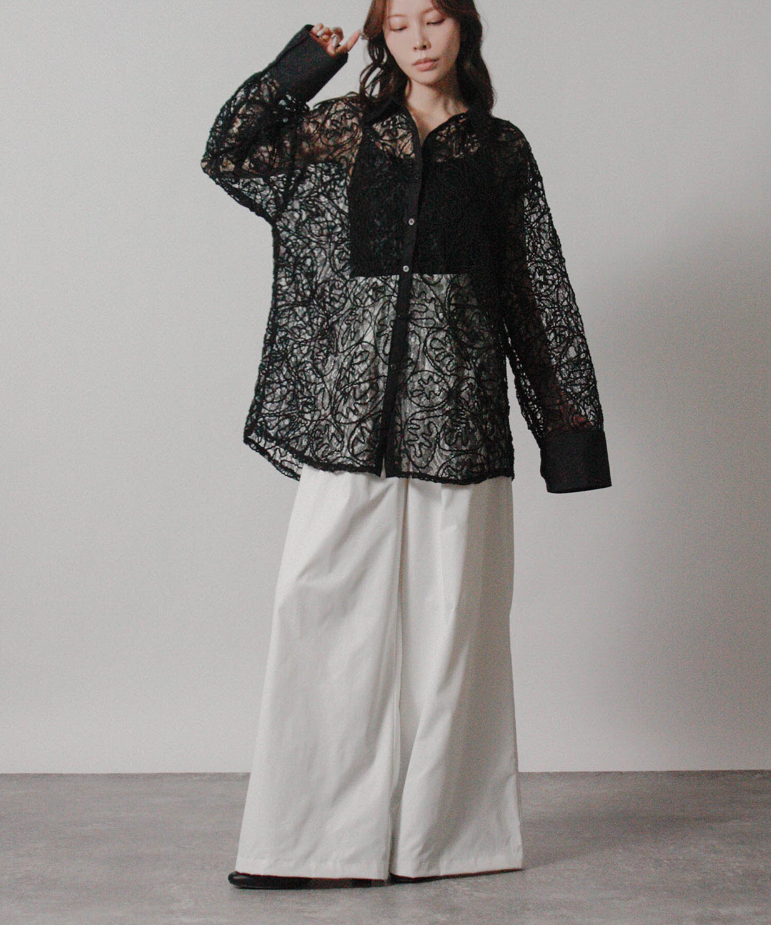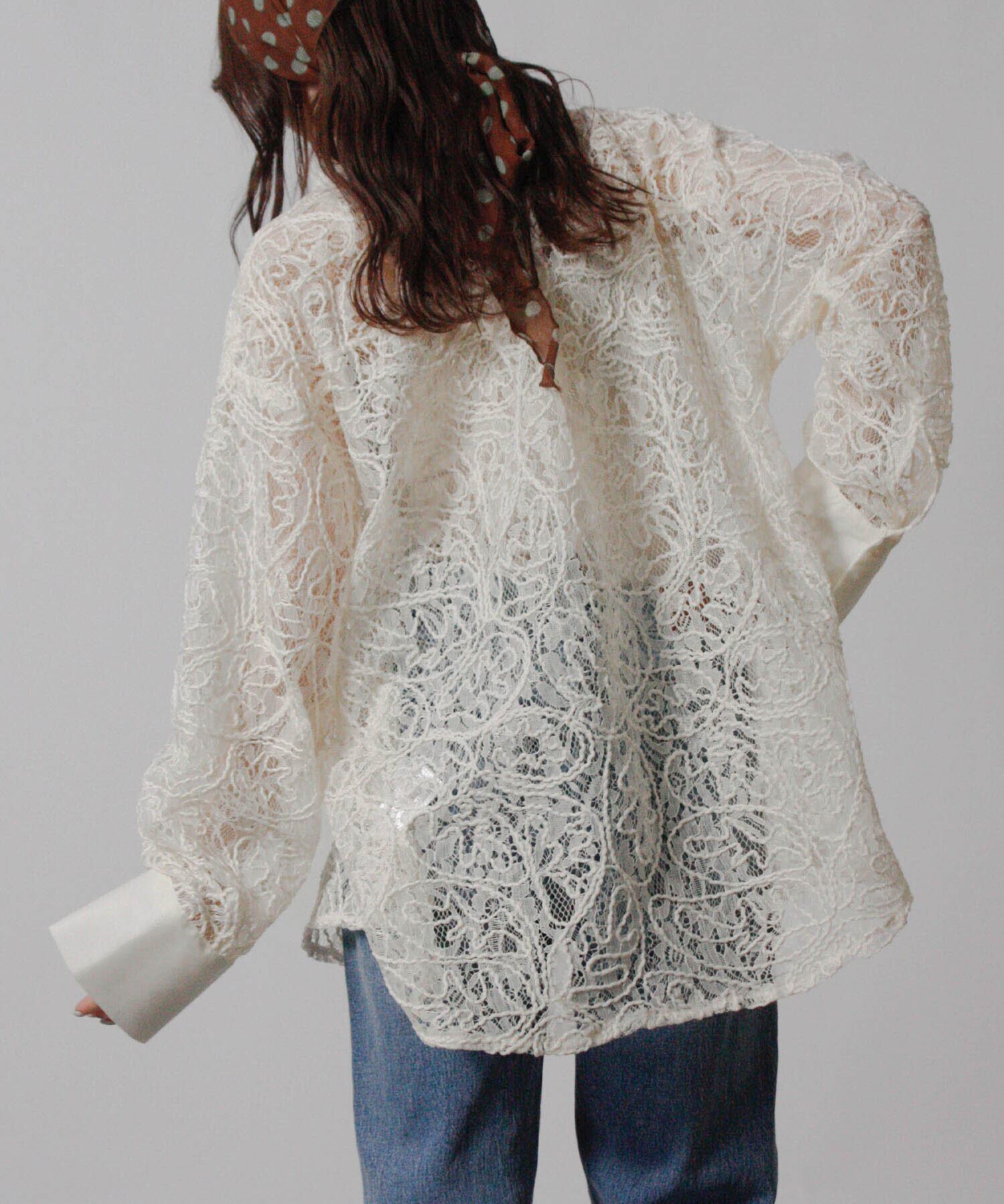 繊細な刺繍レースを全面にあしらいながら、オーバーサイズのシルエットで甘さを程よく抑えたシャツ。
