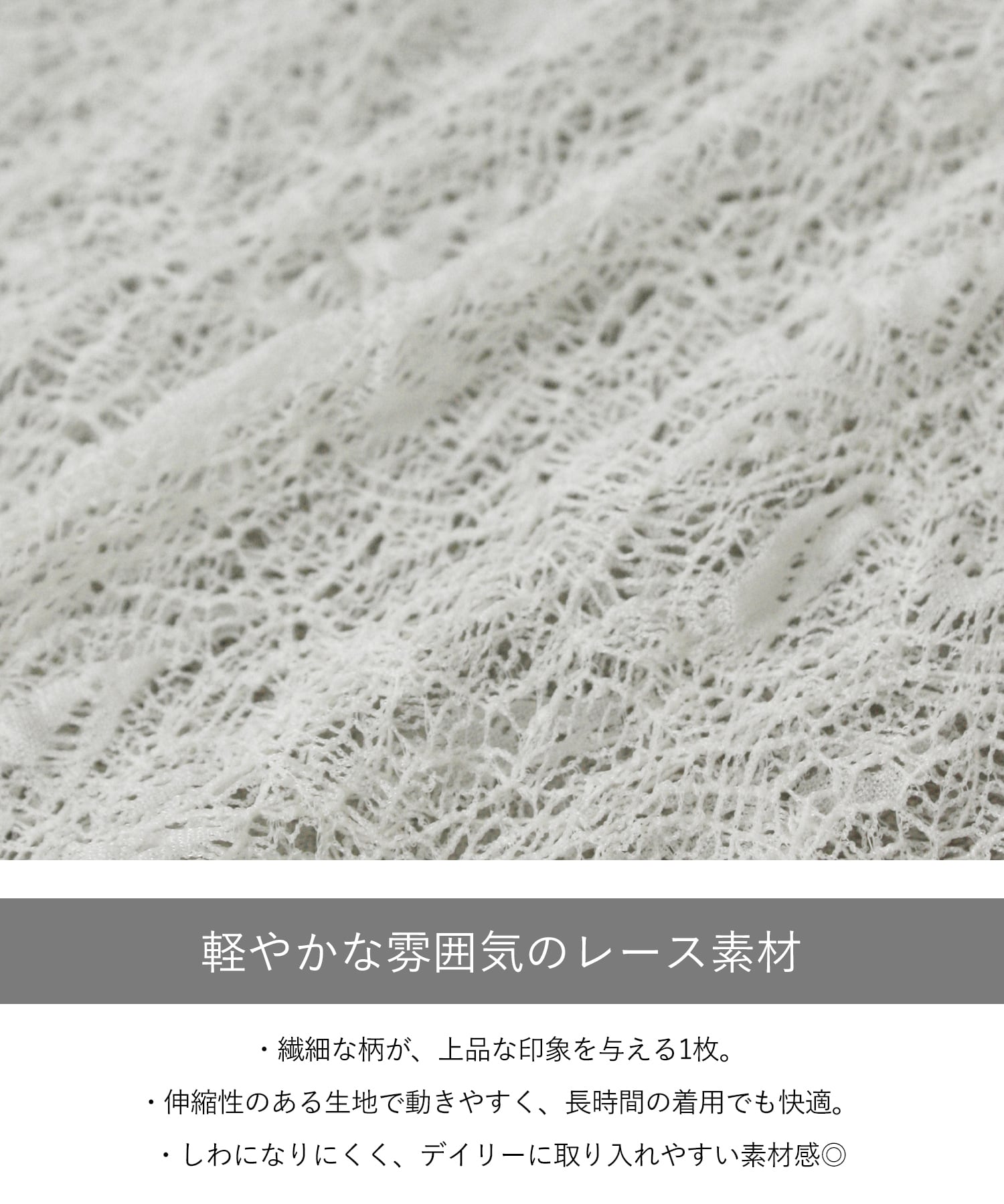 ナイロン90%・ポリエステル10%の軽やかなレース素材を使用。
