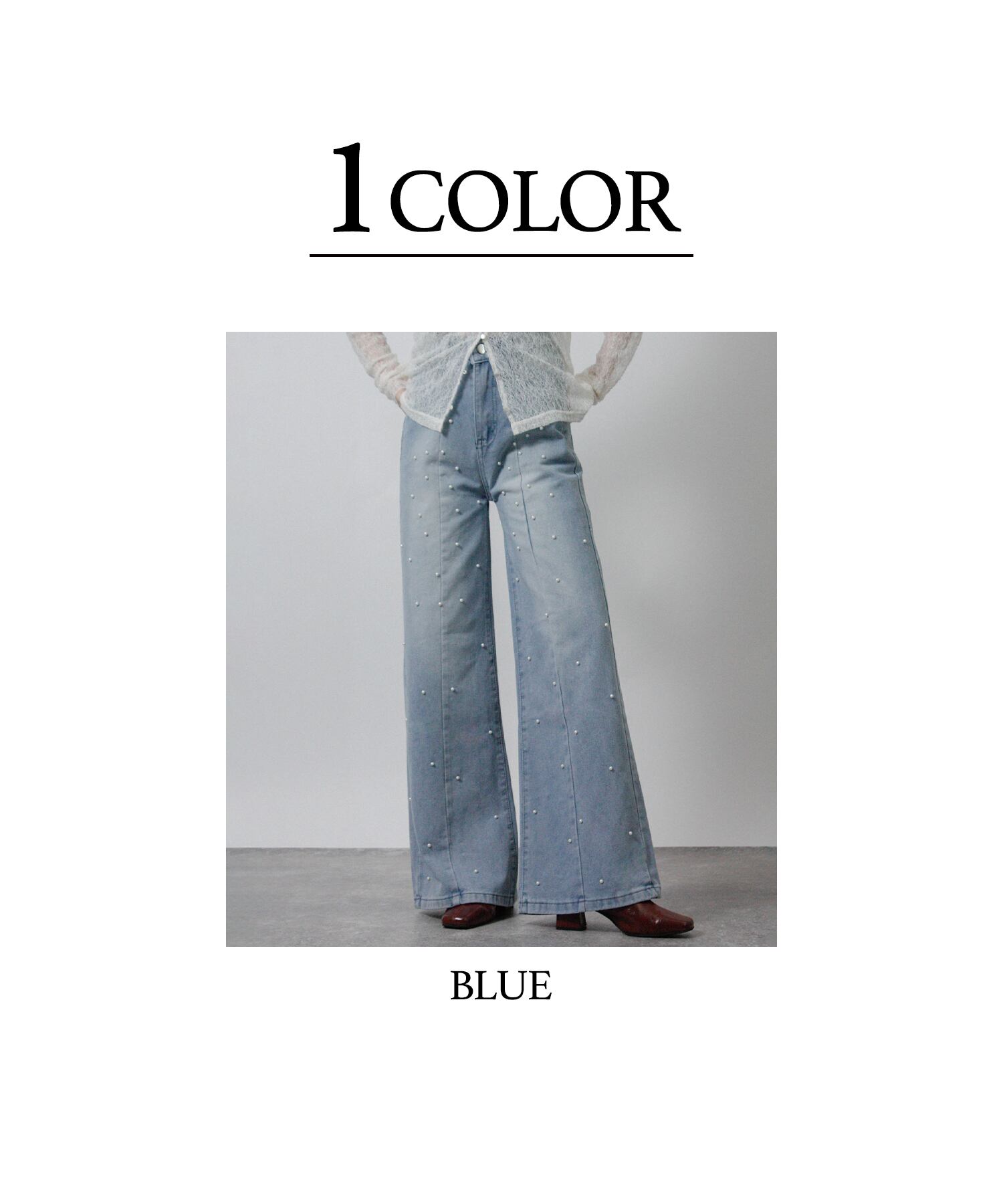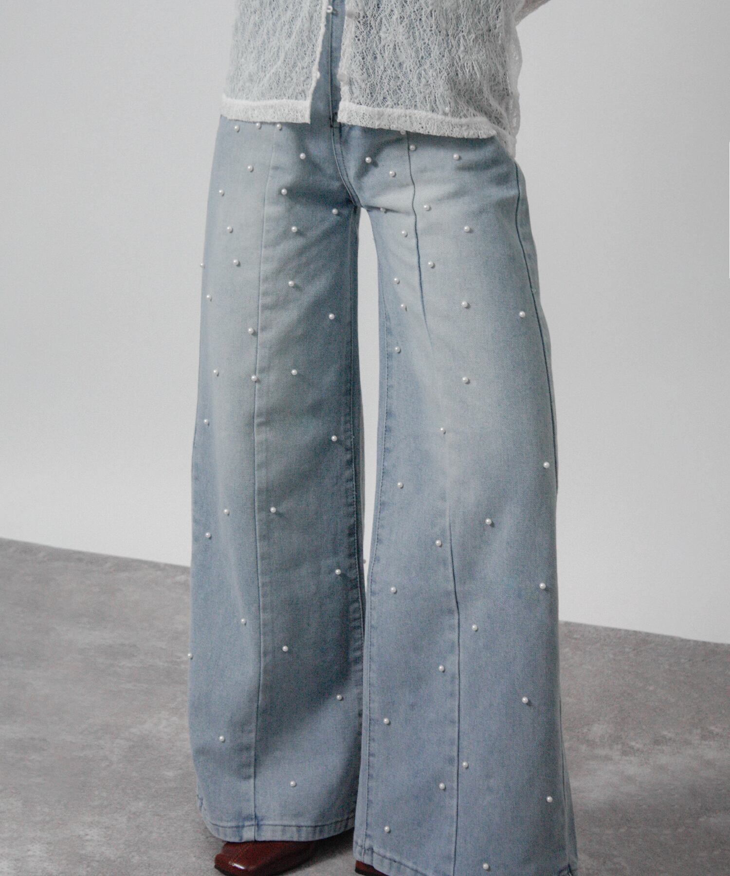 すっきりとしたストレートシルエットに、前後へ散りばめたパールがさりげない華やかさを添える一本。