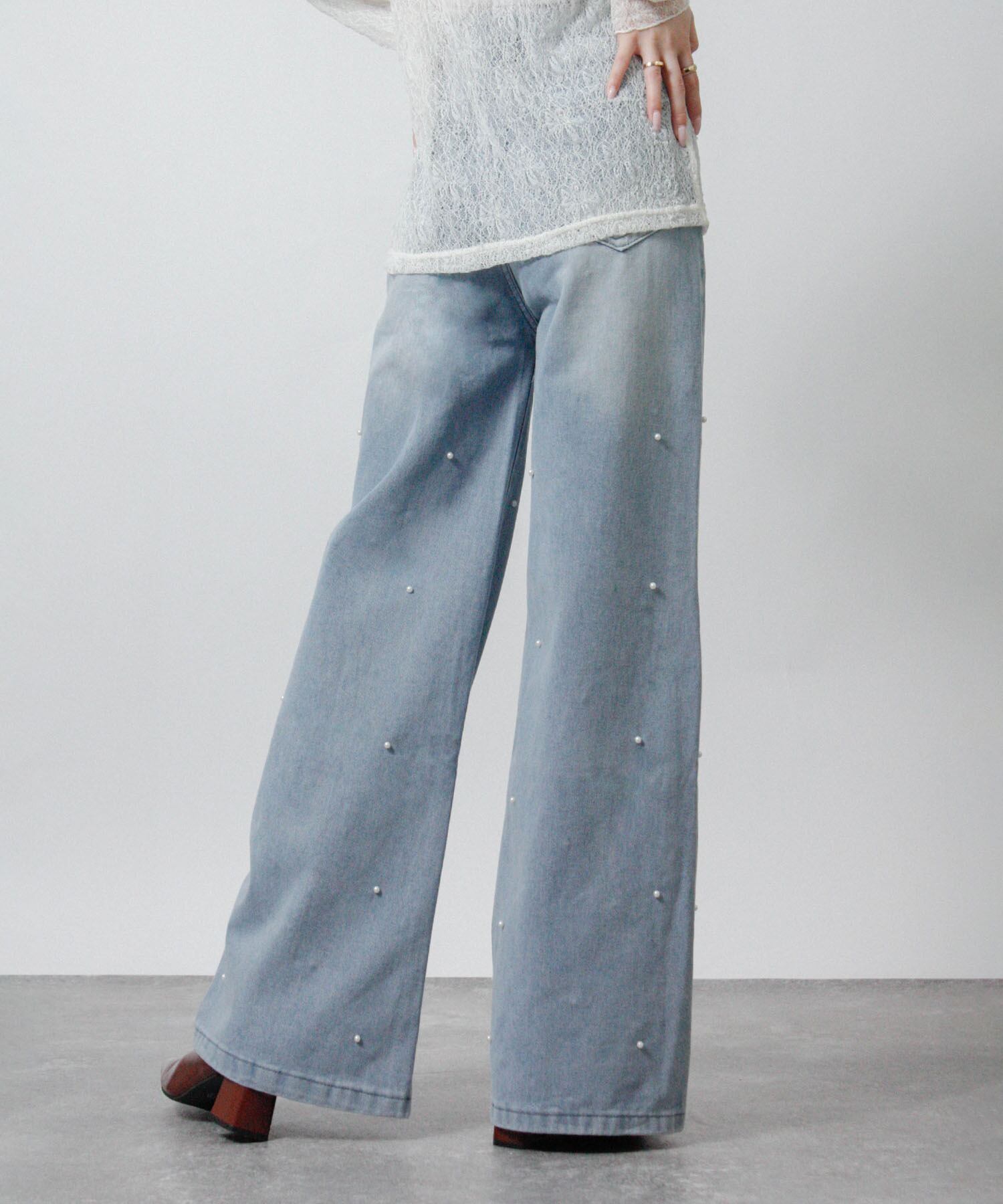 レディース デニムパンツ パール付きデニム パール きれいめデニム ストレートデニム 美脚デニム デザインデニム デニムコーデ 上品 華やか 大人カジュアル