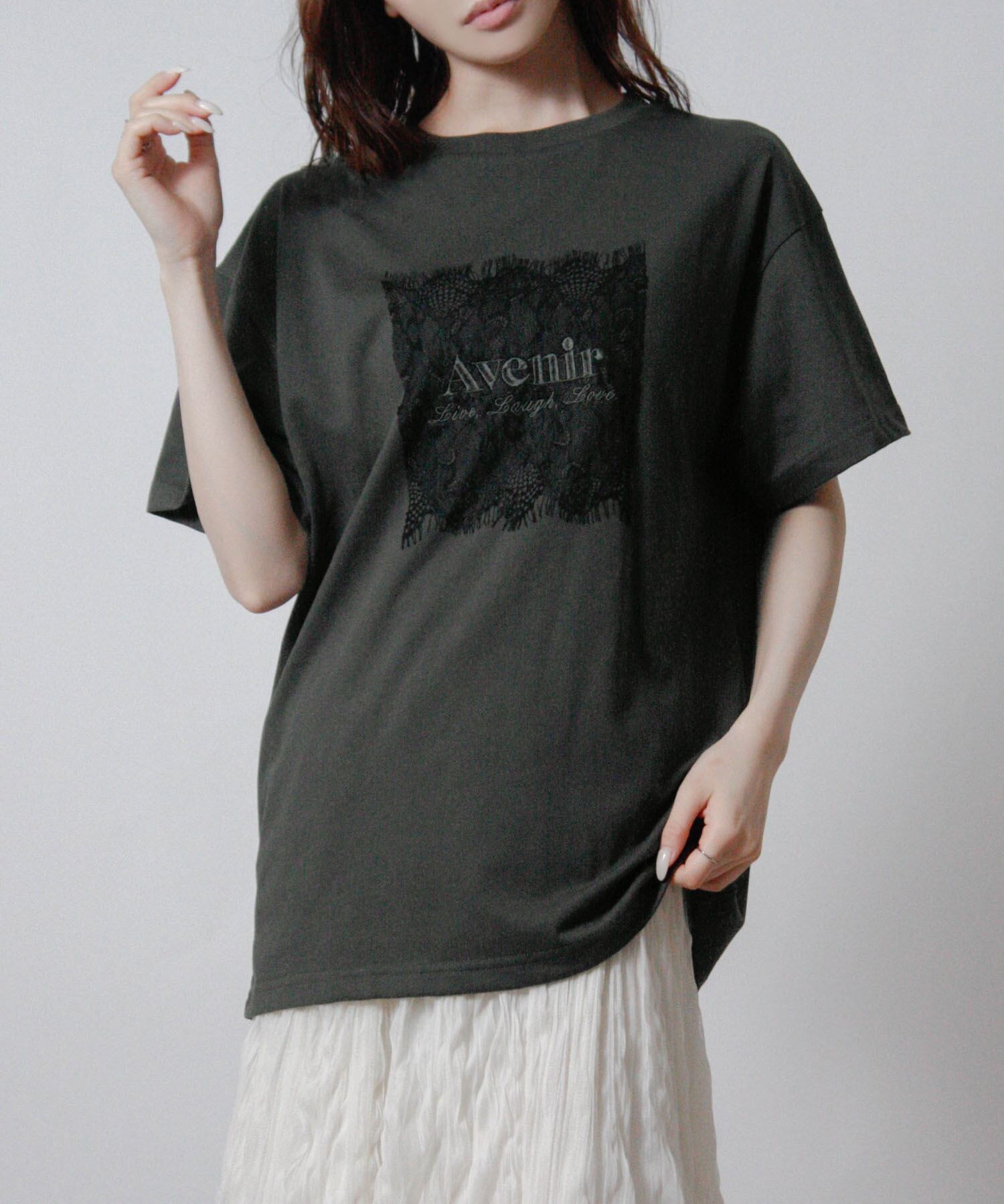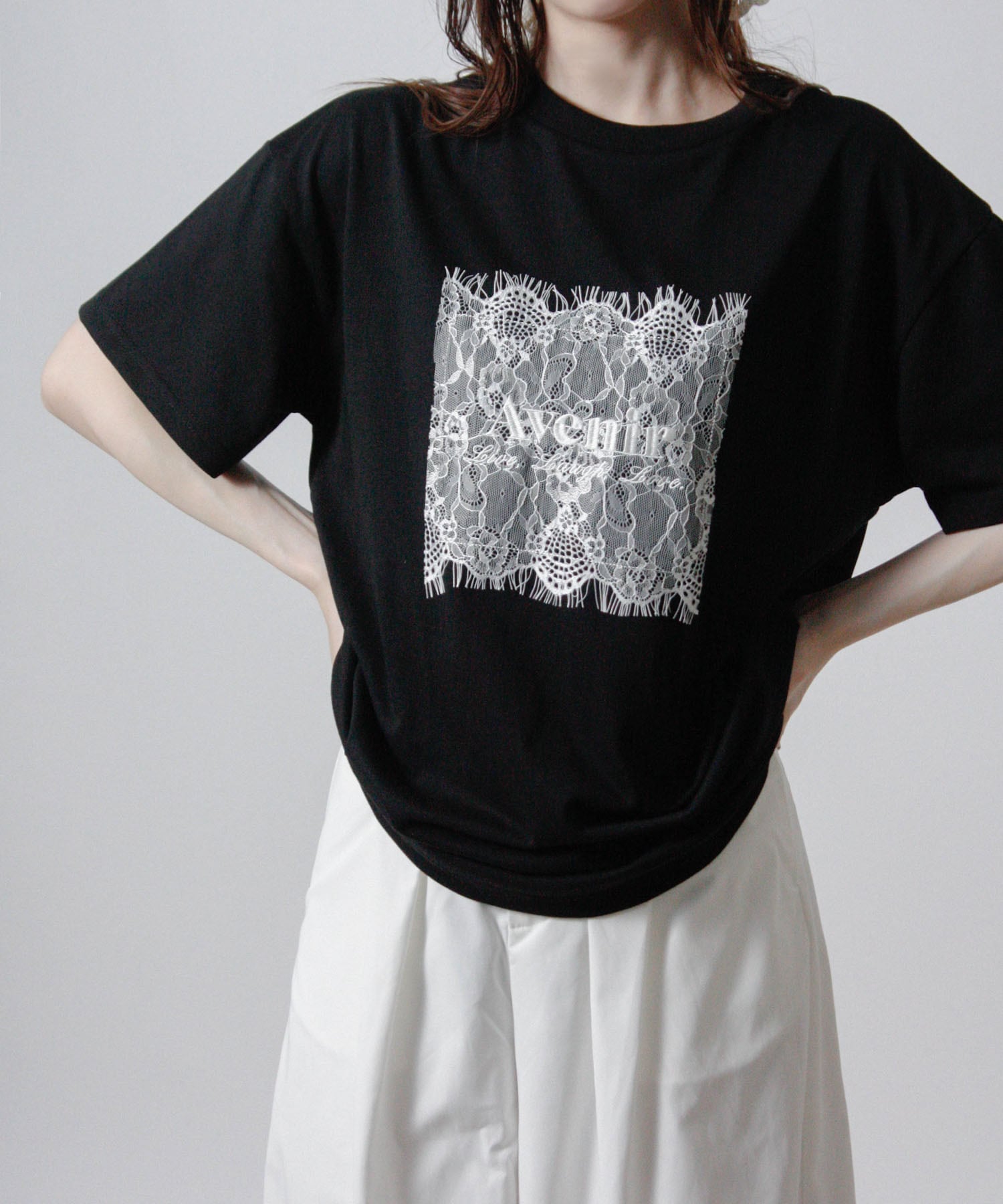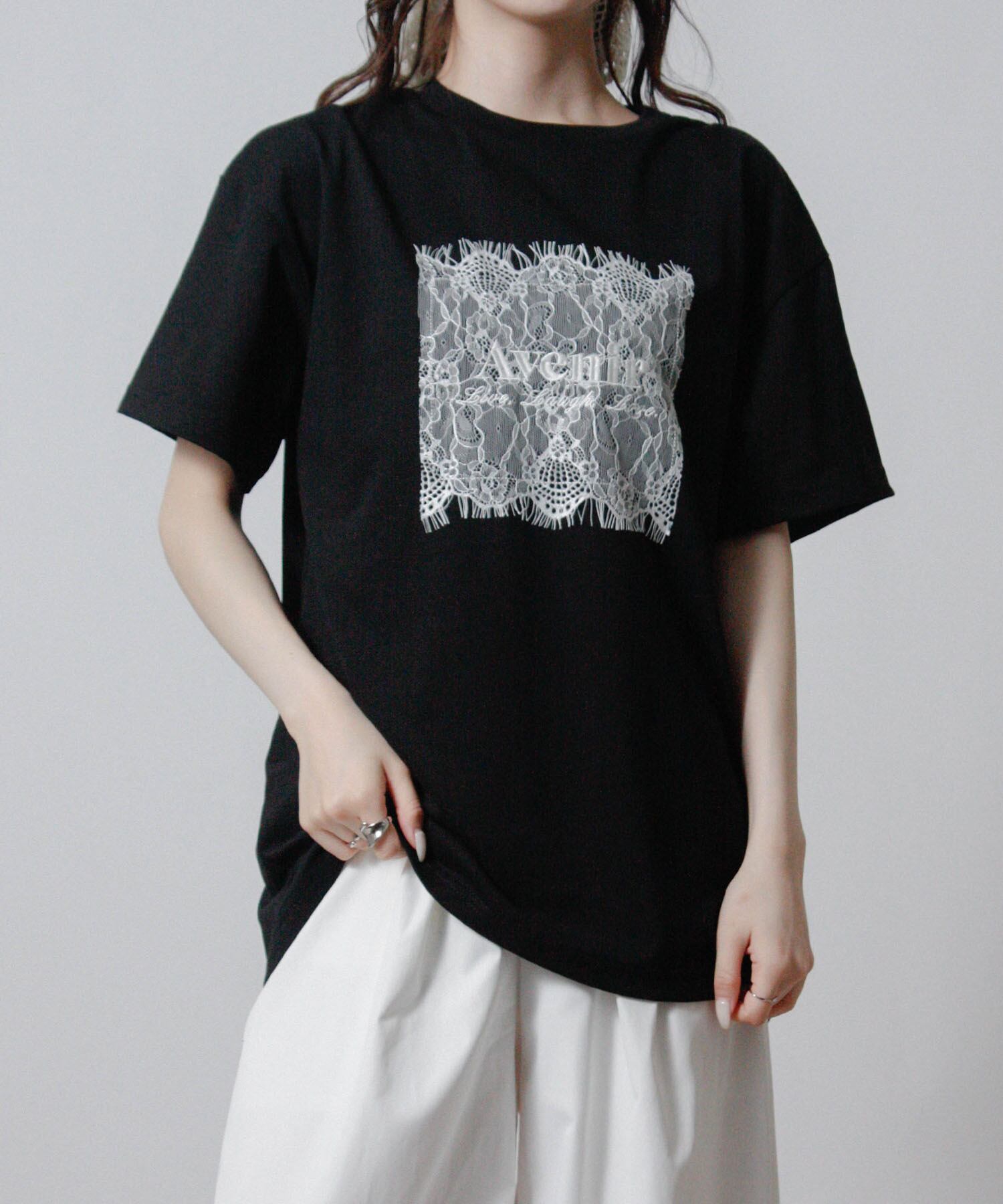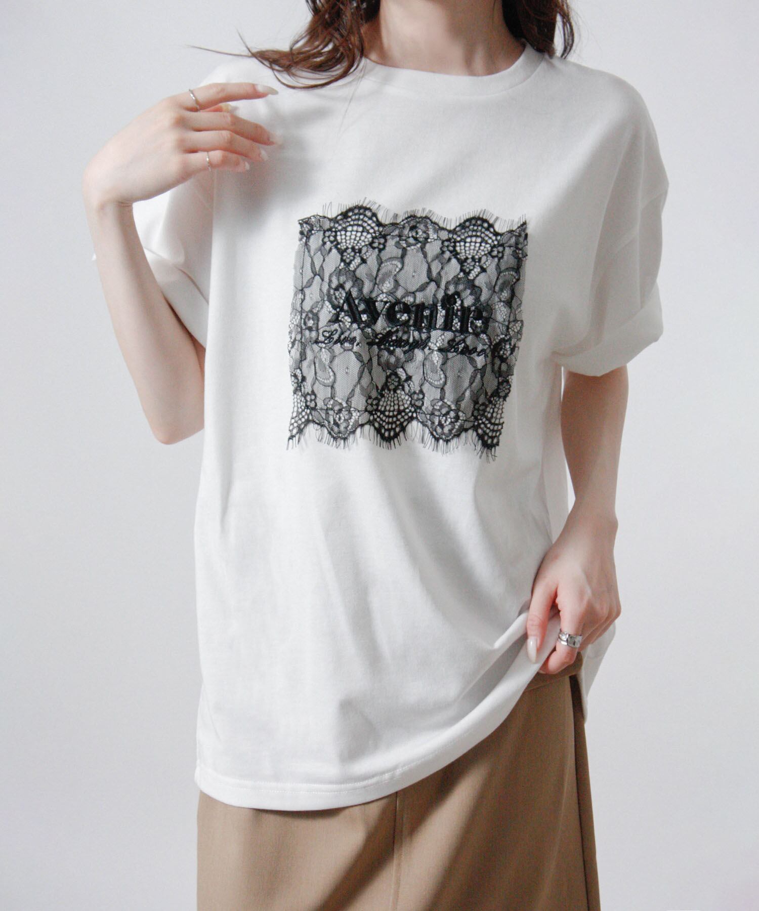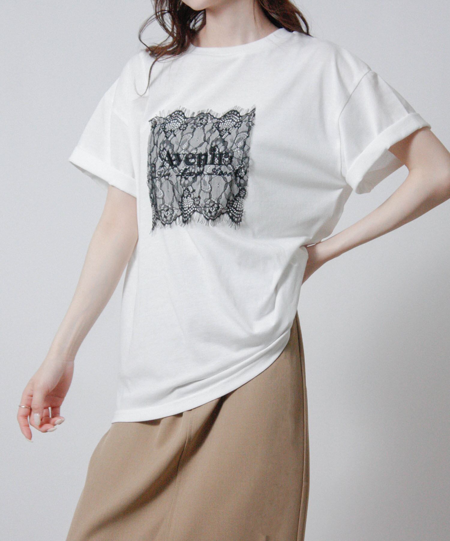ベーシックなTシャツにレースとロゴ刺繍を重ねた、上品さを感じる一枚です。