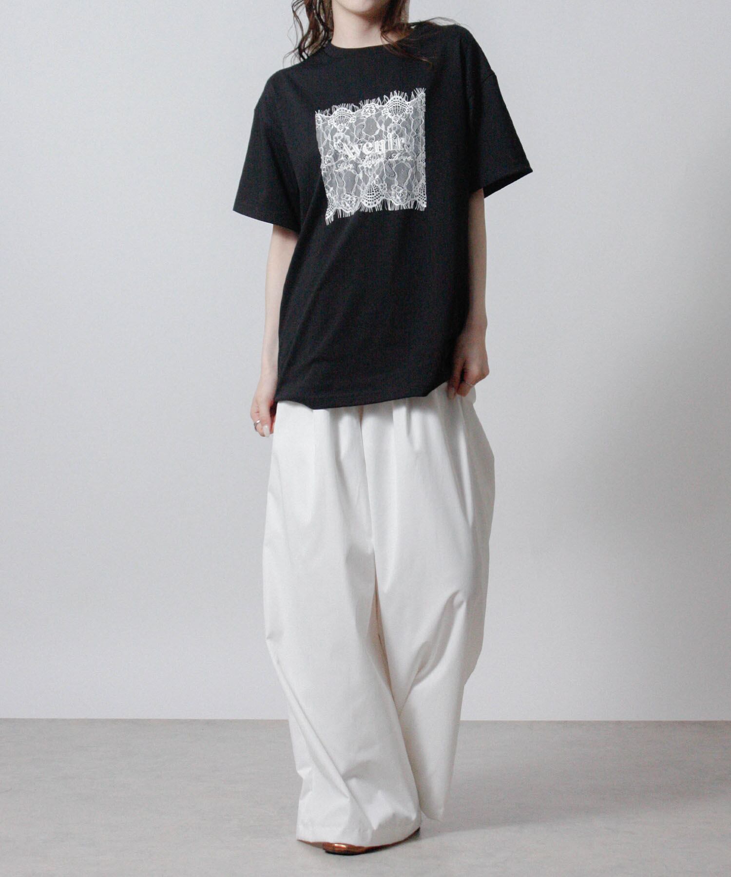 レースの重なりがシンプルなTシャツに奥行きをプラスし、さりげないアクセントになっています。