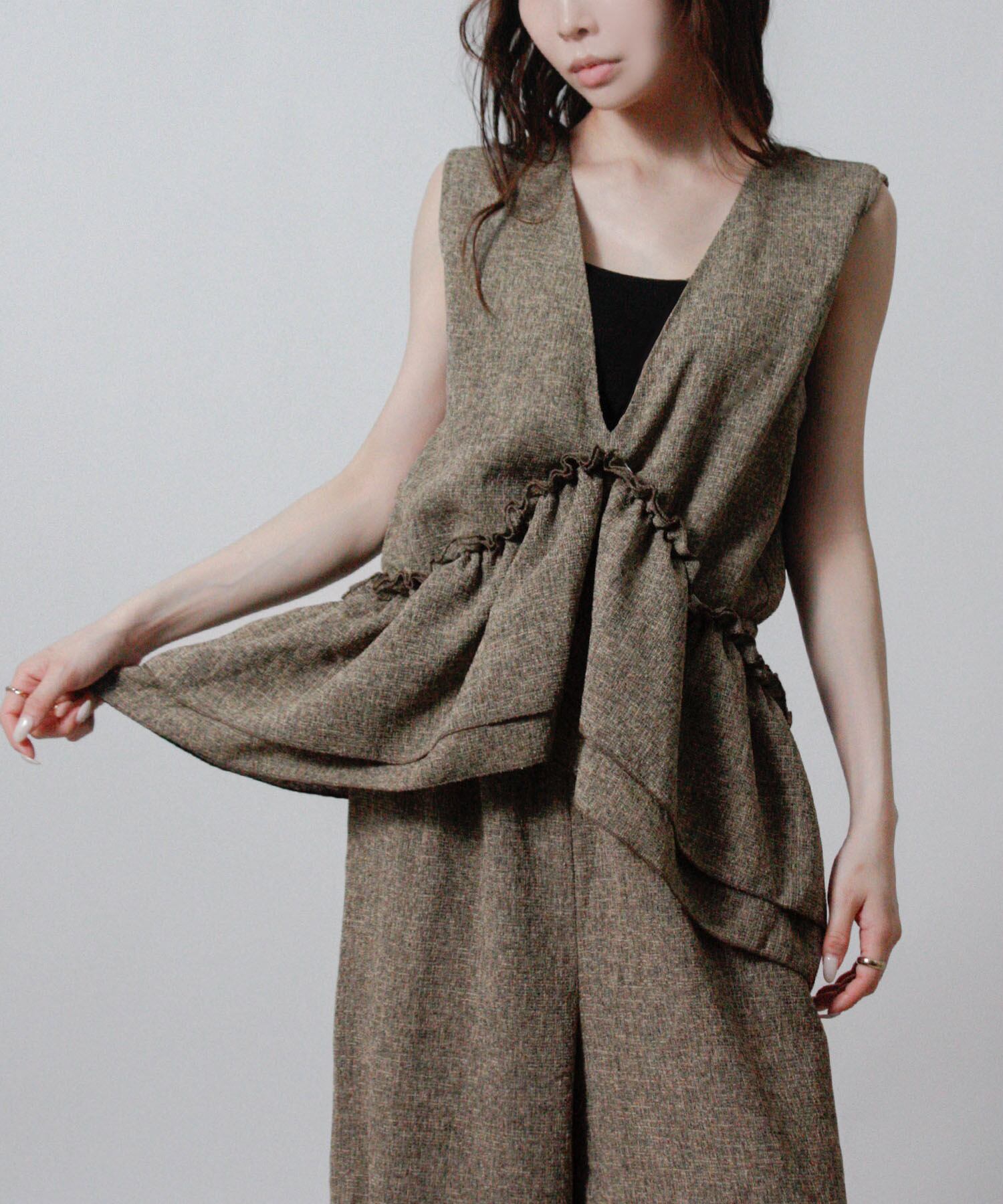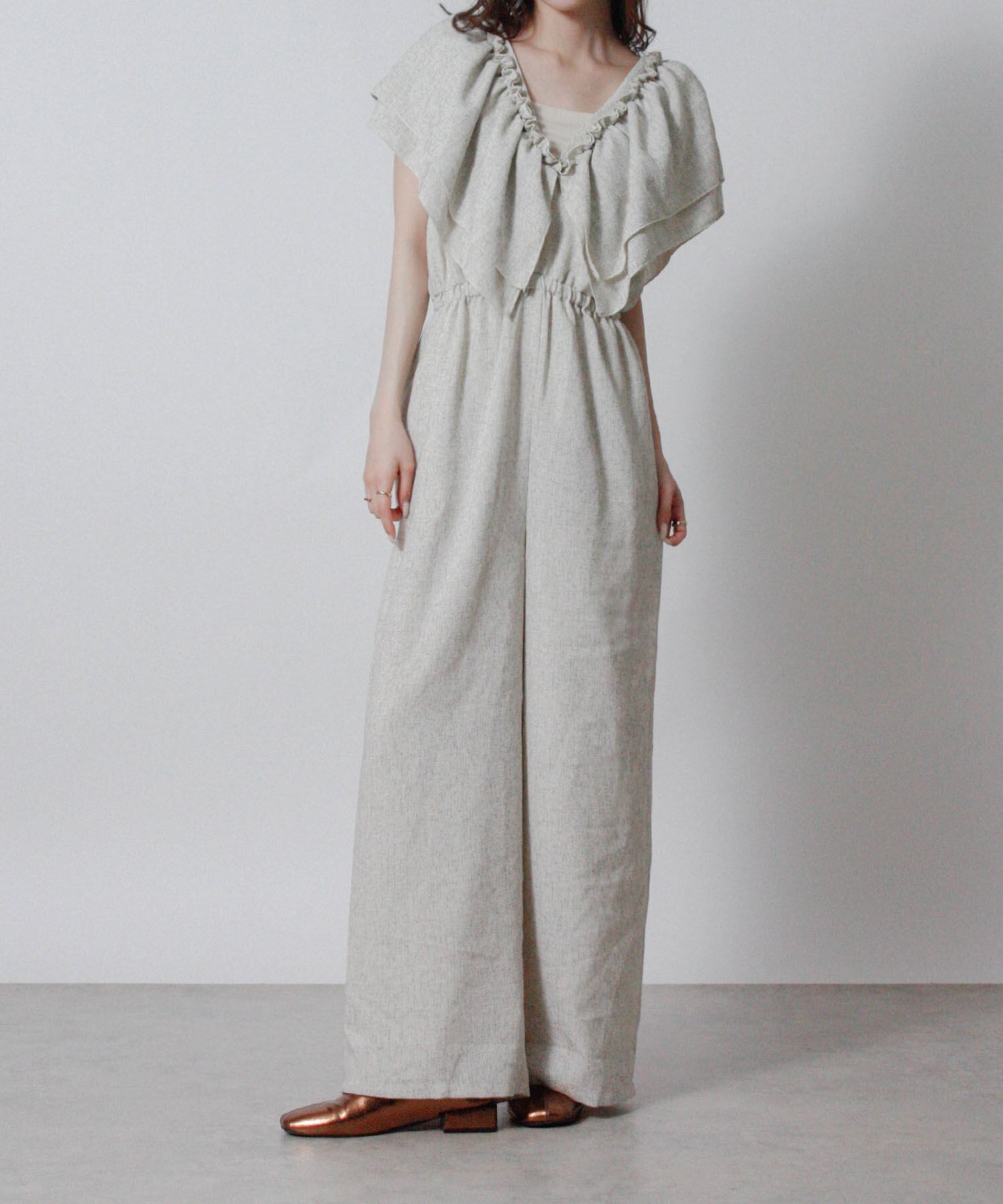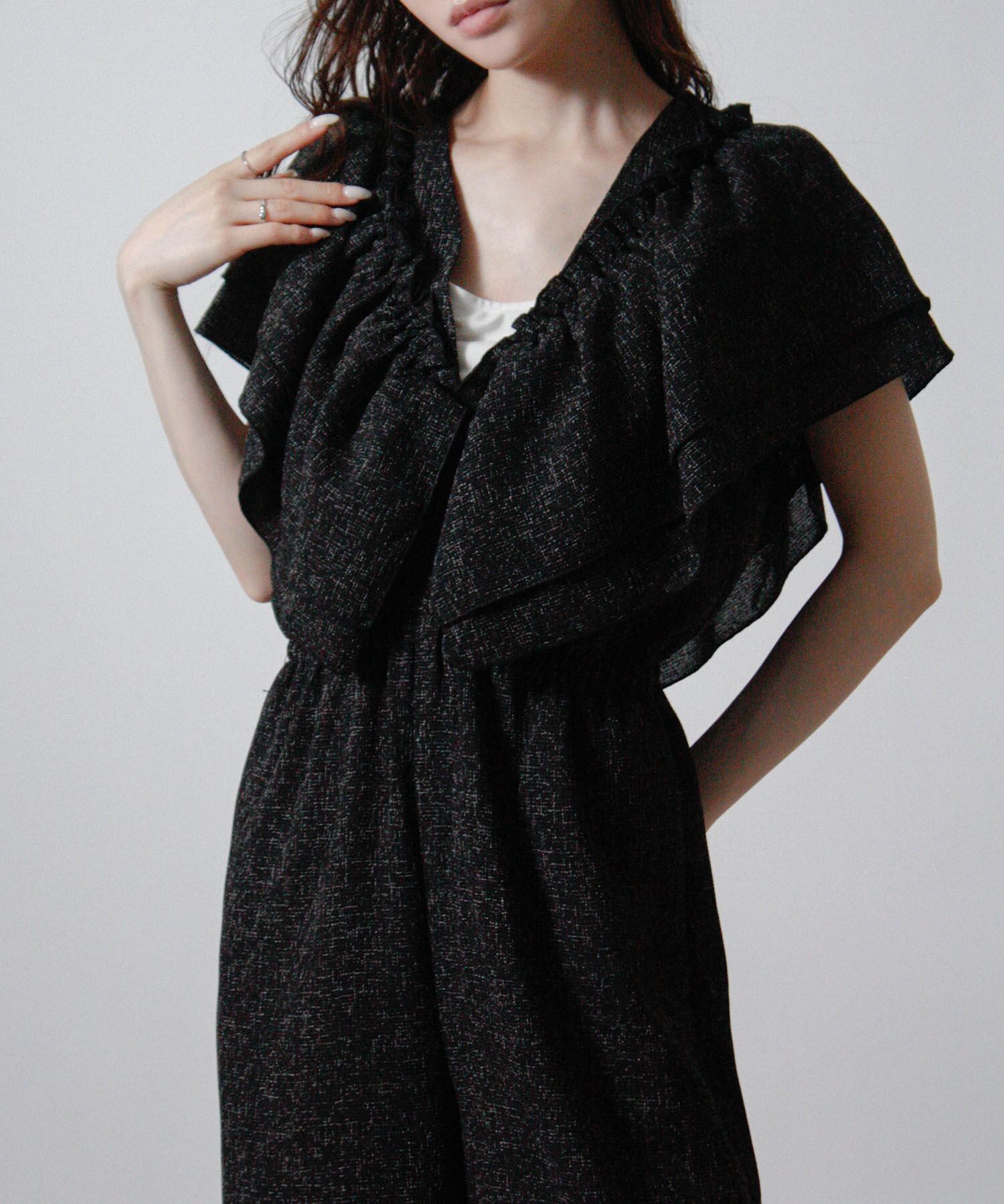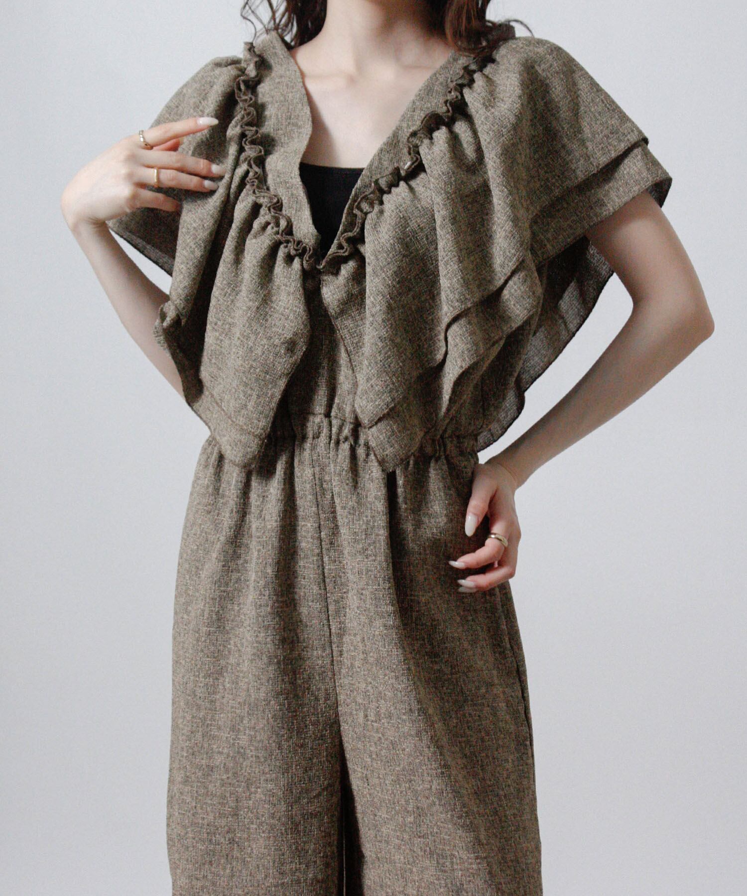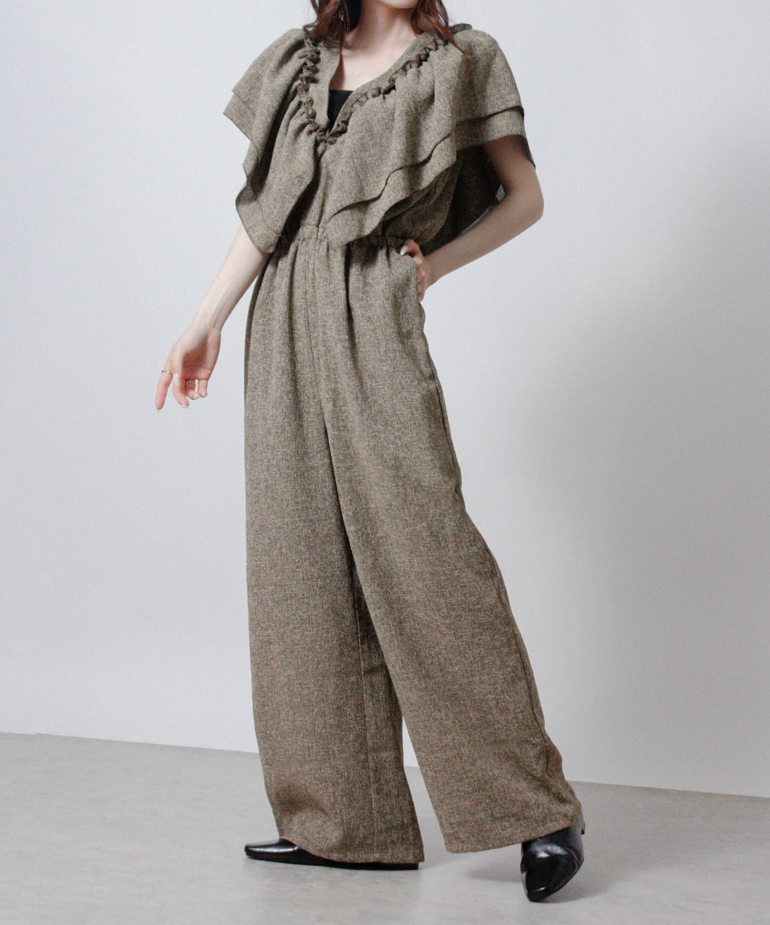 上品なツイード素材に、華やかなフリルをあしらったオールインワン。