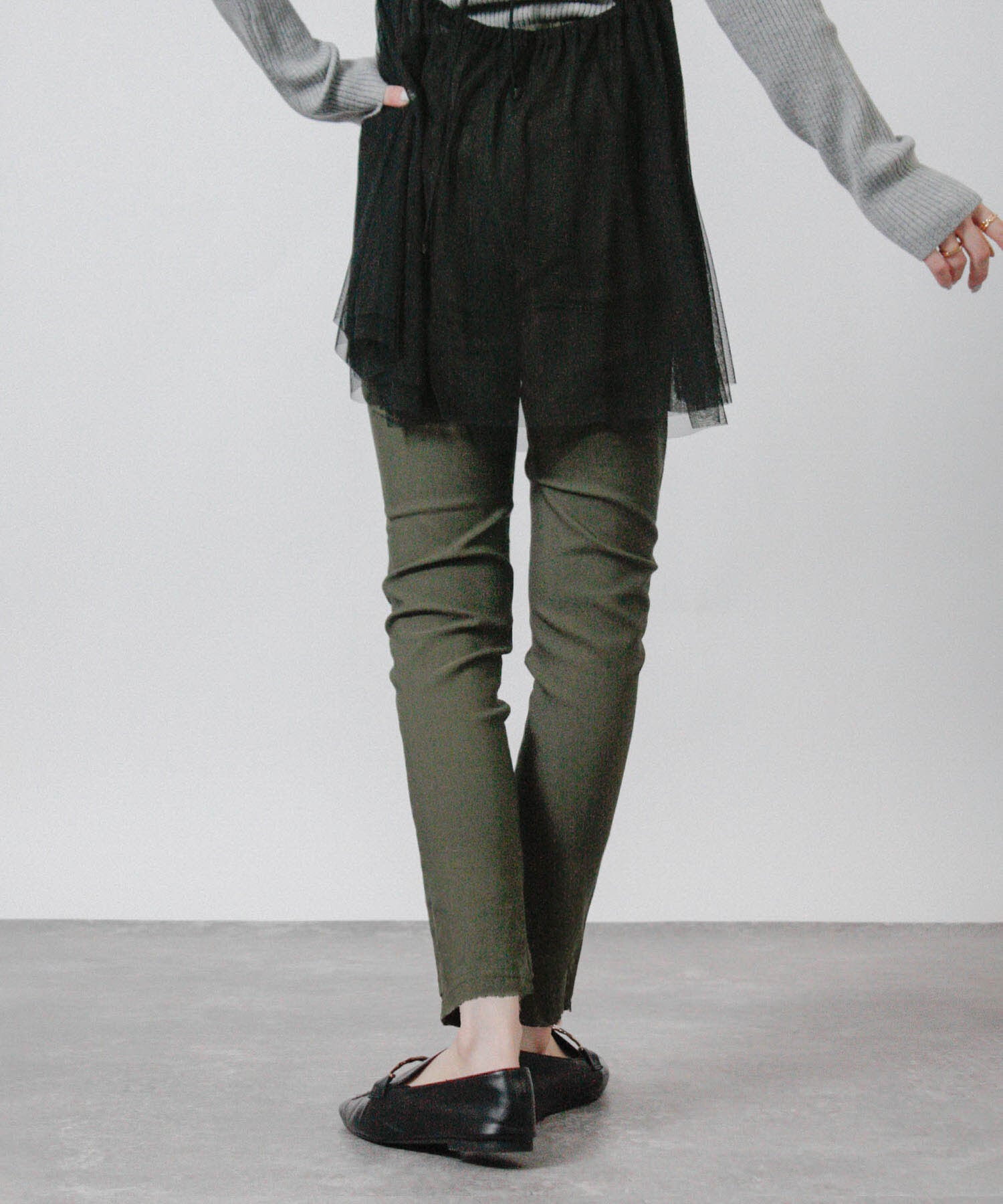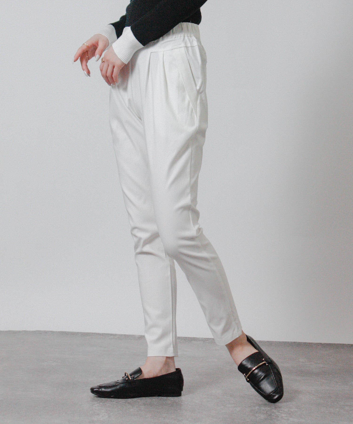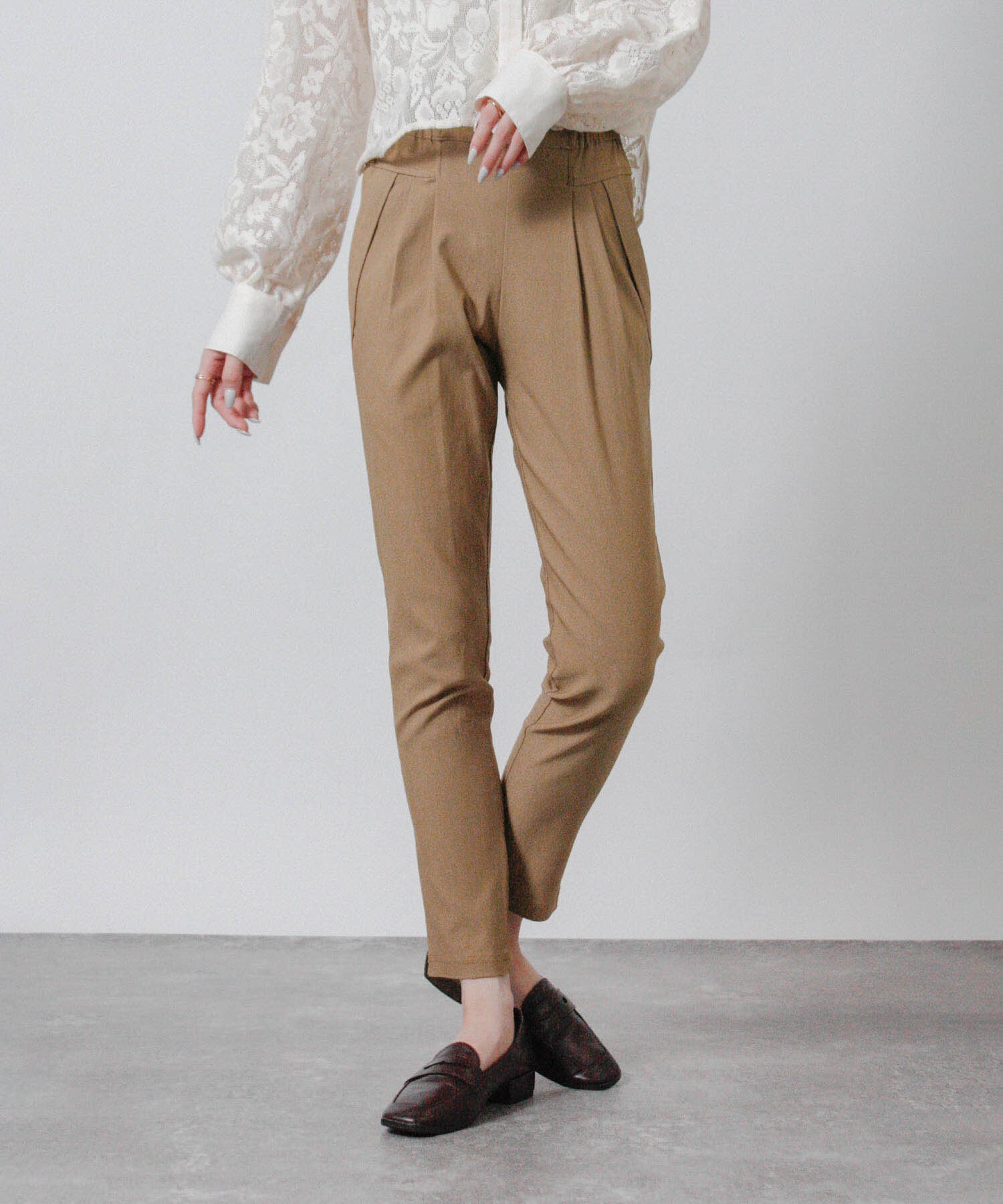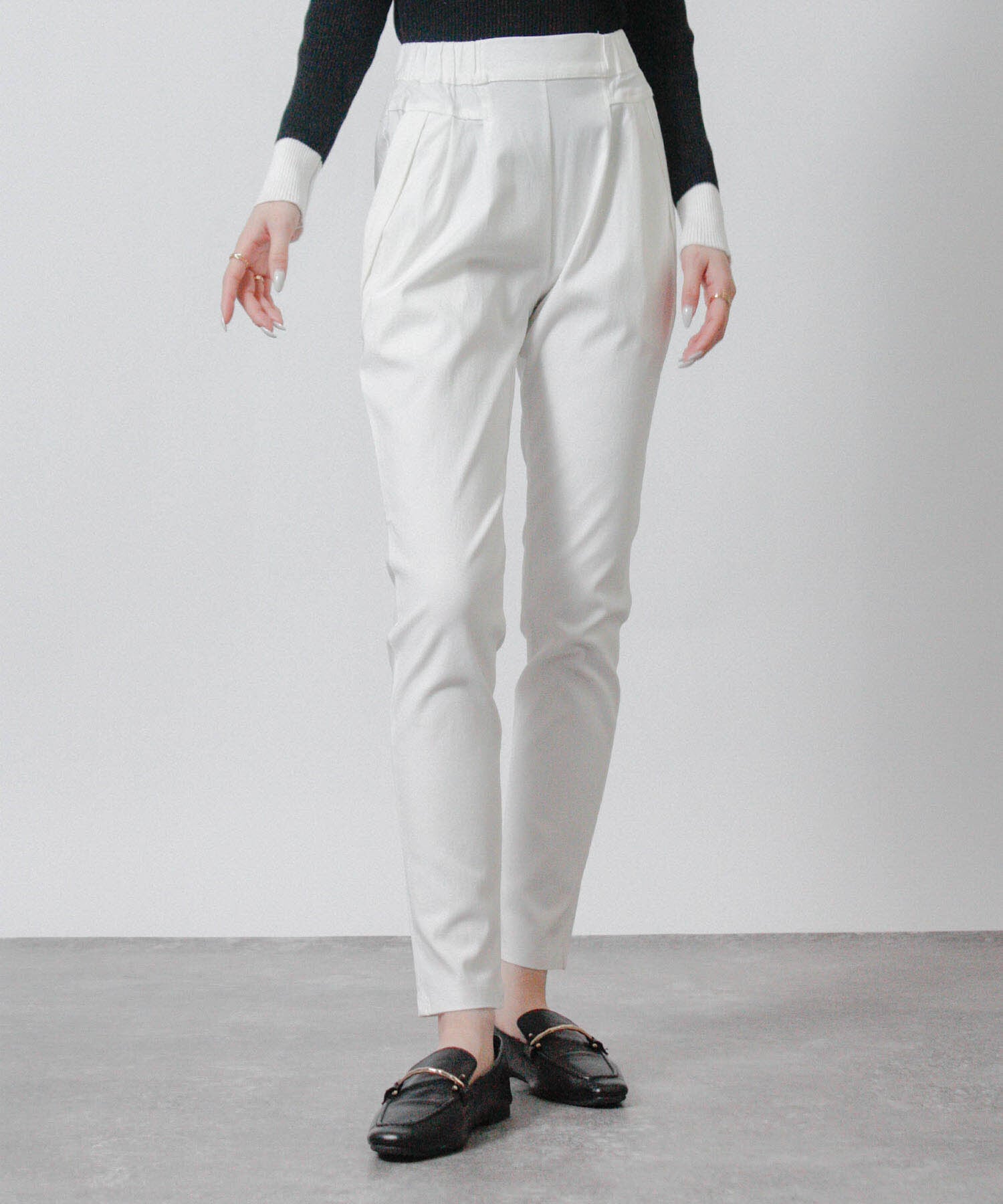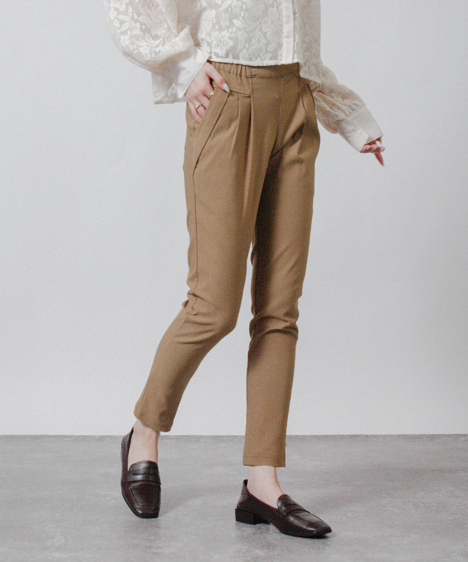 ウエストゴムでゆったりなのにすっきりスリムみえる。穿くだけで美脚が完成。