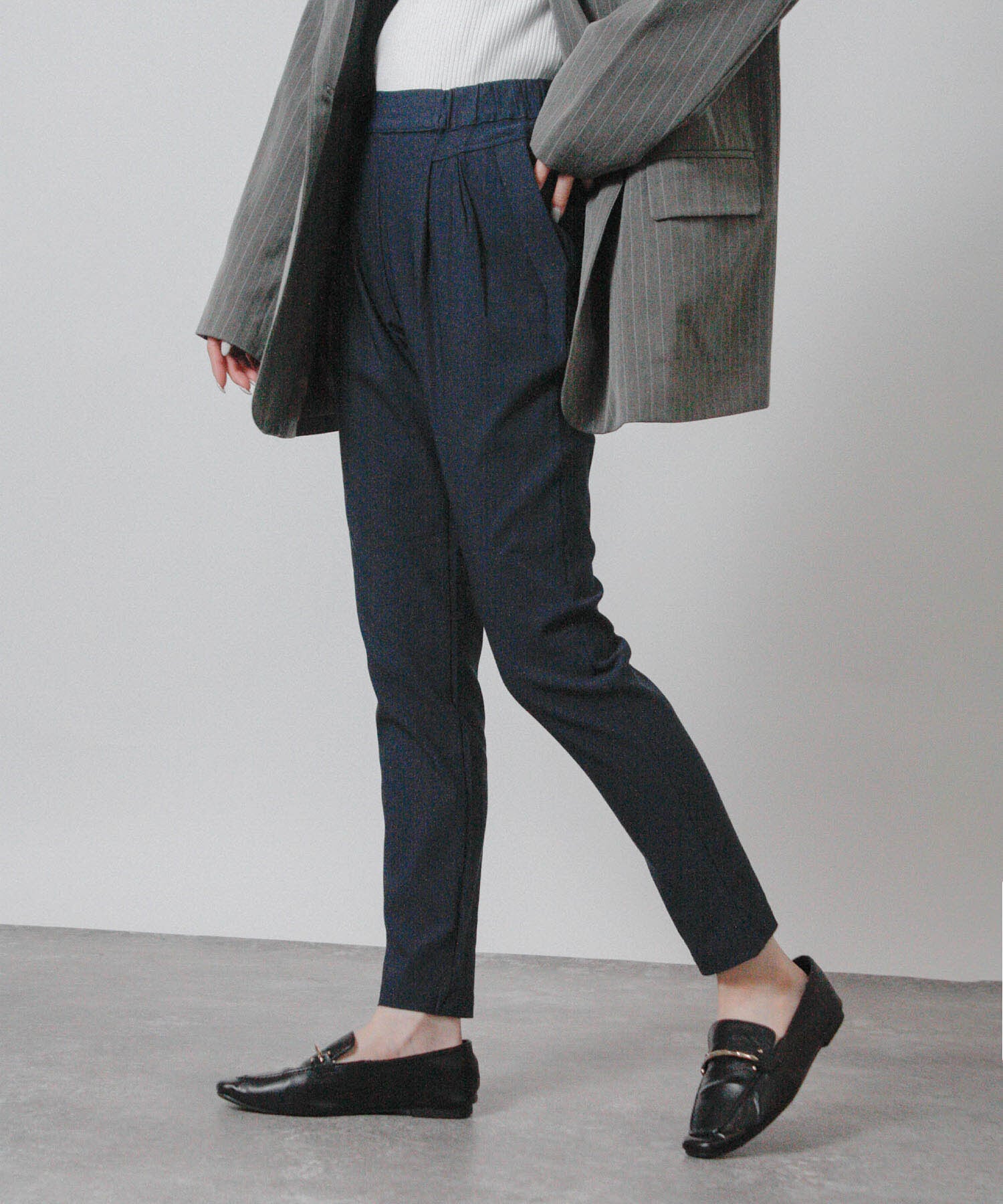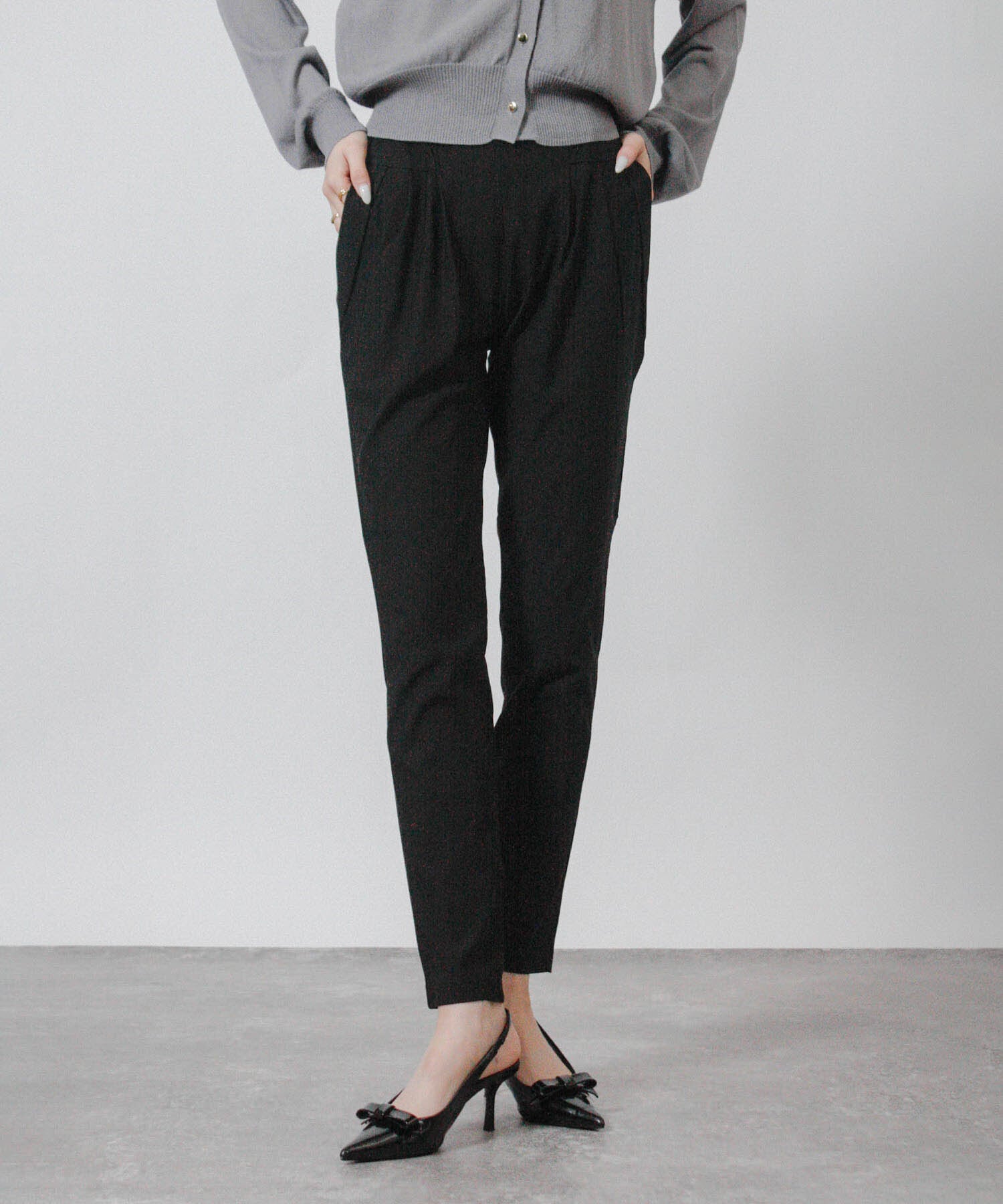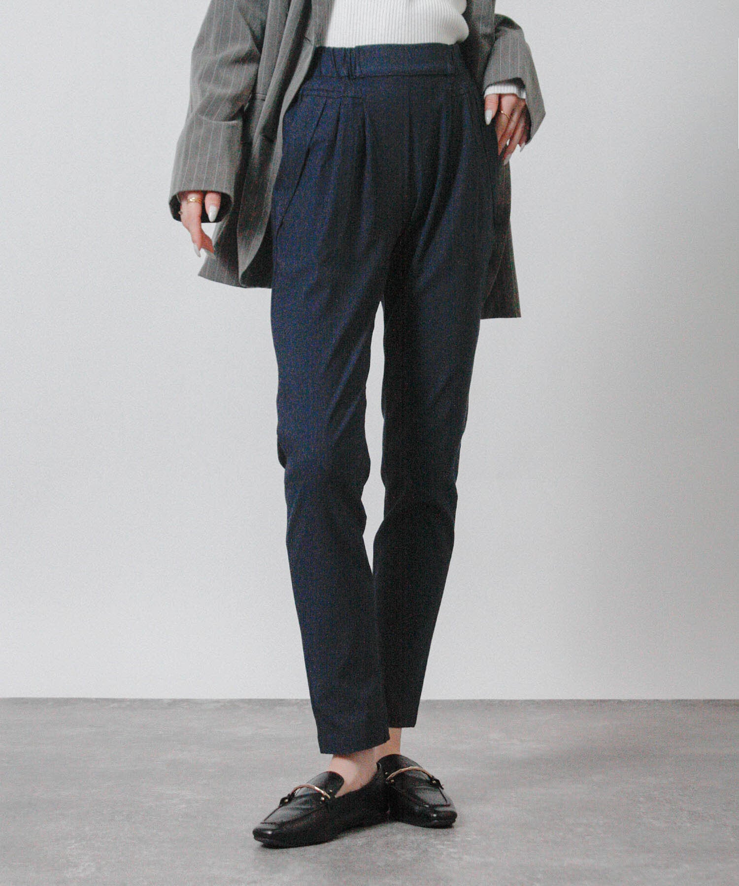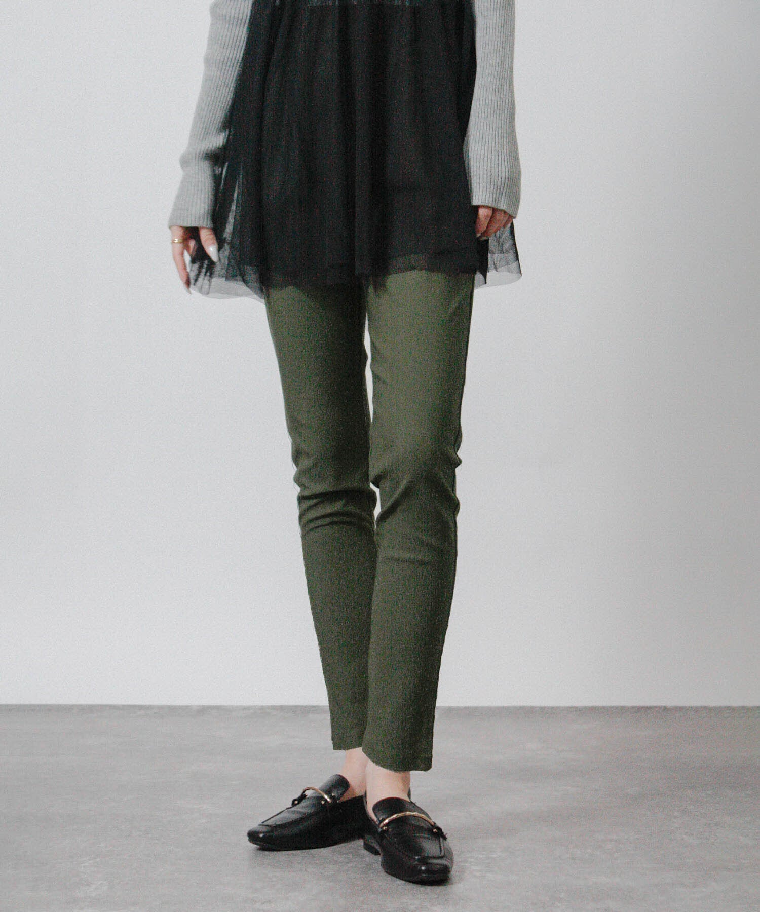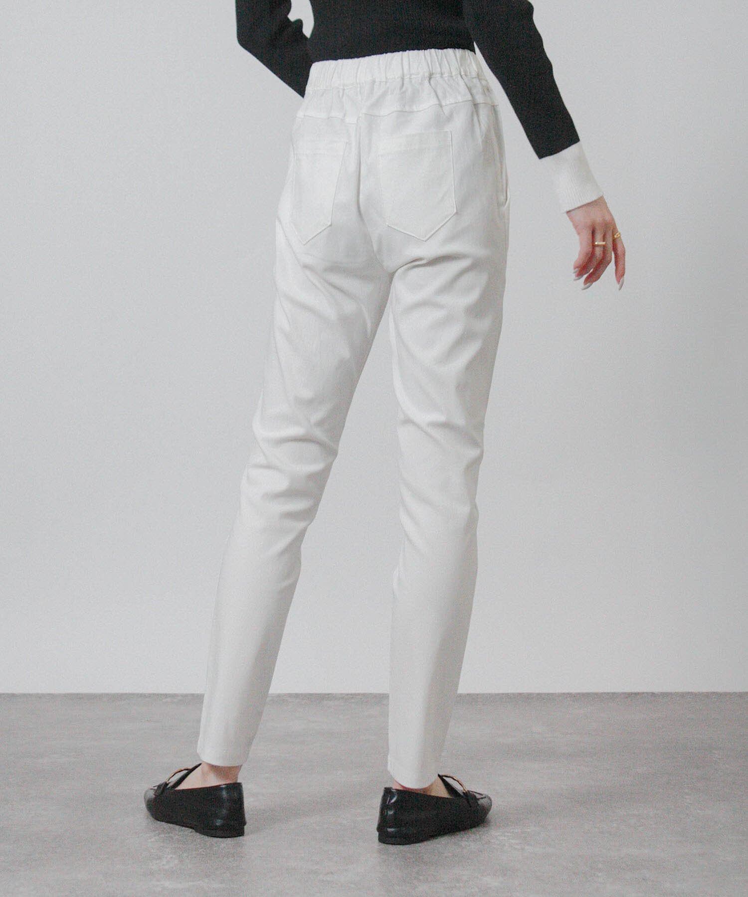 ウエストゴムでゆったりなのにすっきりスリムみえる。穿くだけで美脚が完成。