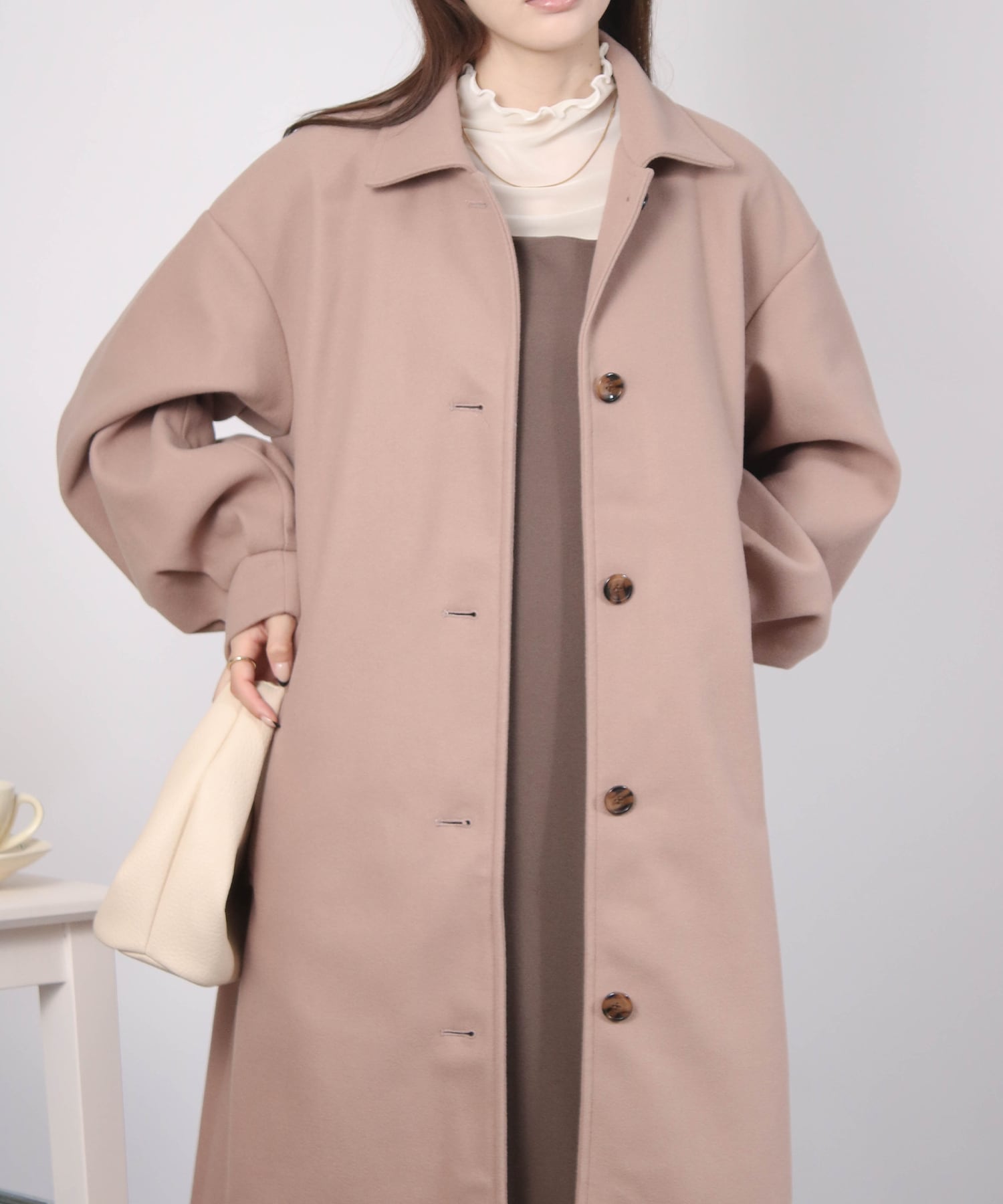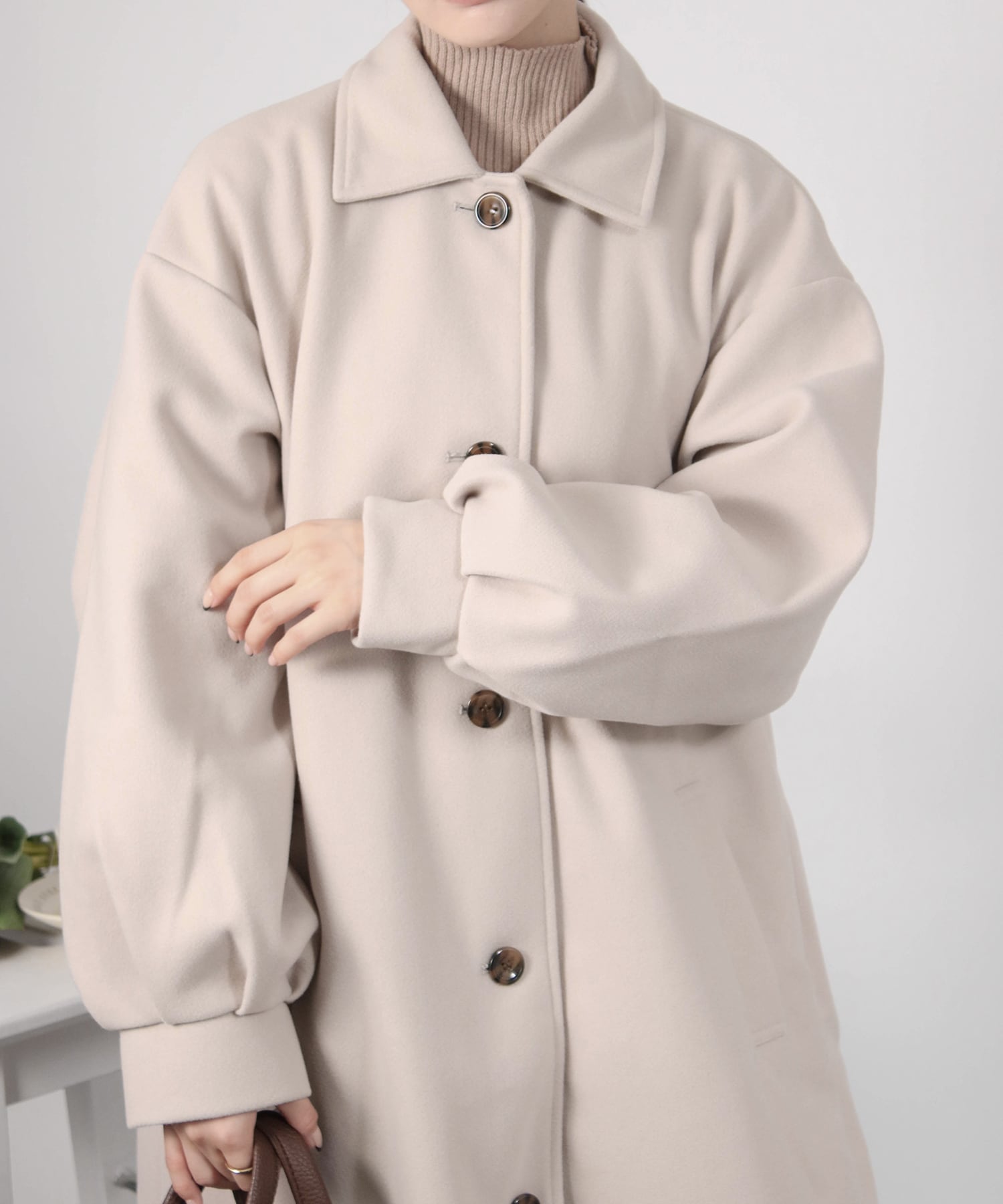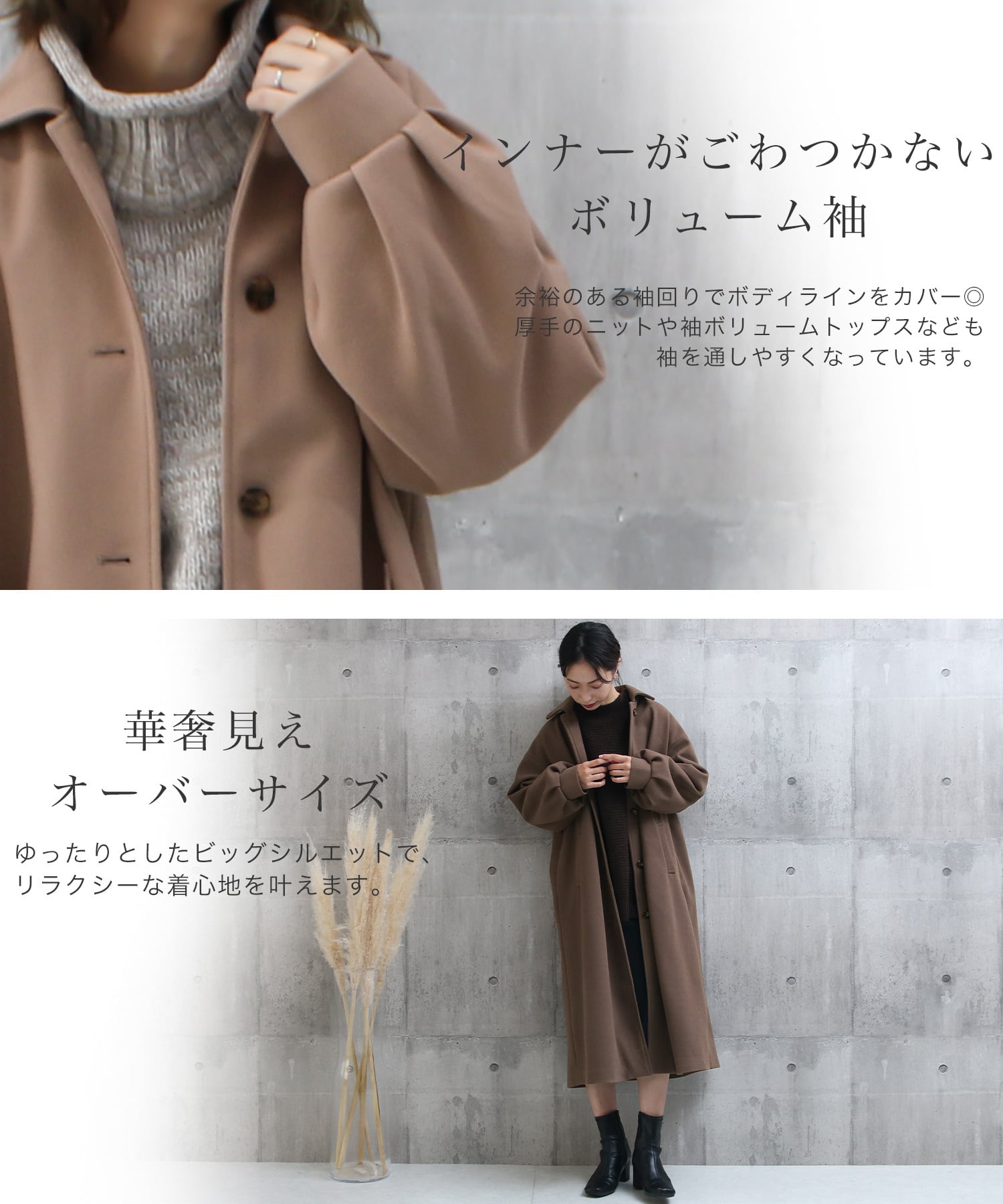 首元が暖かいステンカラーの大きめ襟がマニッシュな印象