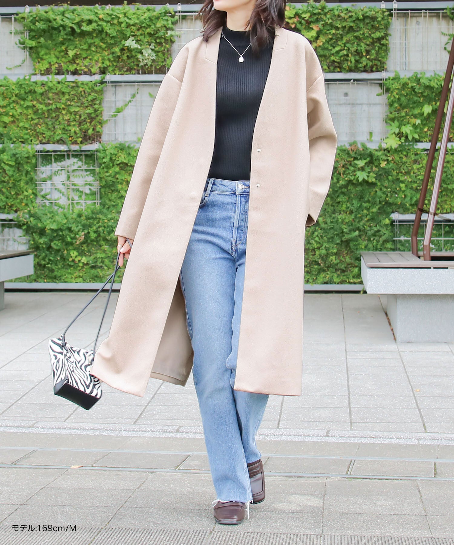重たくなりがちなロングコートに深めのサイドスリットを施