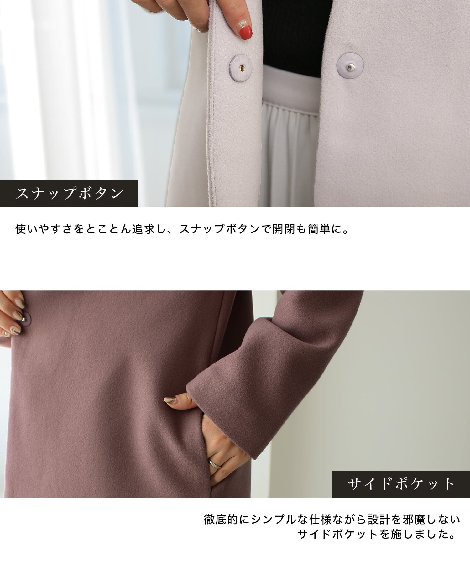 使いやすさをとことん追求し、スナップボタンで開閉も簡単に。