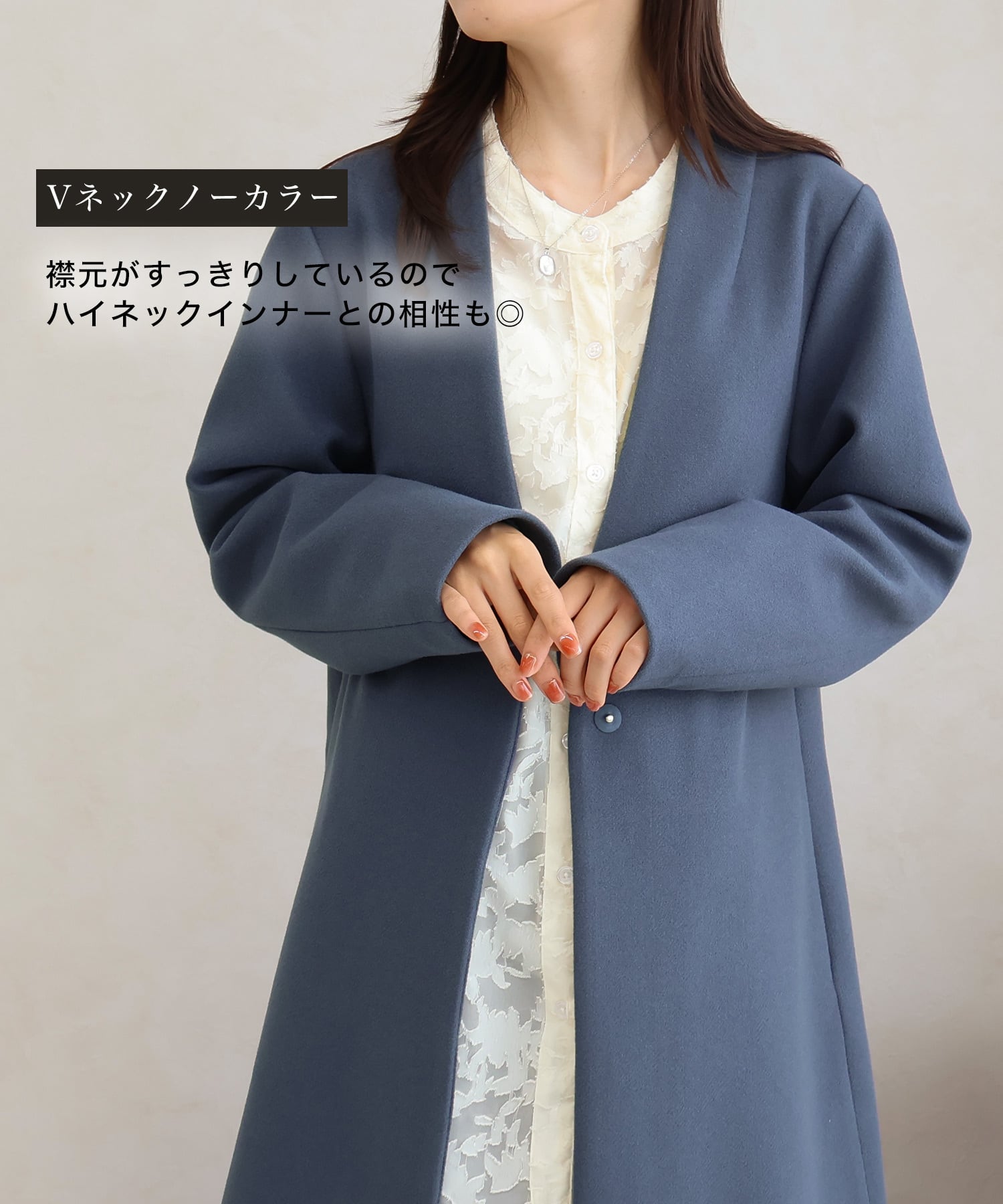 襟元スッキリVネックノーカラーのシンプルで使いやすいデザインに仕立てました。