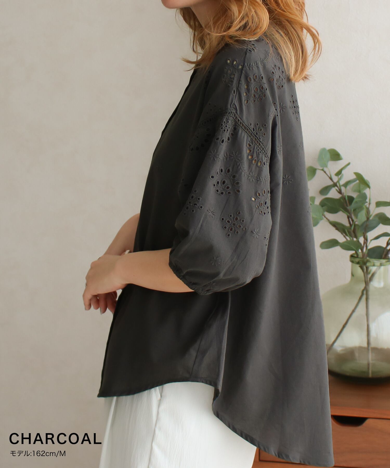 ネック周りから袖にかけて刺繍を施し、刺繍の透け感が涼しげで女性らしい印象に。