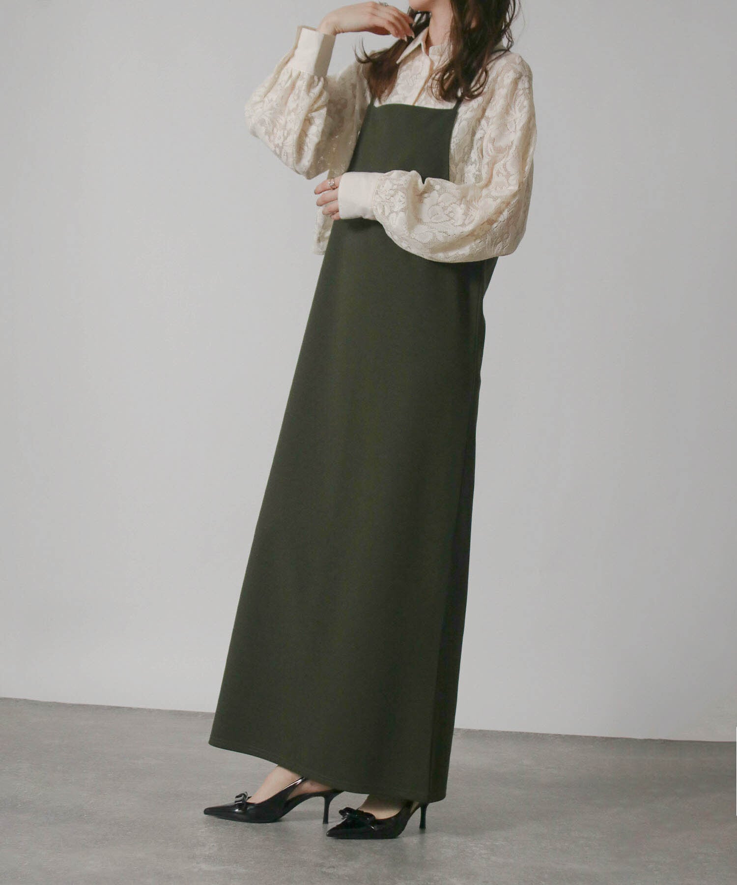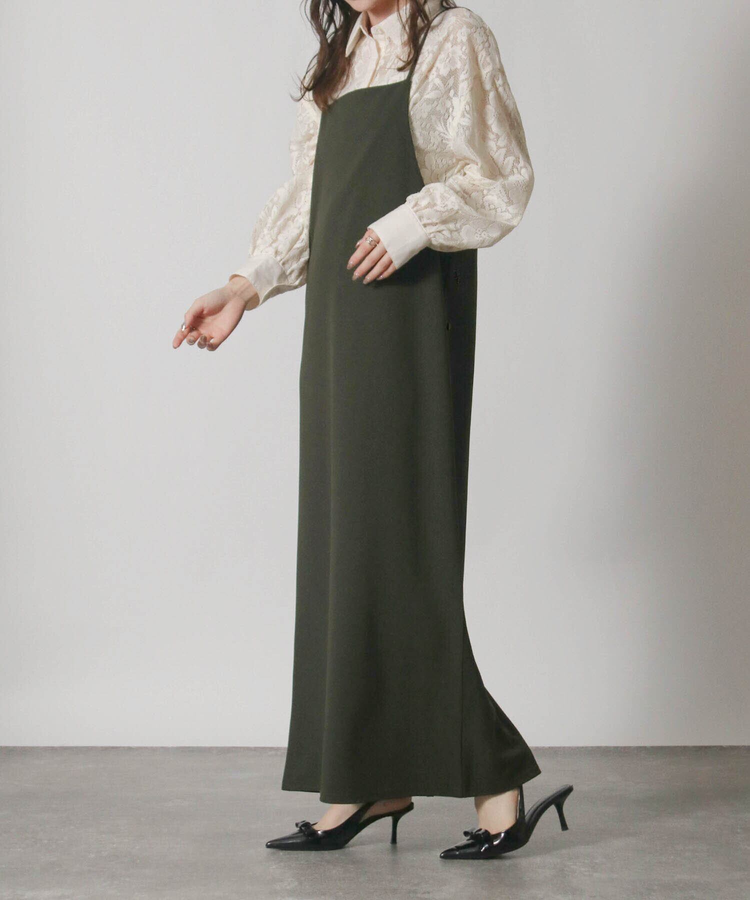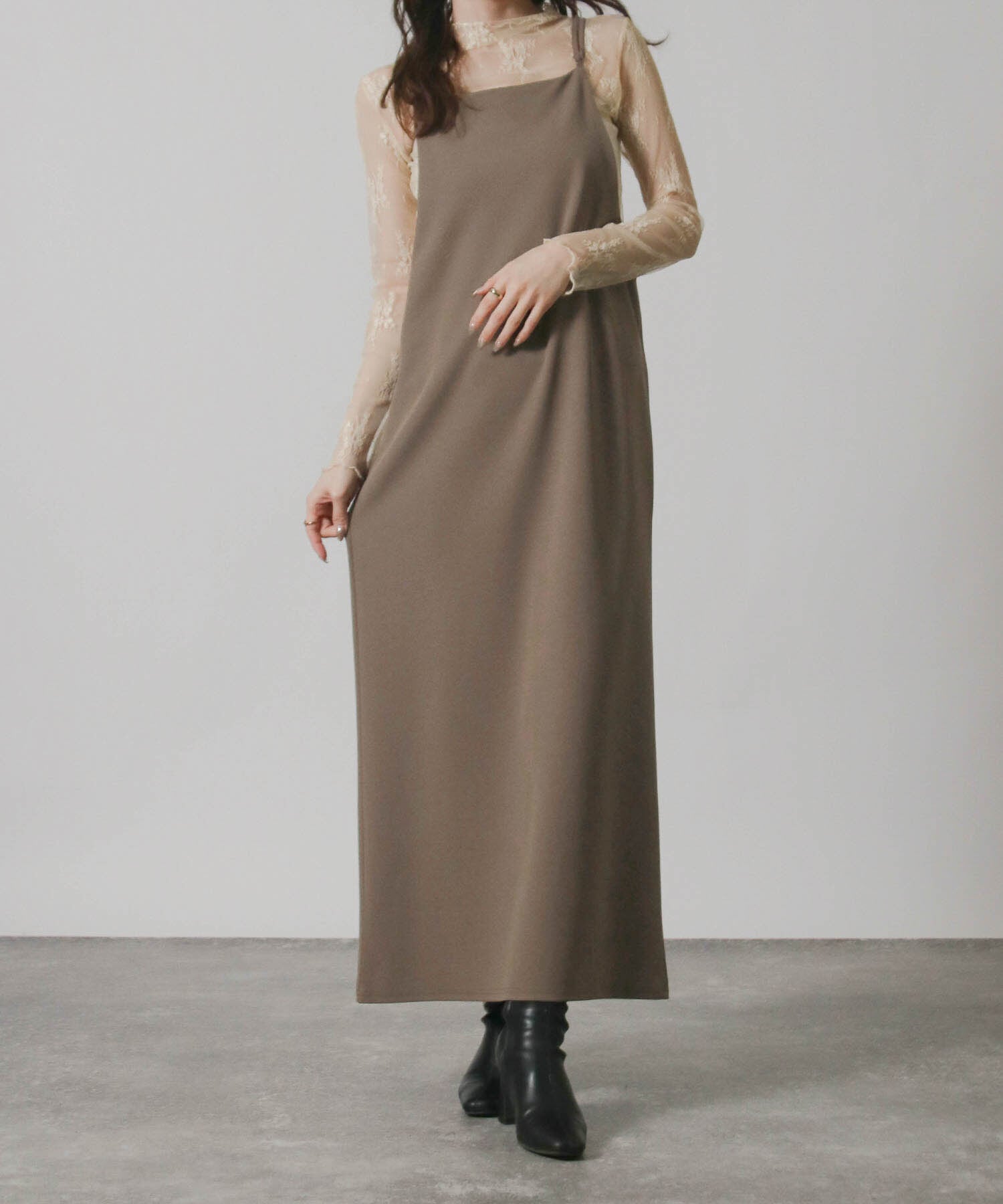 上品で洗練された印象を与えるロング丈のキャミワンピース