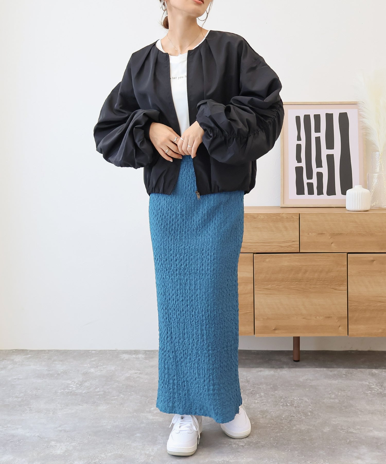 ・裾と袖口にはゴムを使用しメリハリのあるコーデに。