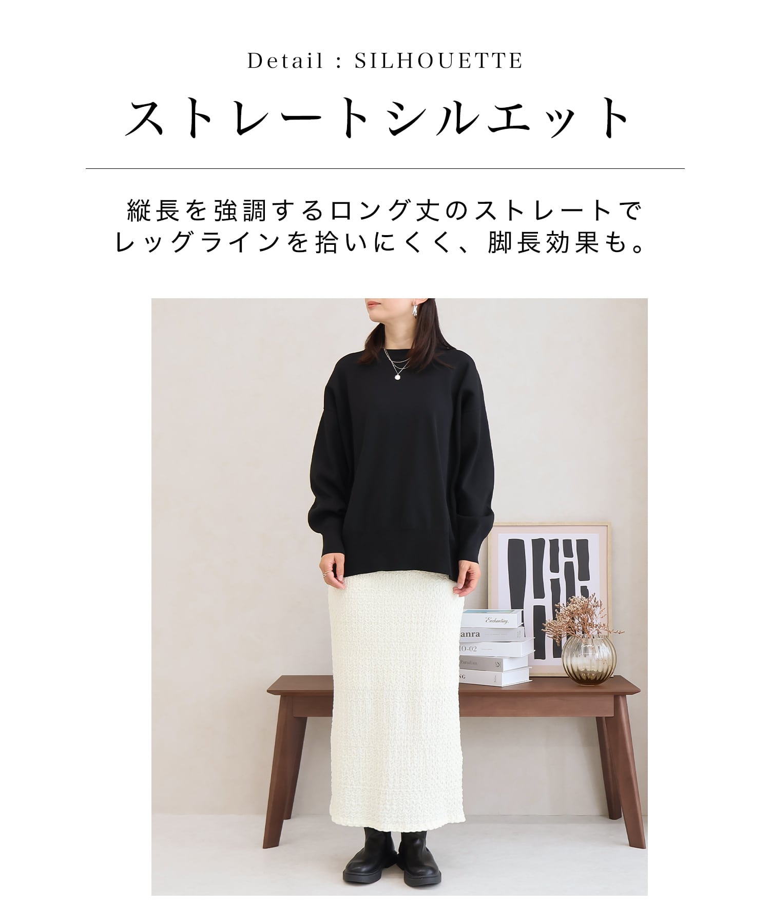 ・縦長を強調するロング丈のストレートでレッグラインを拾いにくく、脚長効果も。