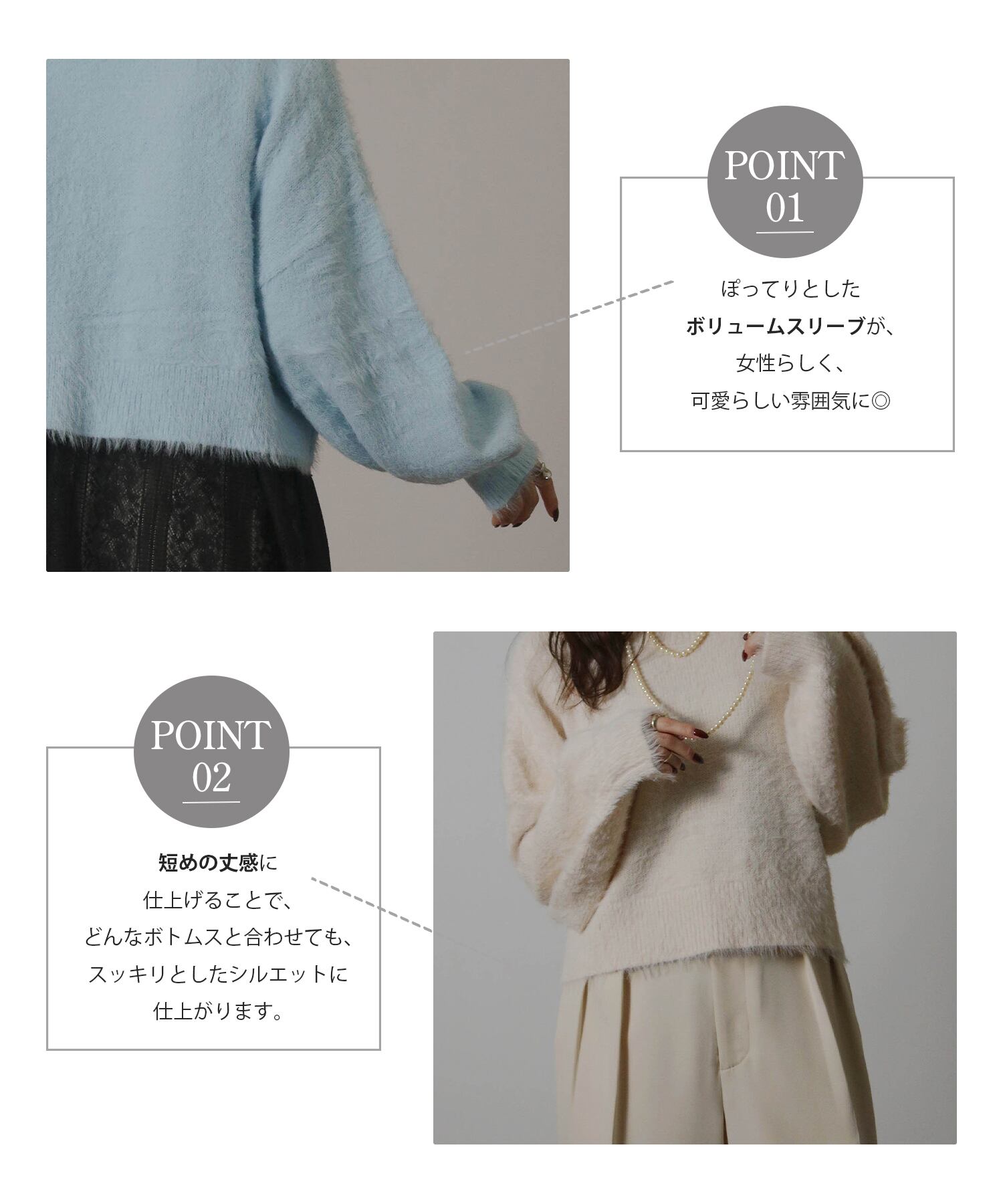 ニット セーター レディース トップス シャギーニット ショート丈 クルーネック きれいめ ボリューム袖 長袖 Mサイズ