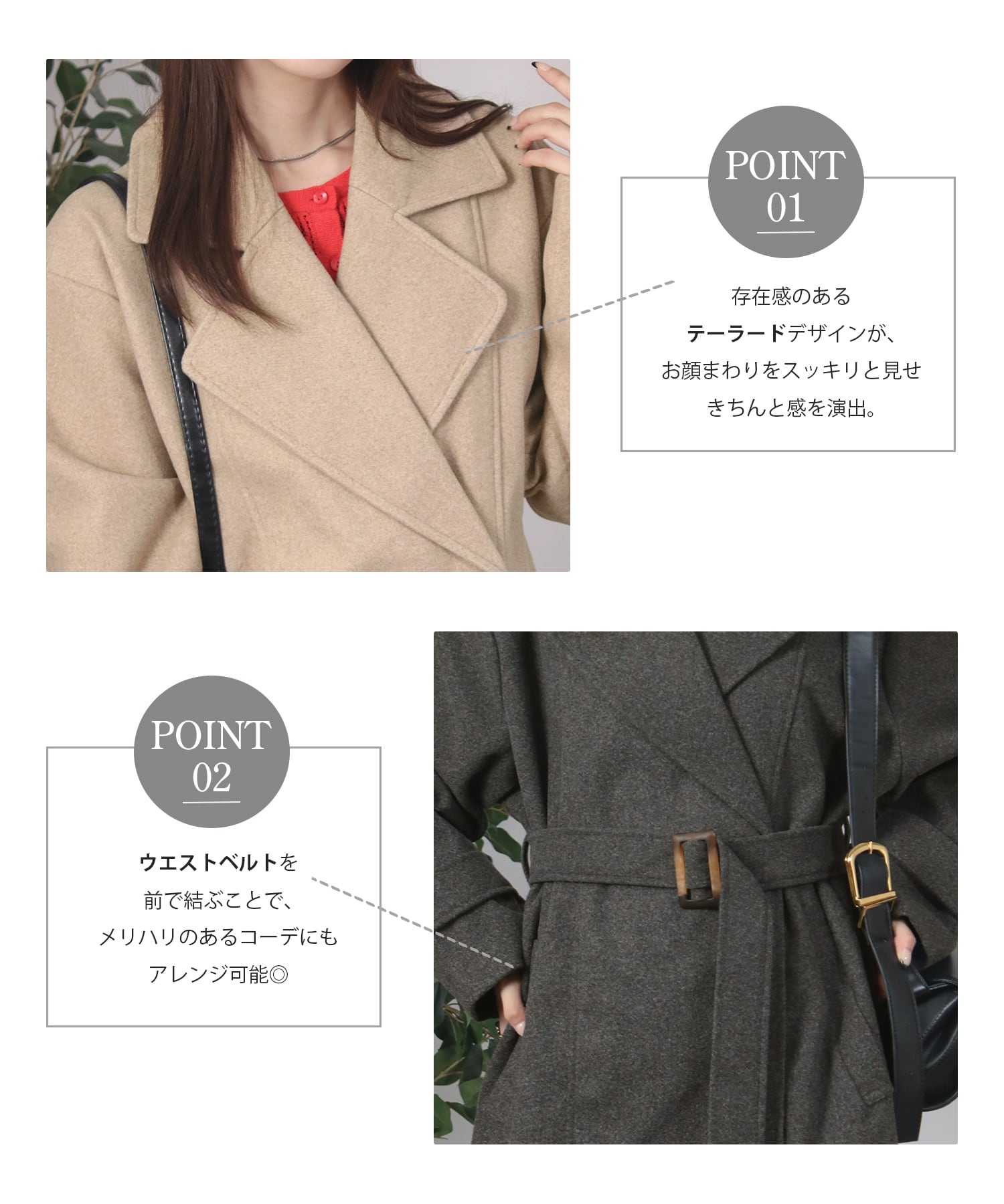 ・ウエストのベルトでお好みのシルエットにアレンジ可能。