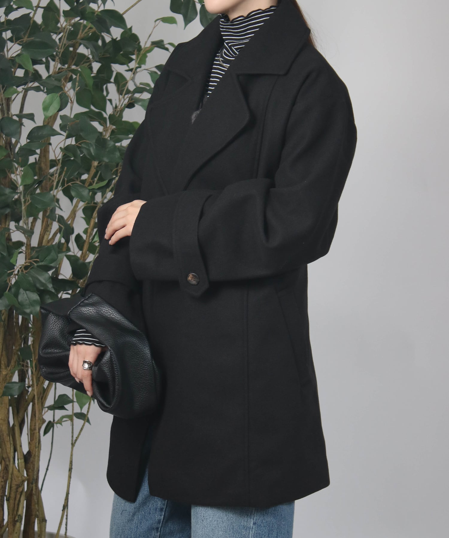 ・テーラードラペルで顔周りをスッキリと。