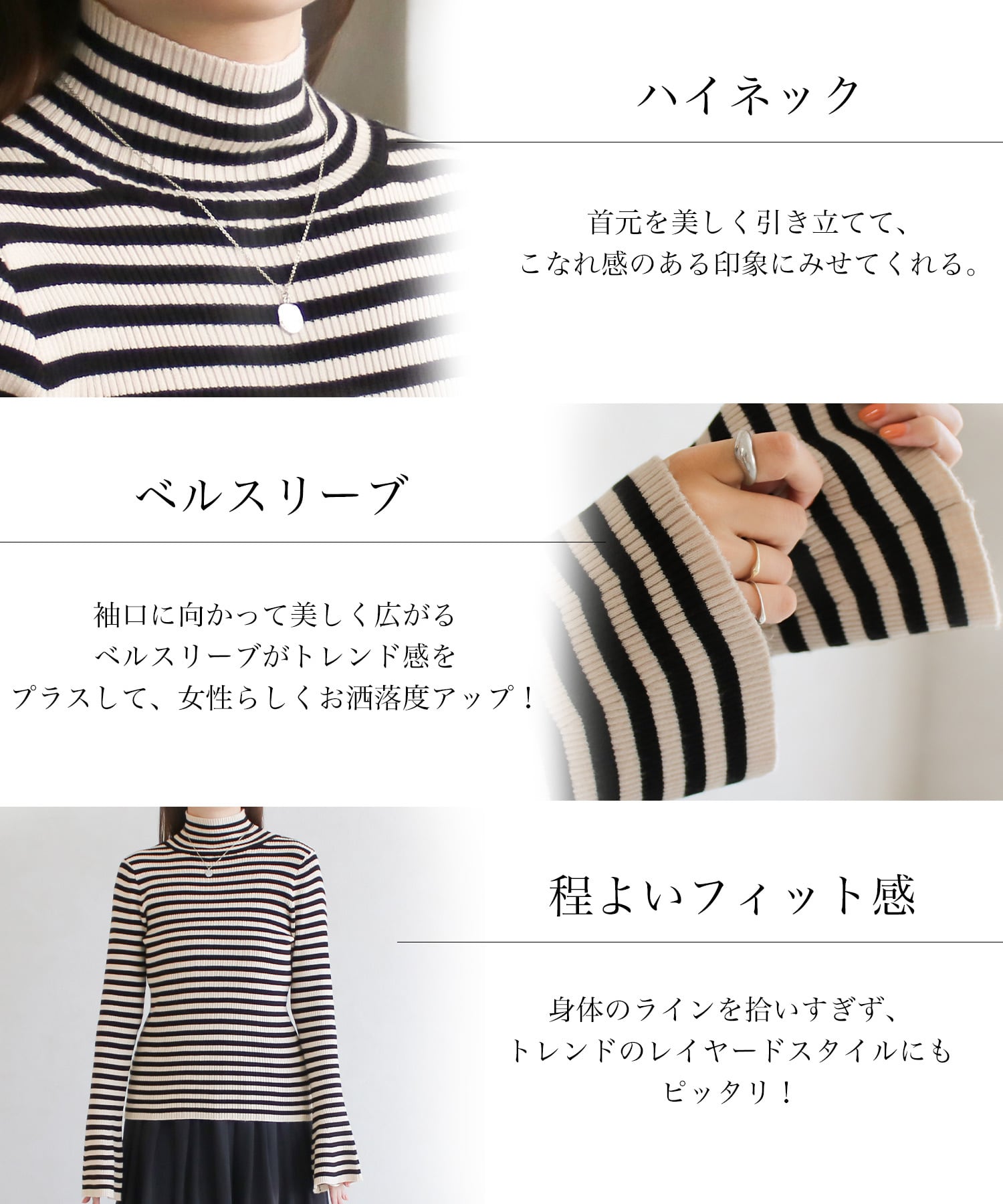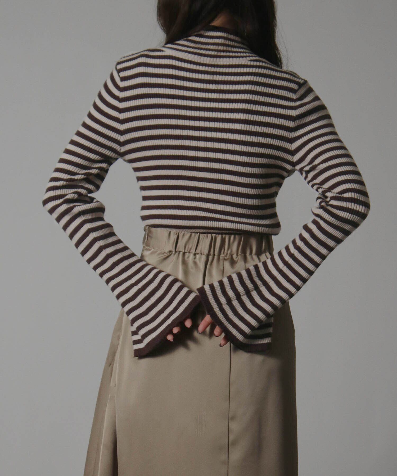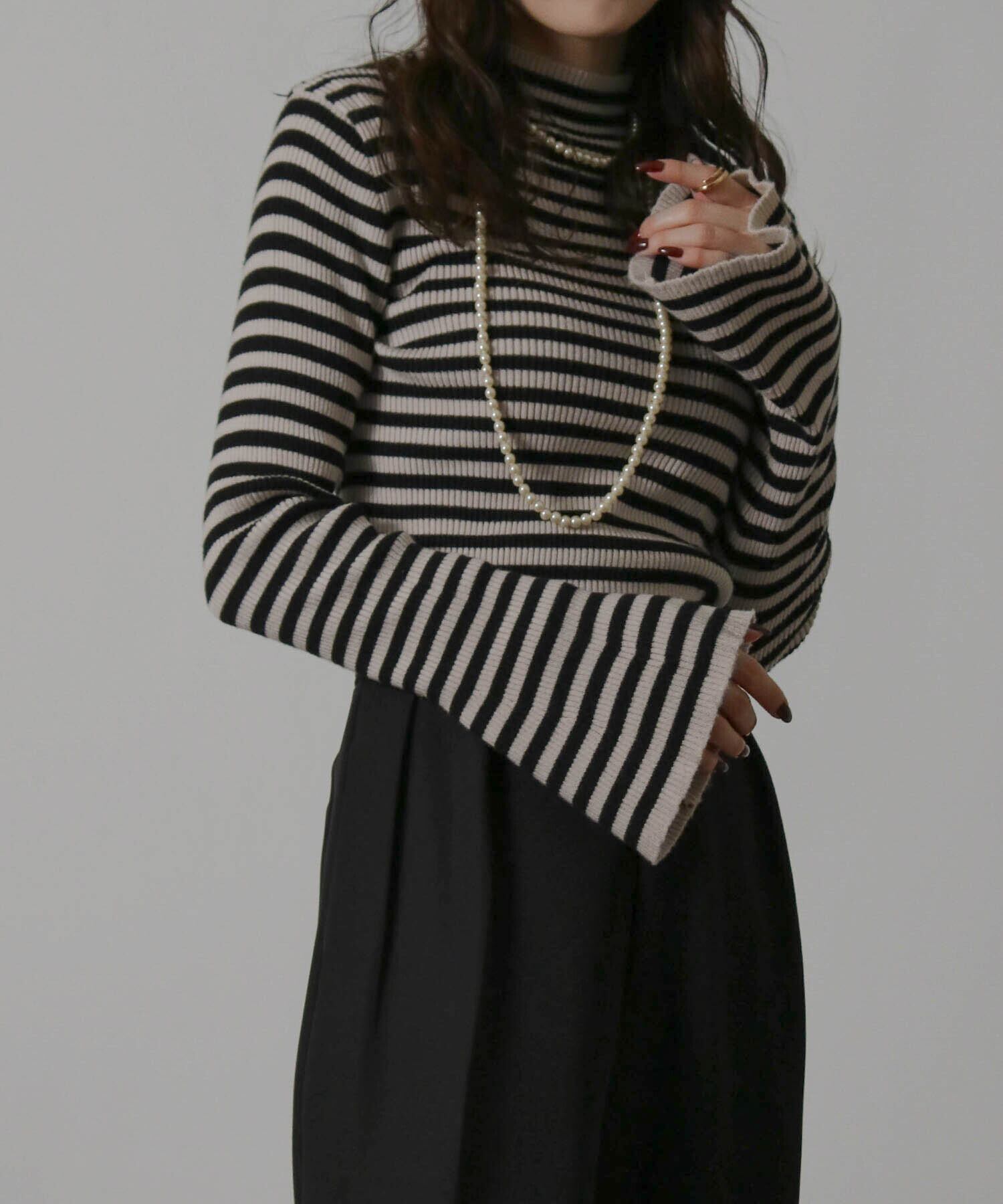 レディース トップス ニット ボーダー セーター ハイネック ベルスリーブ フレアスリーブ 袖フレア リブ ストレッチ性 伸縮性 長袖 インナー 秋冬秋服冬服