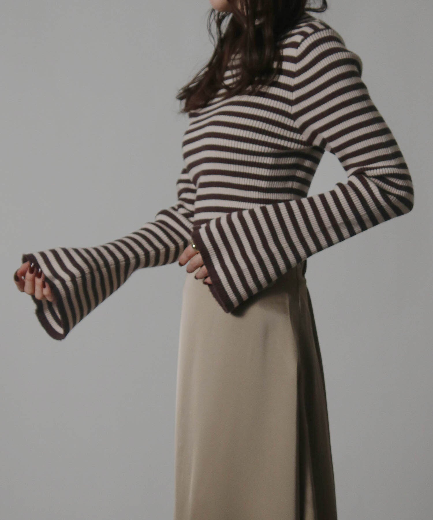 ・袖口にかけて美しく広がるフレアスリーブが上品な女性らしさを演出。