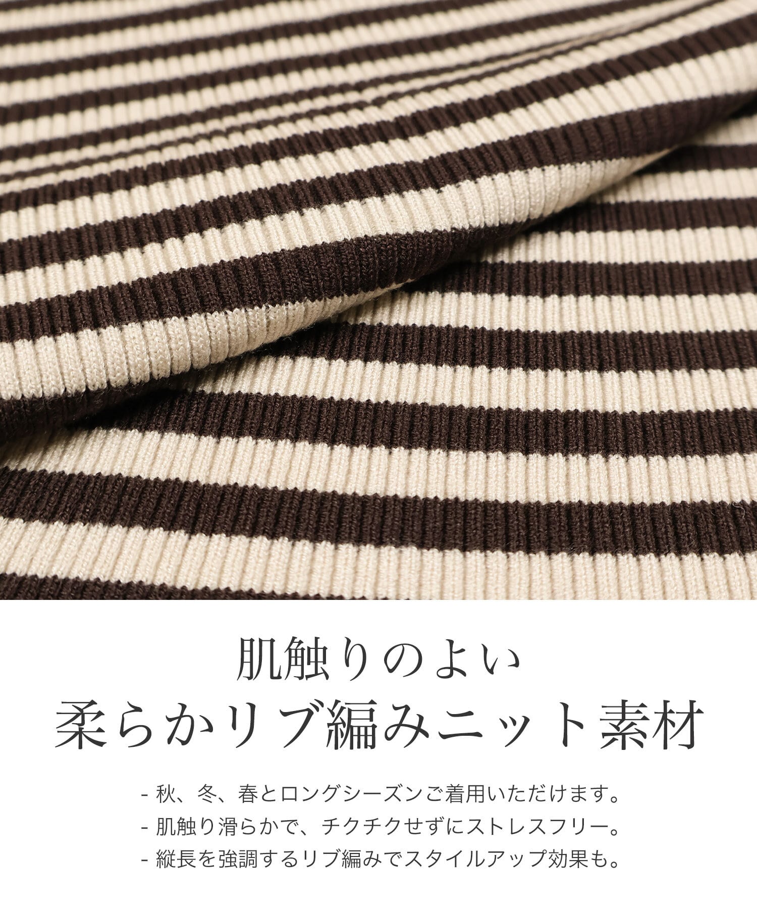 ・伸縮性たっぷりのリブ編み素材を使用し、快適な着用感。