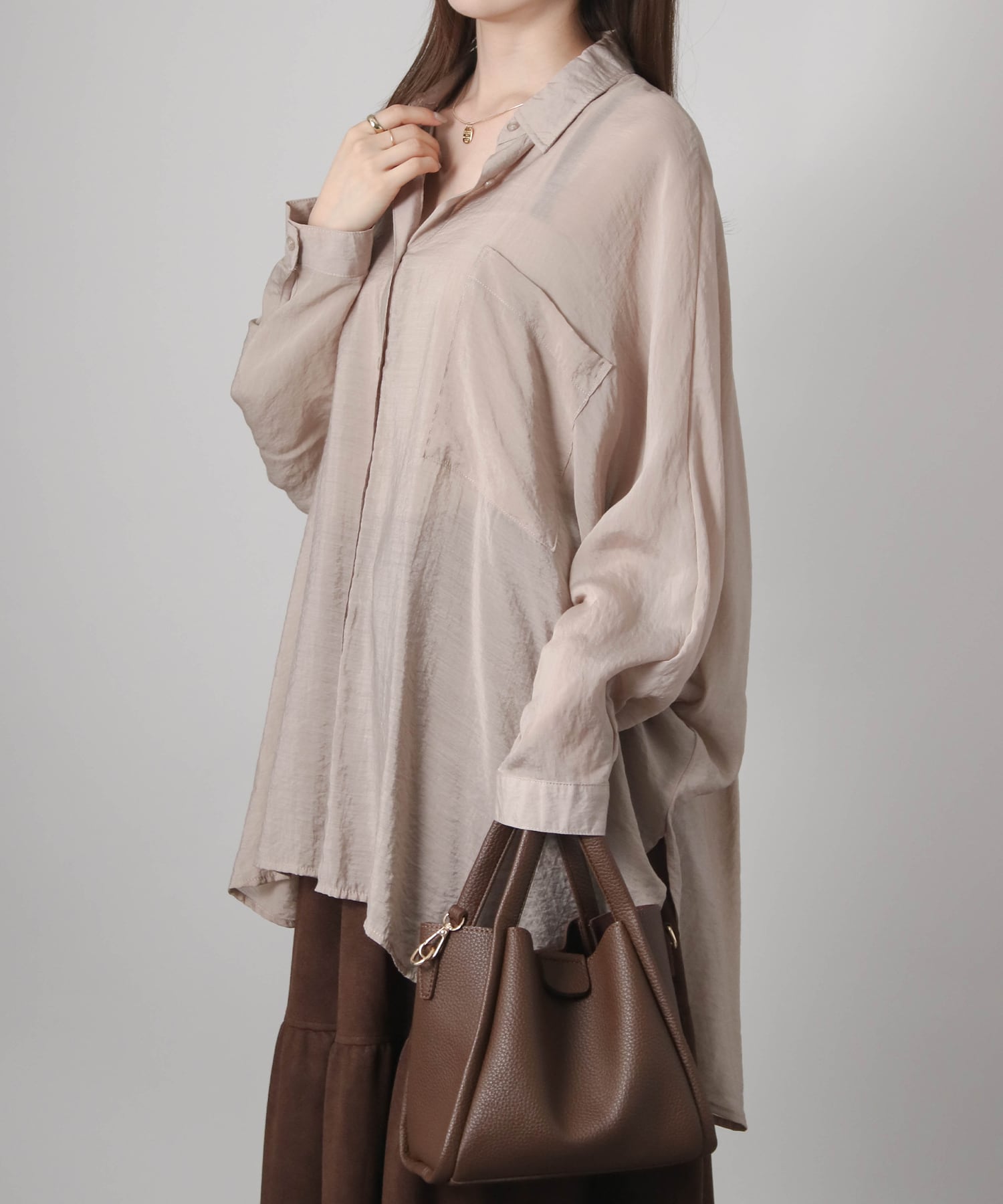 レディース シャツ ブラウス ドルマン トップス シアー 羽織り オーバーサイズ ポケット 前後差スリット 長袖 シャツカラー 秋冬 おしゃれ 秋服