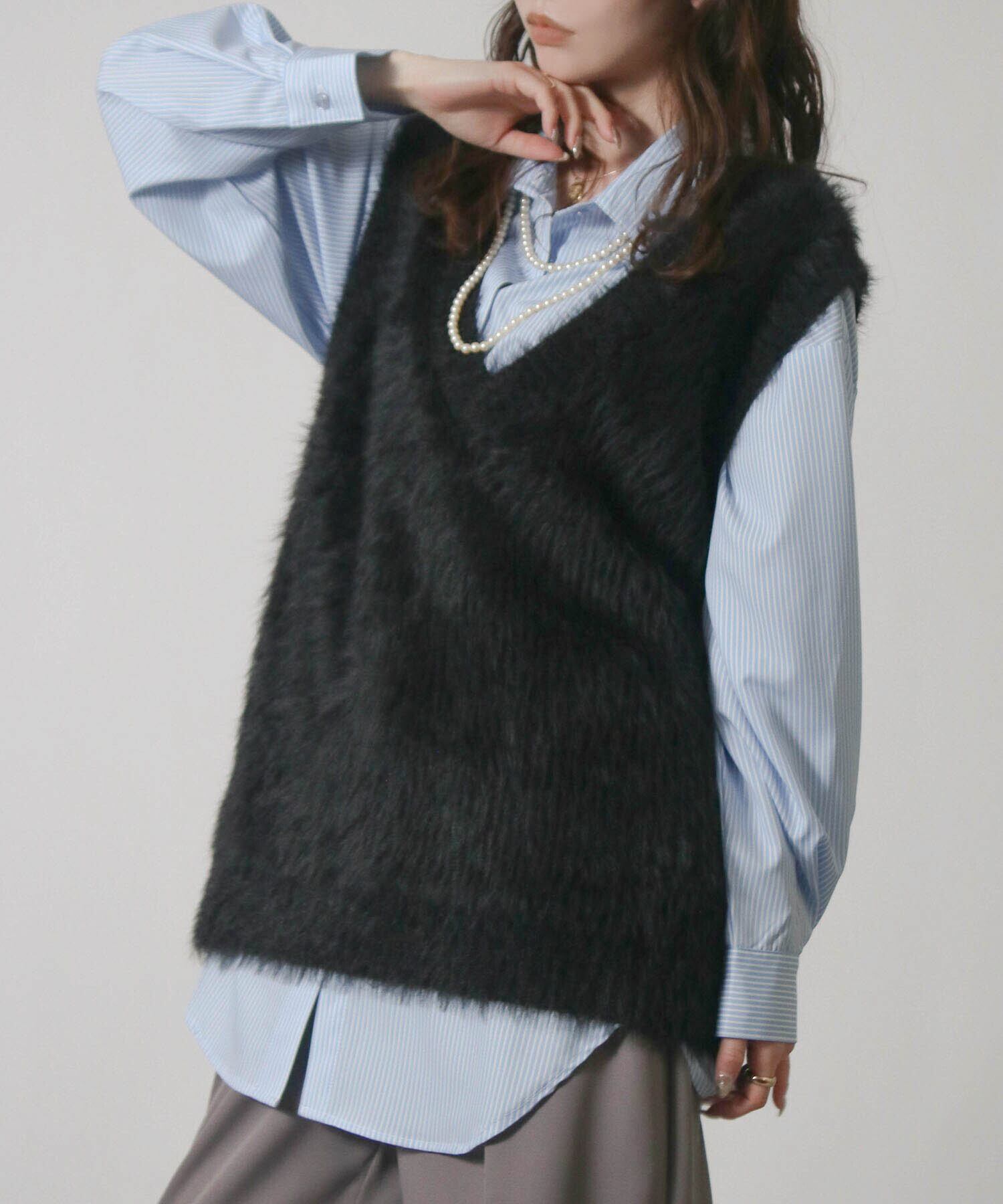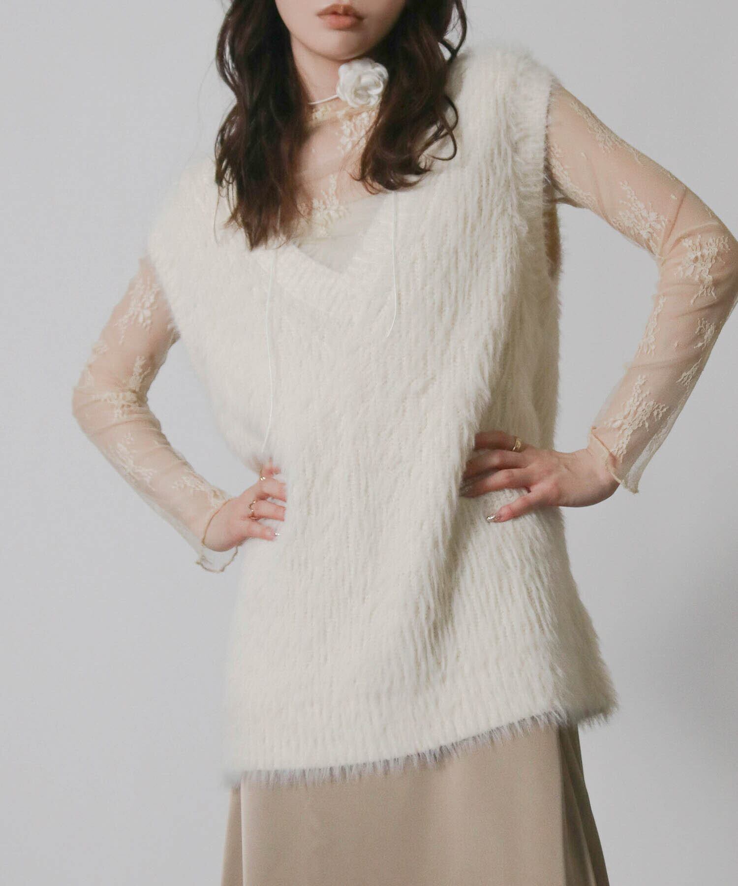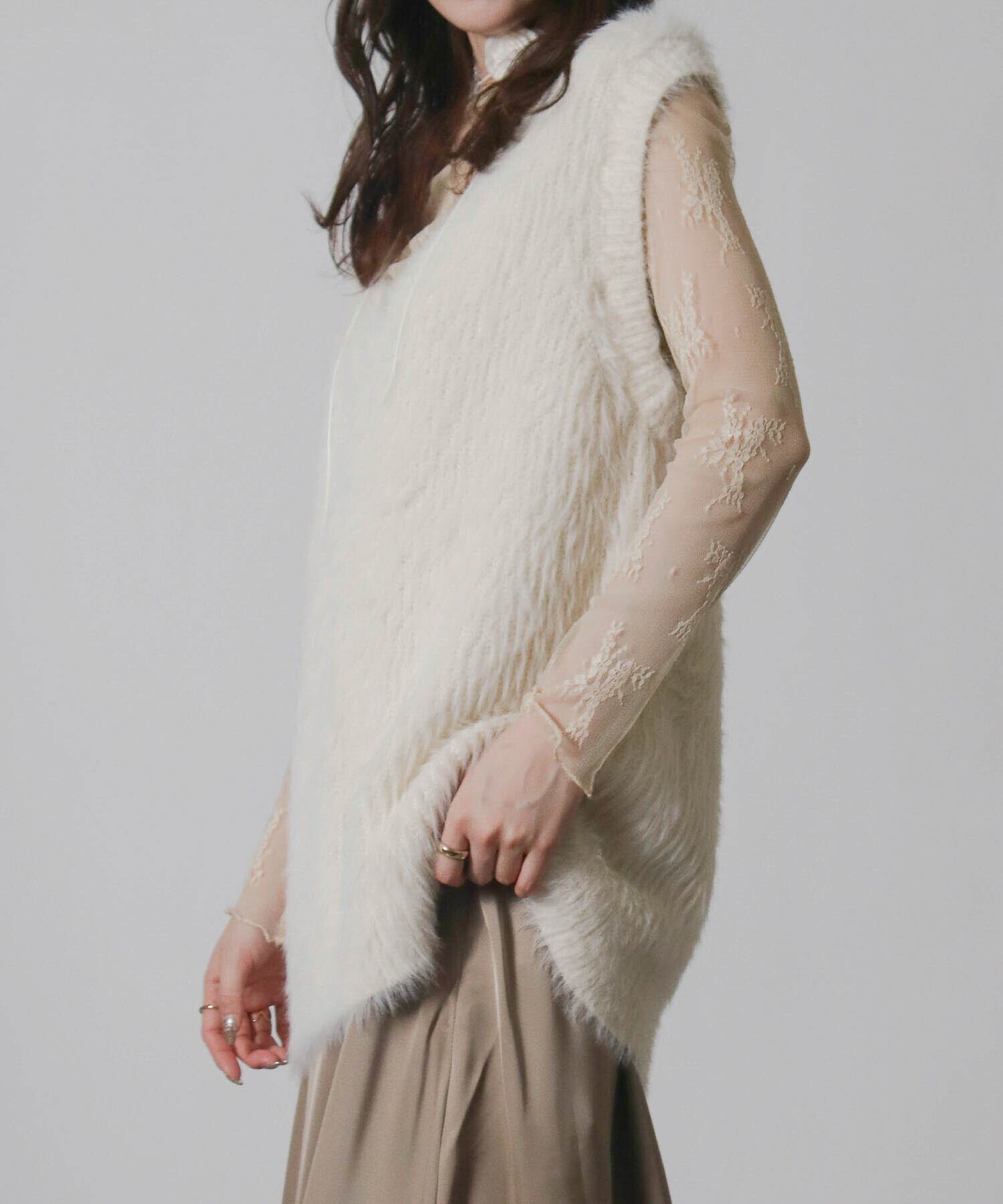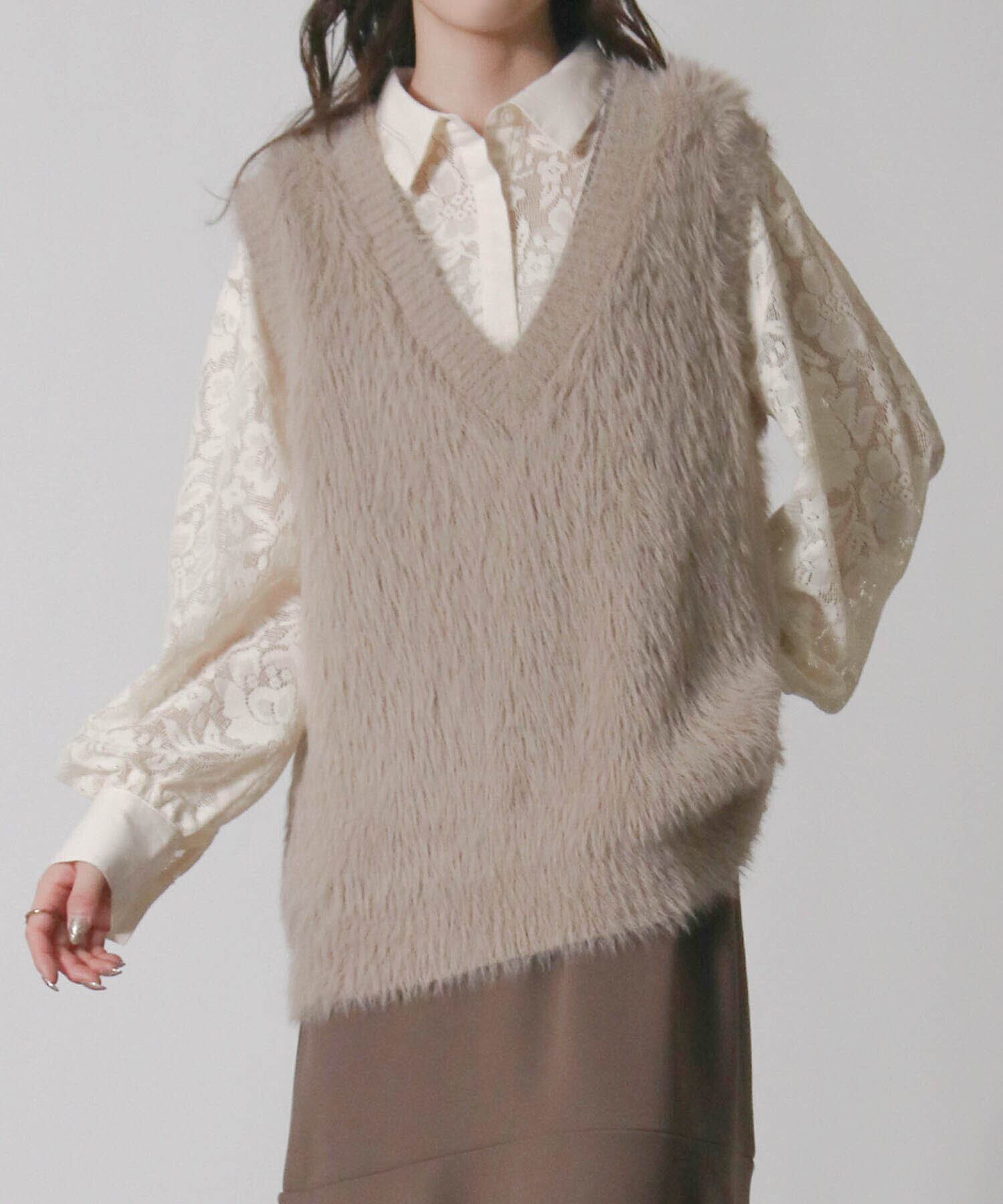・毛足の長い素材がトレンド感を演出するニットベスト。