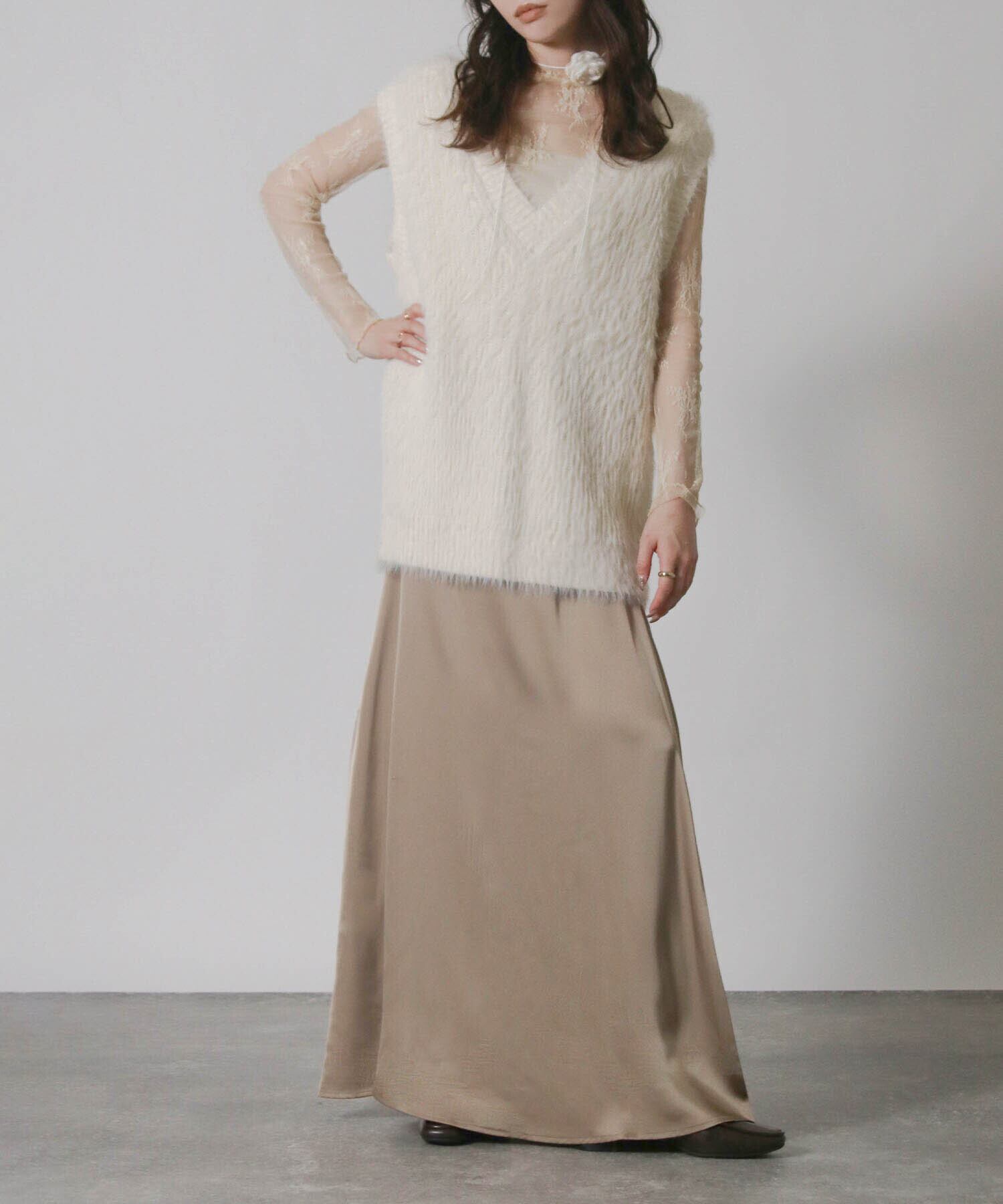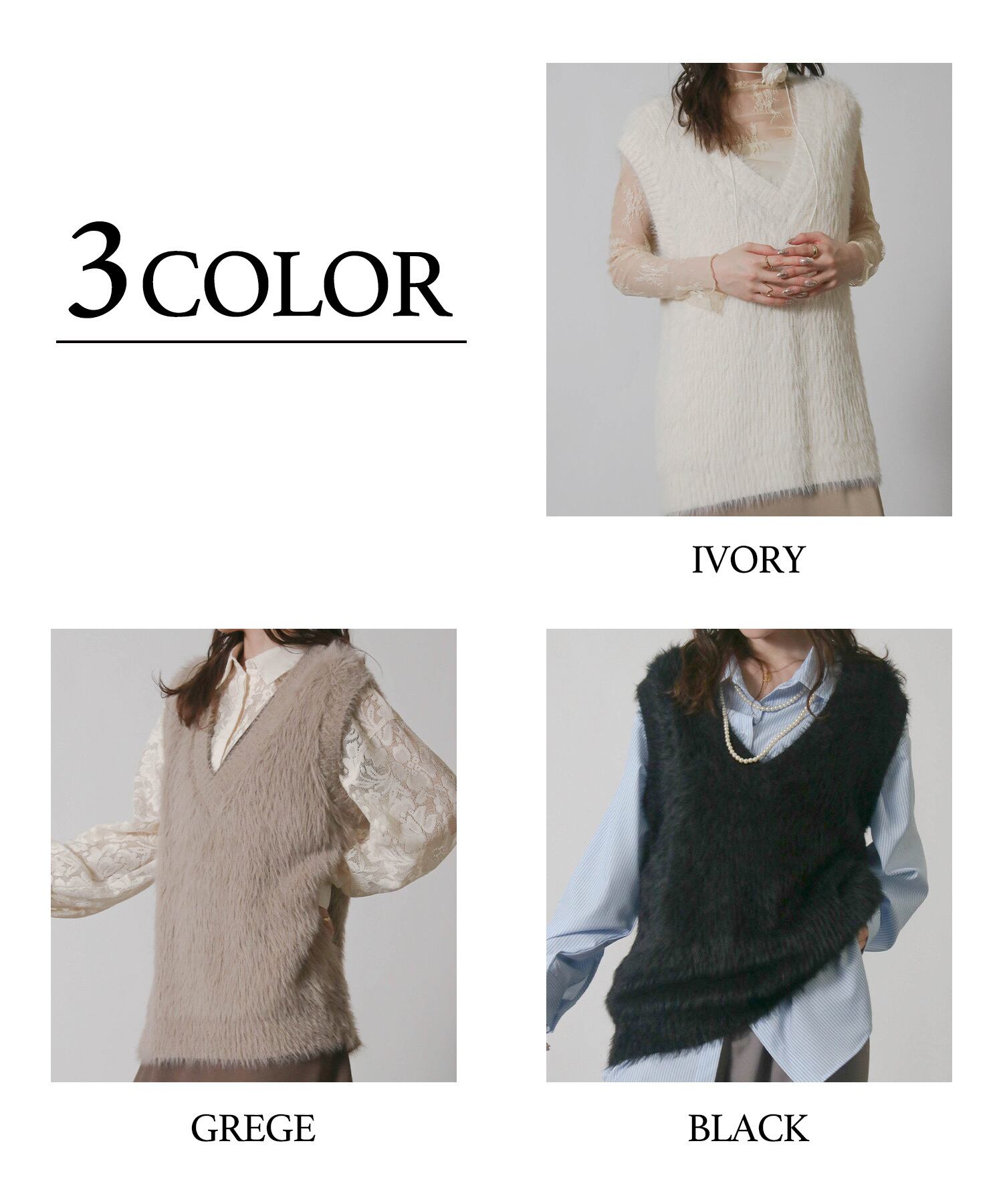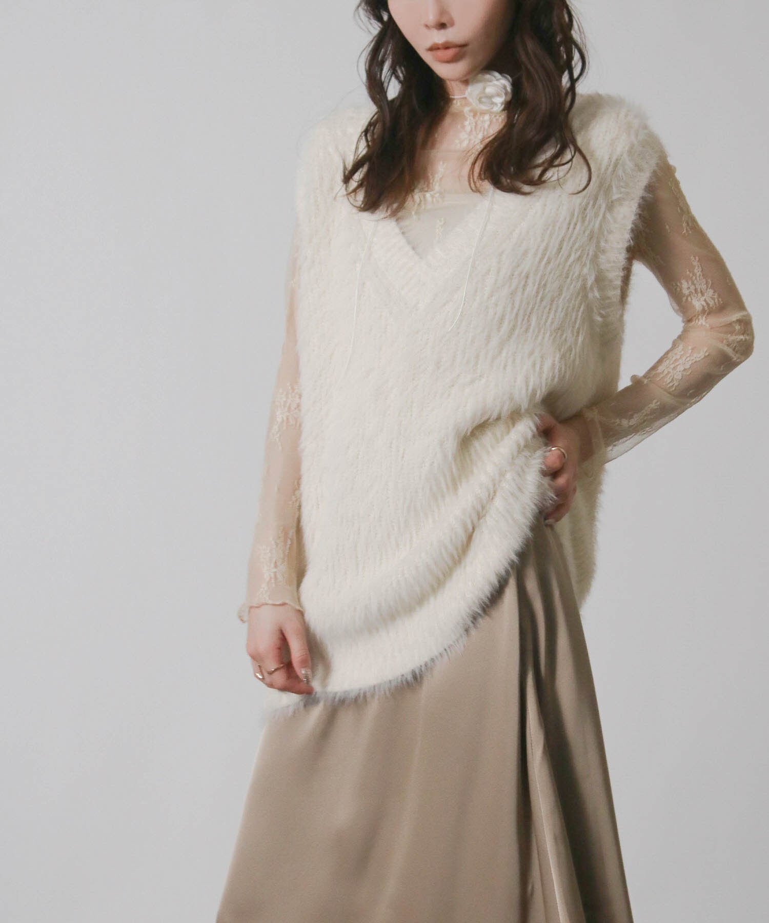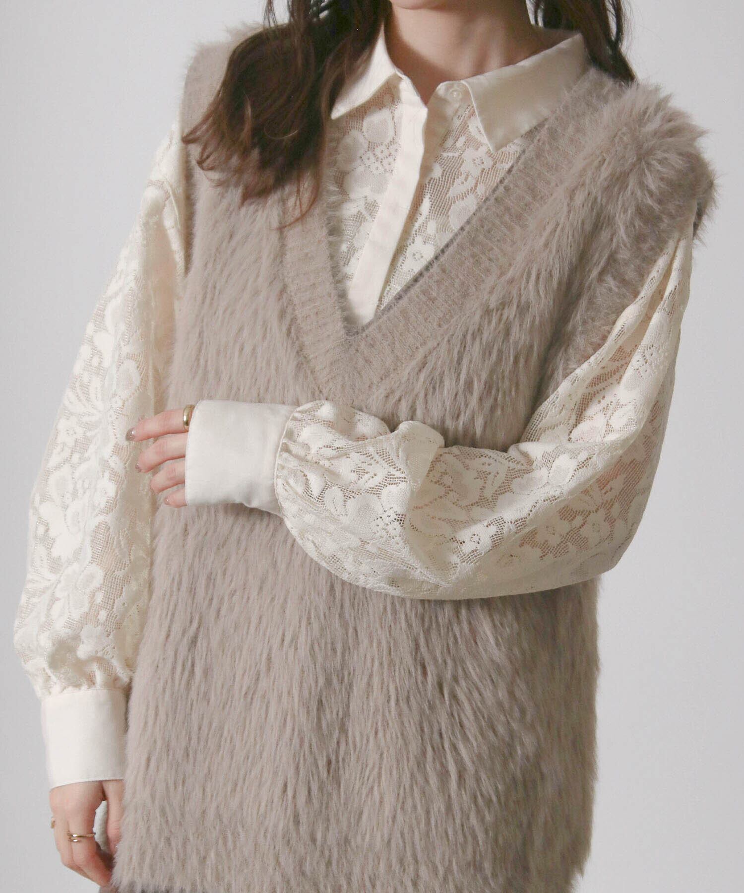 ・毛足の長い素材がトレンド感を演出するニットベスト。