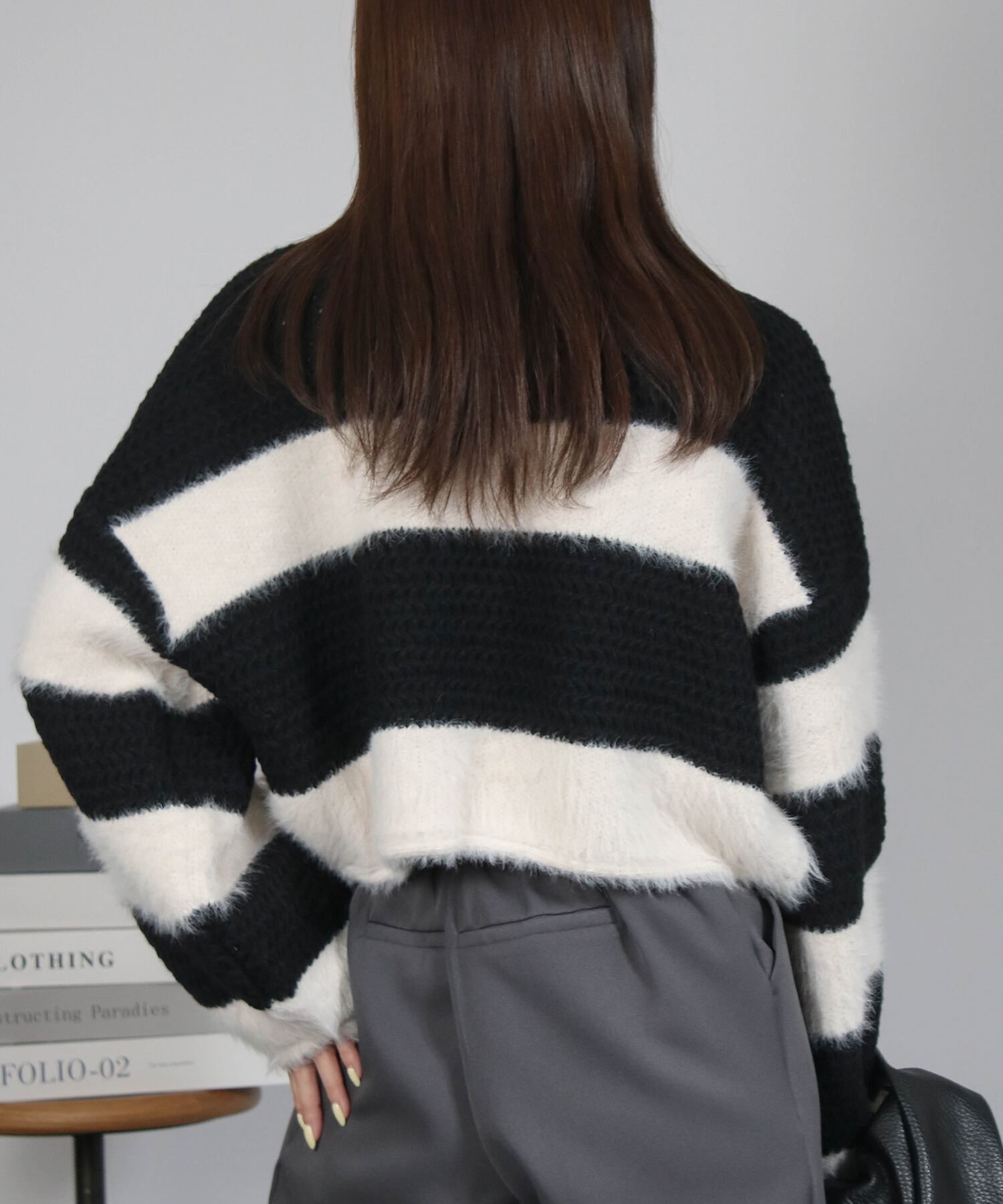 レディース トップス ボーダーシャギーニット セーター 透かし編み ボリュームスリーブ ショート丈 ぽわん袖 Uネック ふわふわ ゆったり プルオーバー ゆるニット 長袖 秋冬秋服冬服