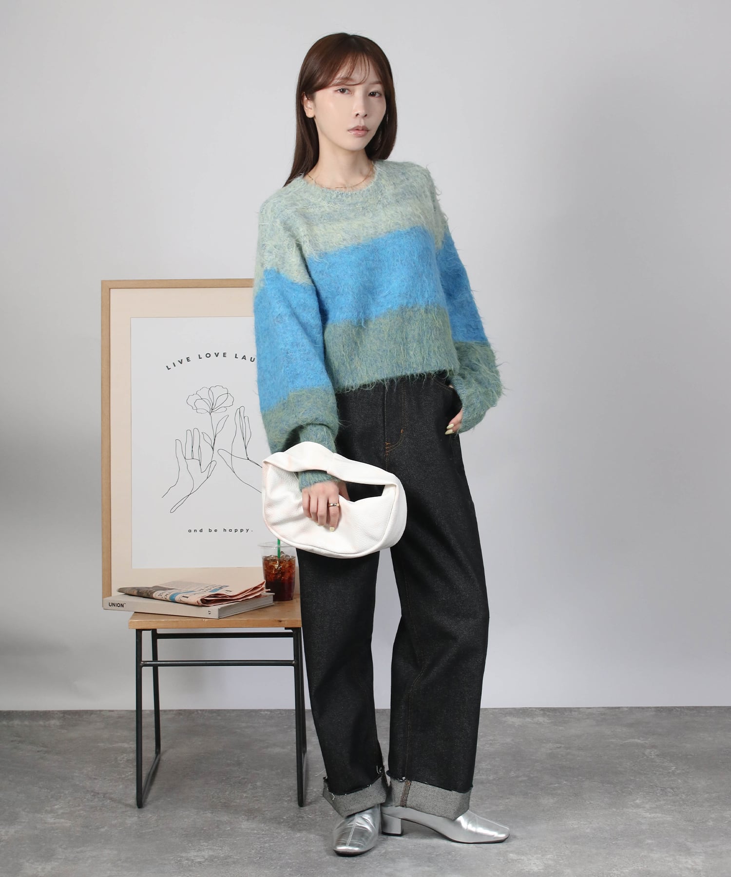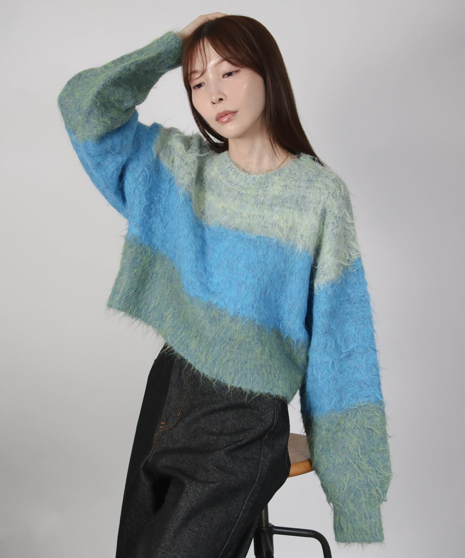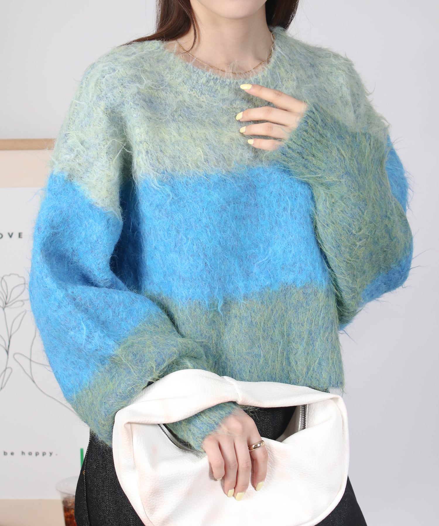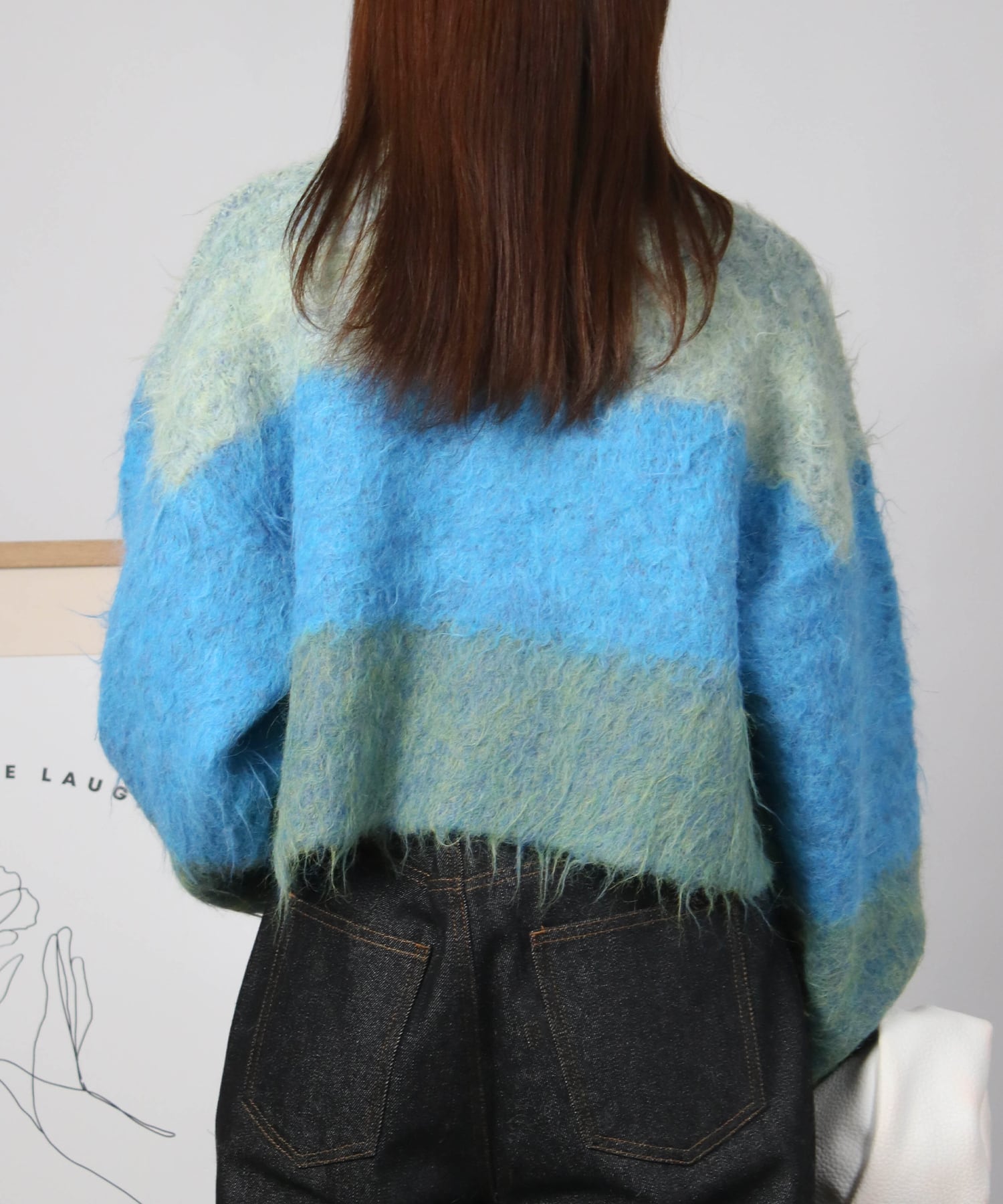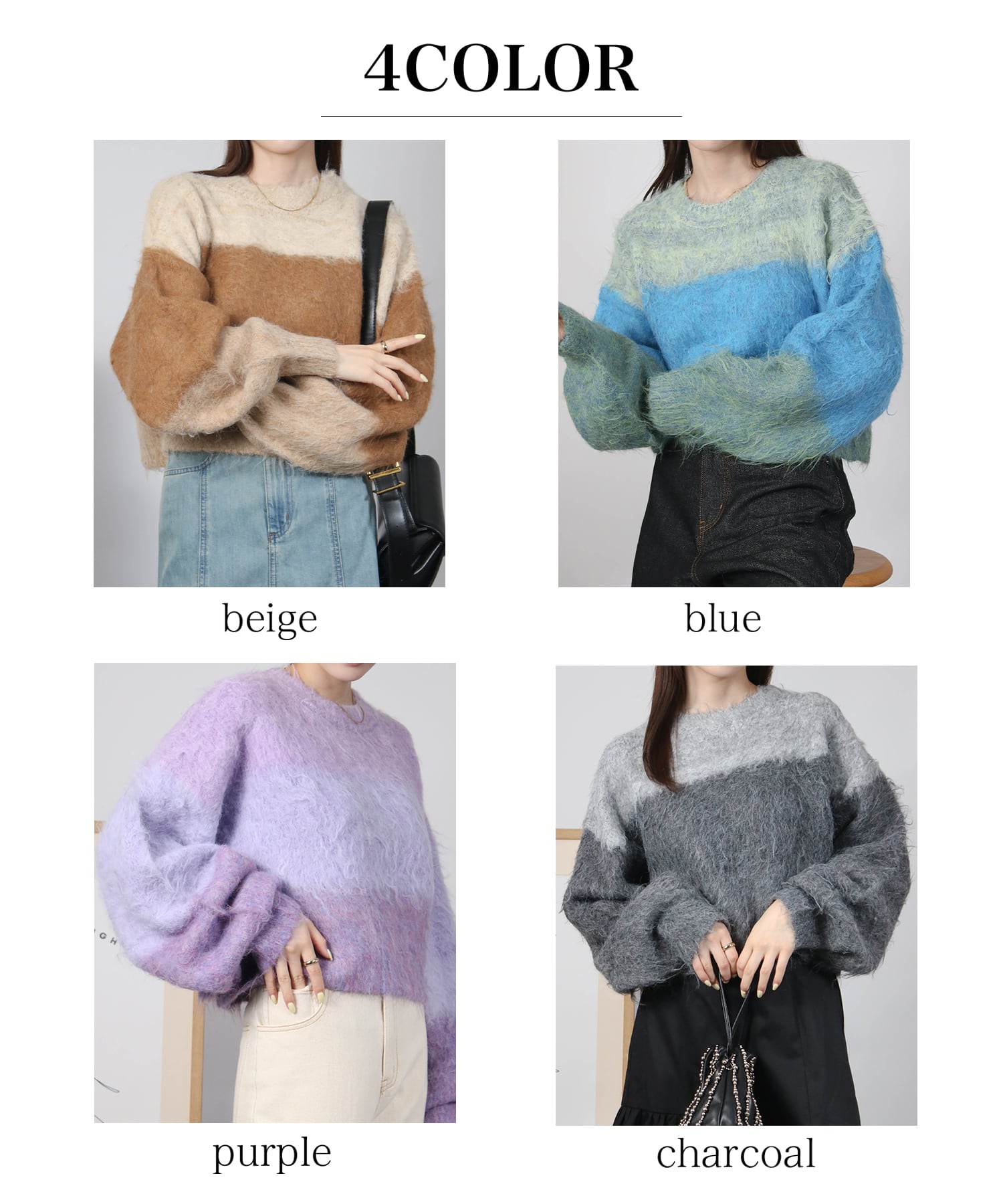レディース トップス 起毛シャギーニット セーター 配色 ボーダー調 ボリュームスリーブ ショート丈 ぽわん袖 Uネック ふわふわ ゆったり プルオーバー ゆるニット 長袖