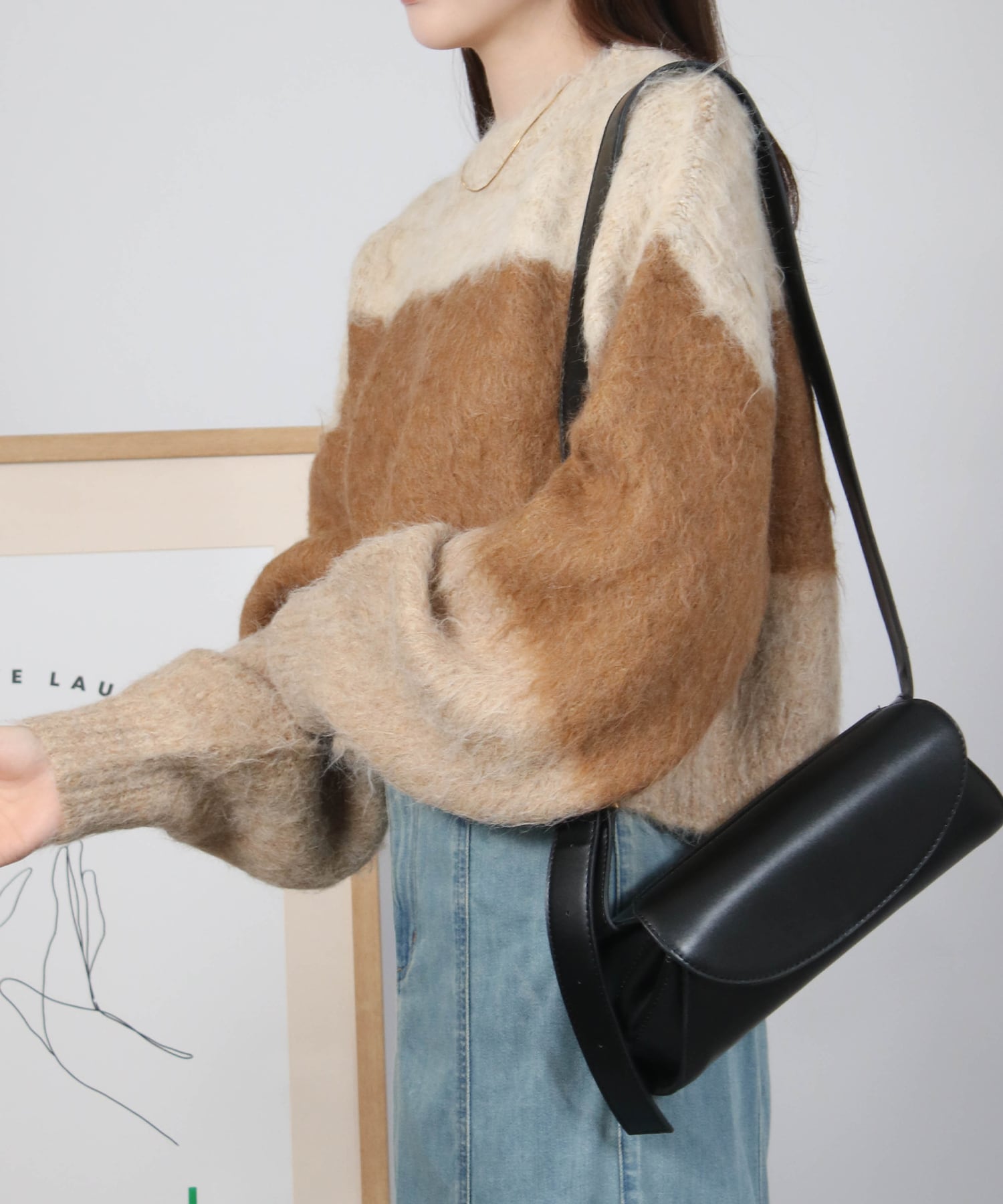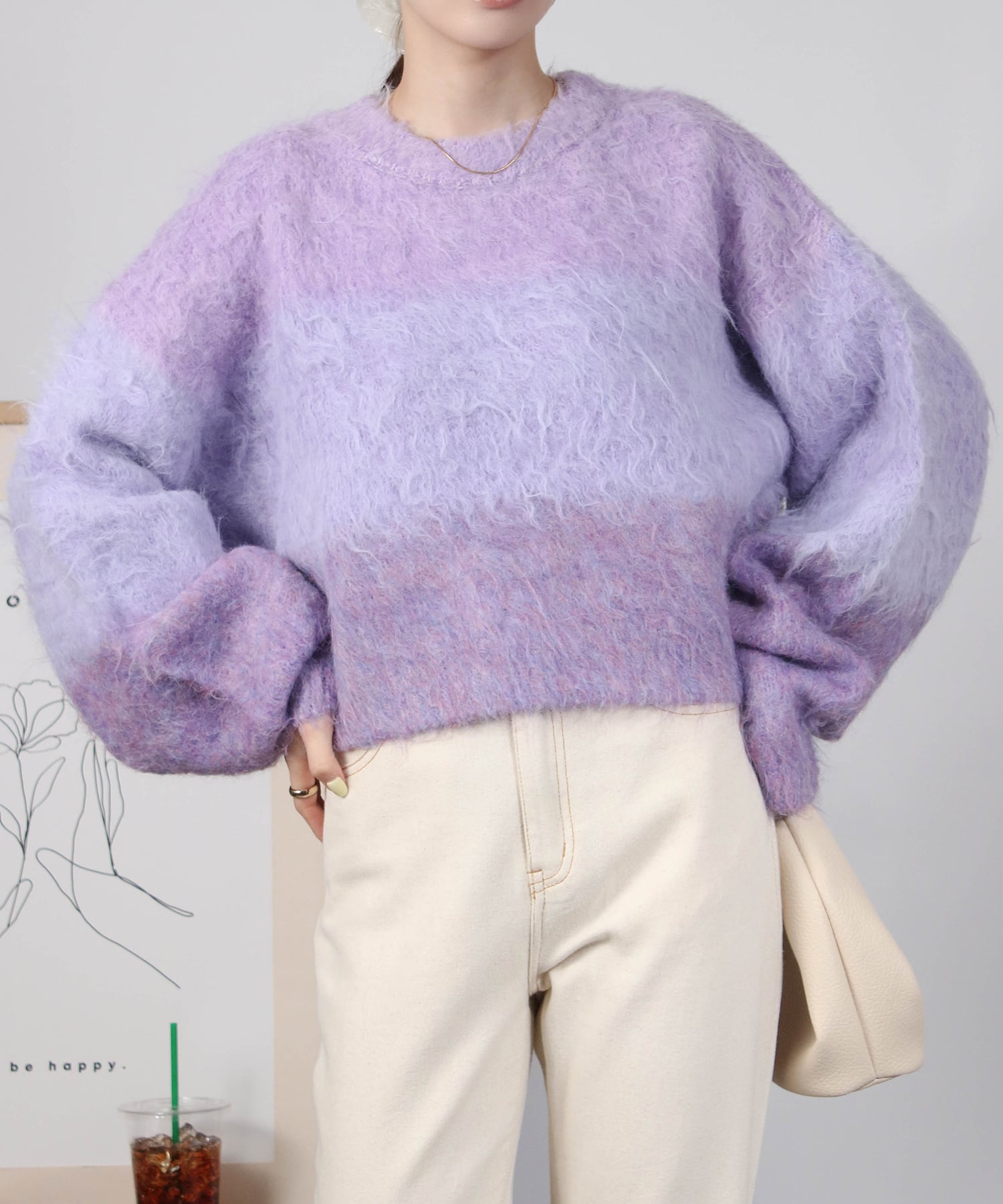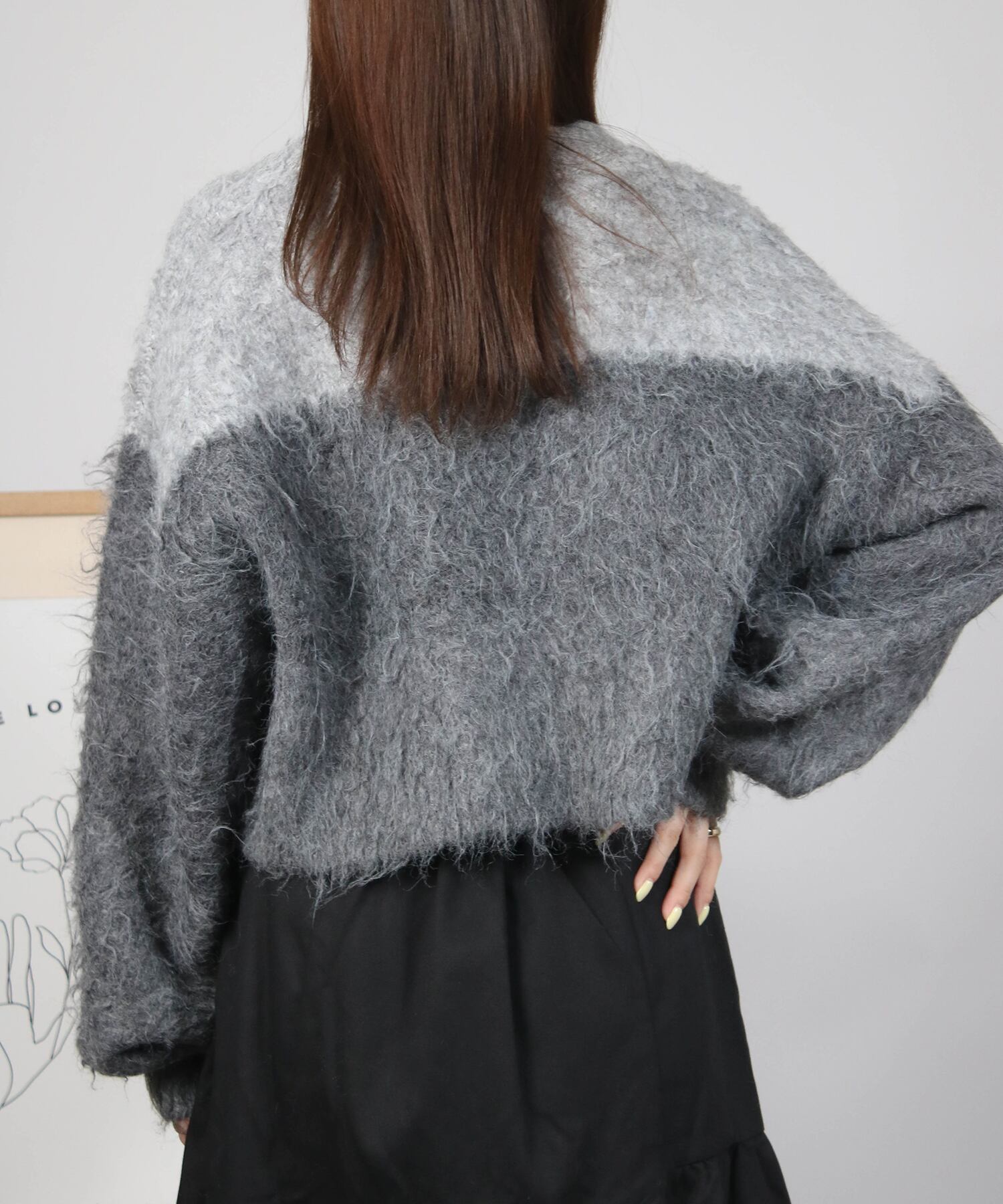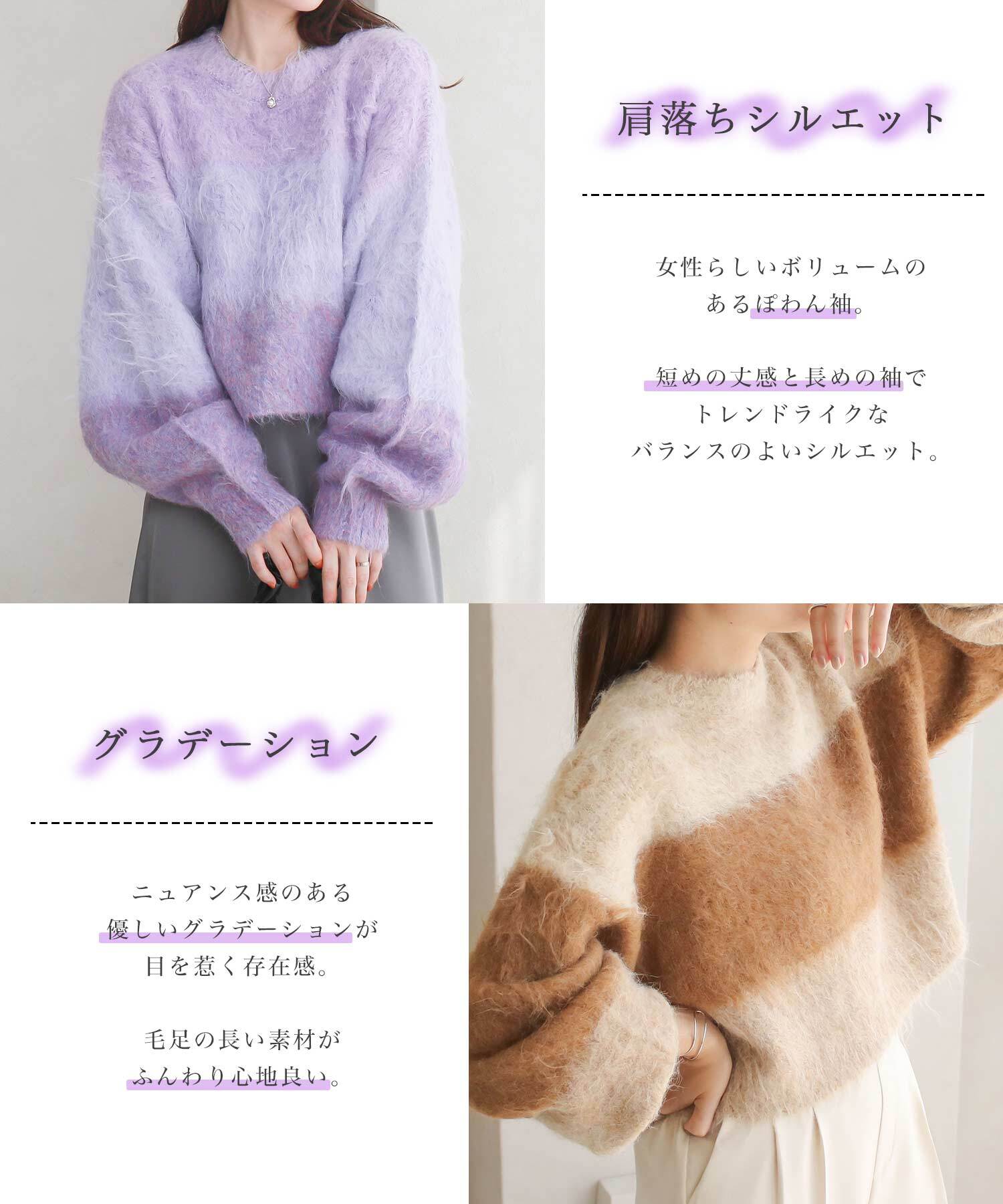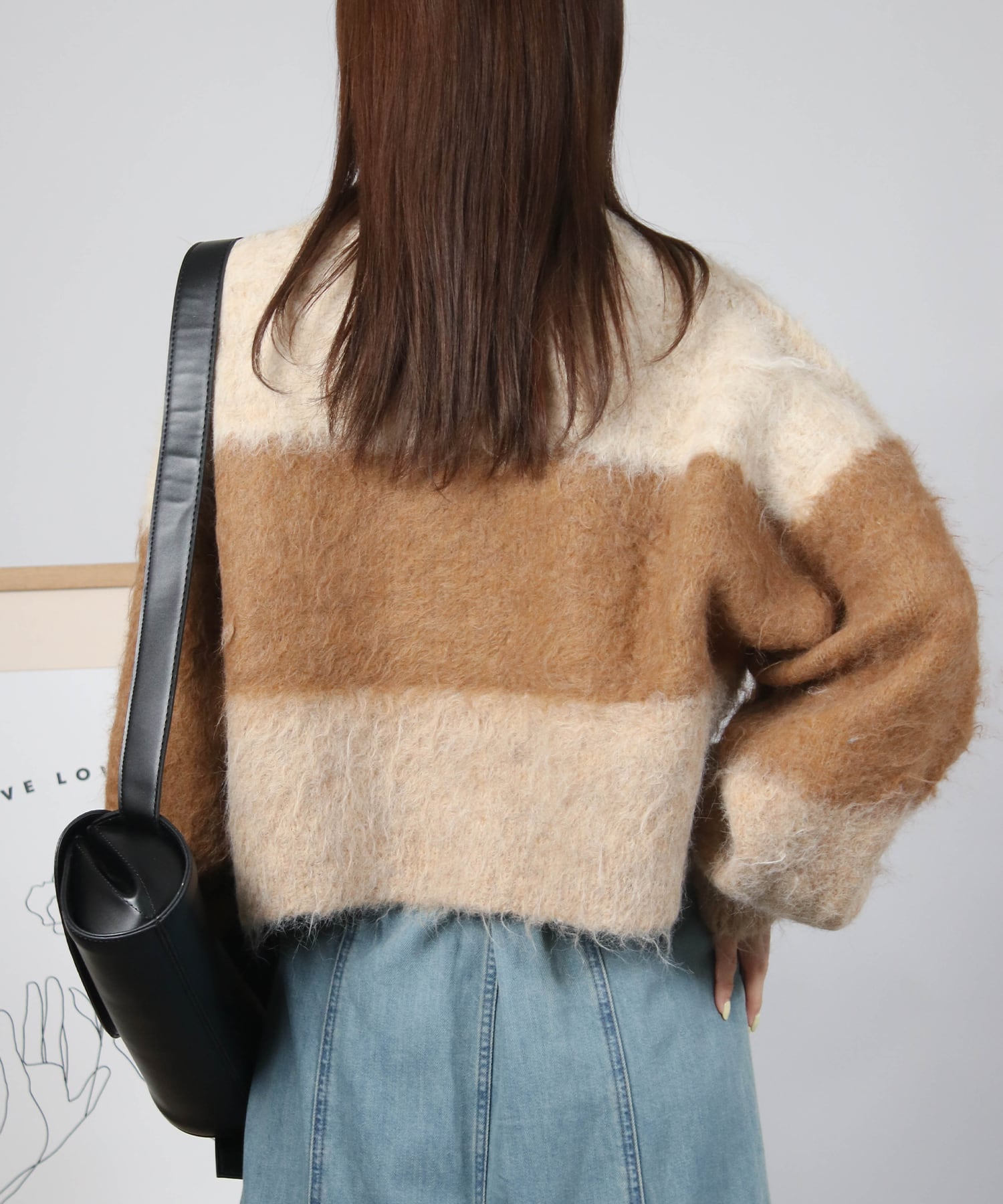 レディース トップス 起毛シャギーニット セーター 配色 ボーダー調 ボリュームスリーブ ショート丈 ぽわん袖 Uネック ふわふわ ゆったり プルオーバー ゆるニット 長袖